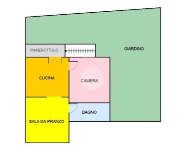 L' appartamento posto al piano terra é composto da: ingresso, cucina, soggiorno-pranzo, camera, bagn ...