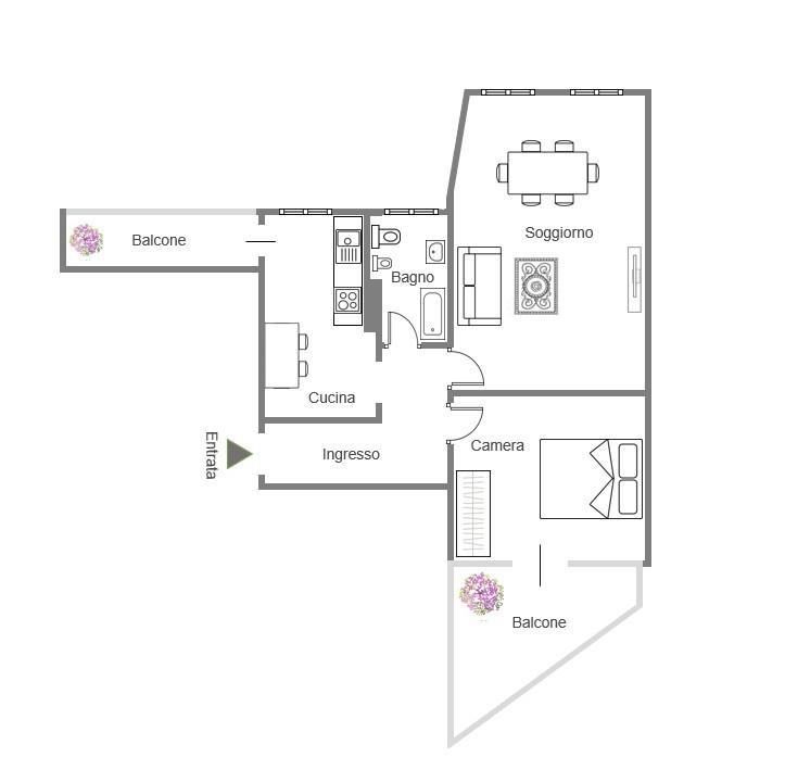 L'appartamento, che si presenta in buono stato interno, si compone da un ingresso, un ampio soggiorno, una cucina abitabile con accesso diretto al primo balcone, una camera matrimoniale dotata di un secondo balcone e un bagno finestrato completo di vasca.