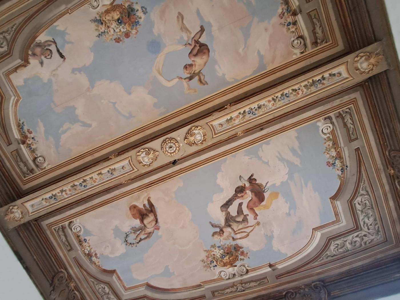 Ha pavimenti in parquet ed i soffitti decorati con tele dipinte.