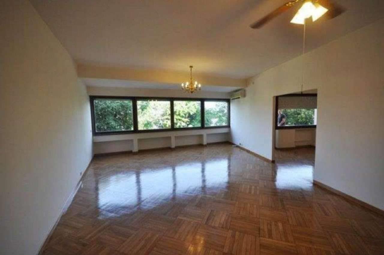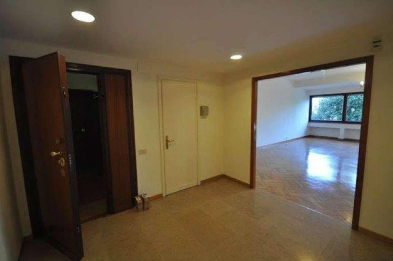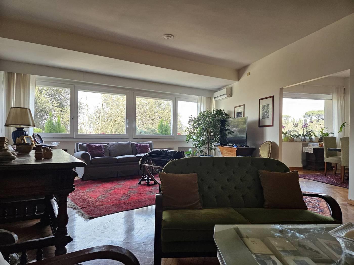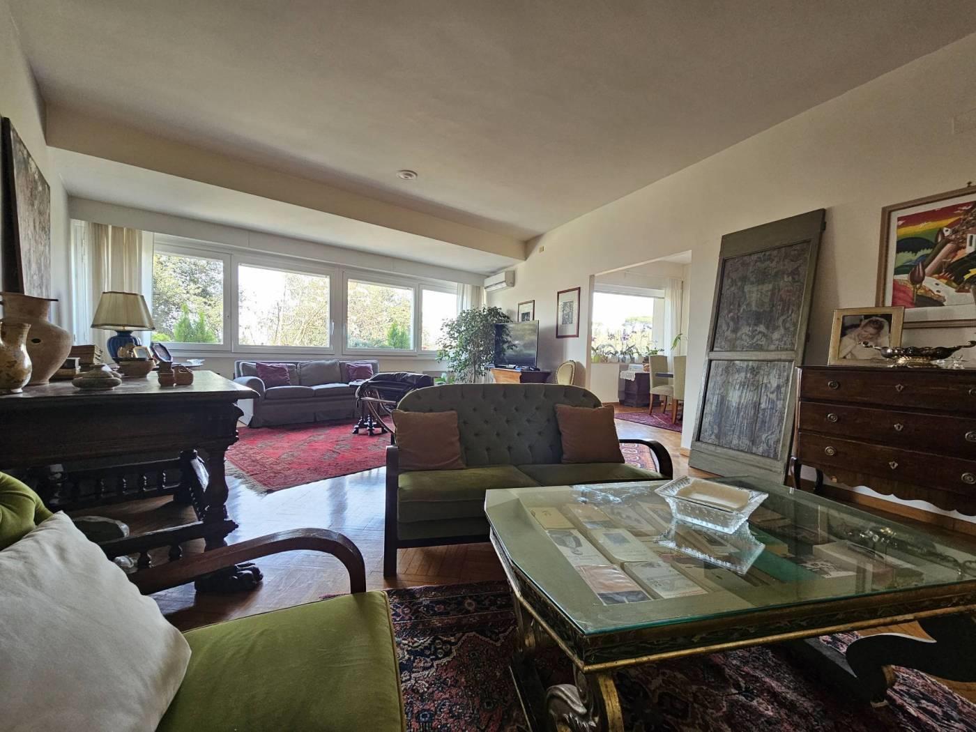 L’appartamento è così composto: ingresso con vestiaire, salone con ampie vetrate sul verde, pranzo con porta finestra su un piccolo terrazzino, tre camere da letto, due bagni (uno con vasca ed uno con doccia piccolino), cucina abitabile, lavanderia con bagnetto (al limite può diventare una cameretta di servizio).