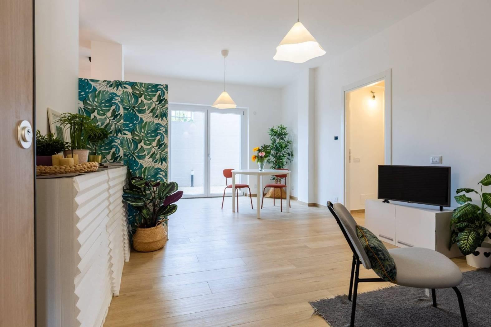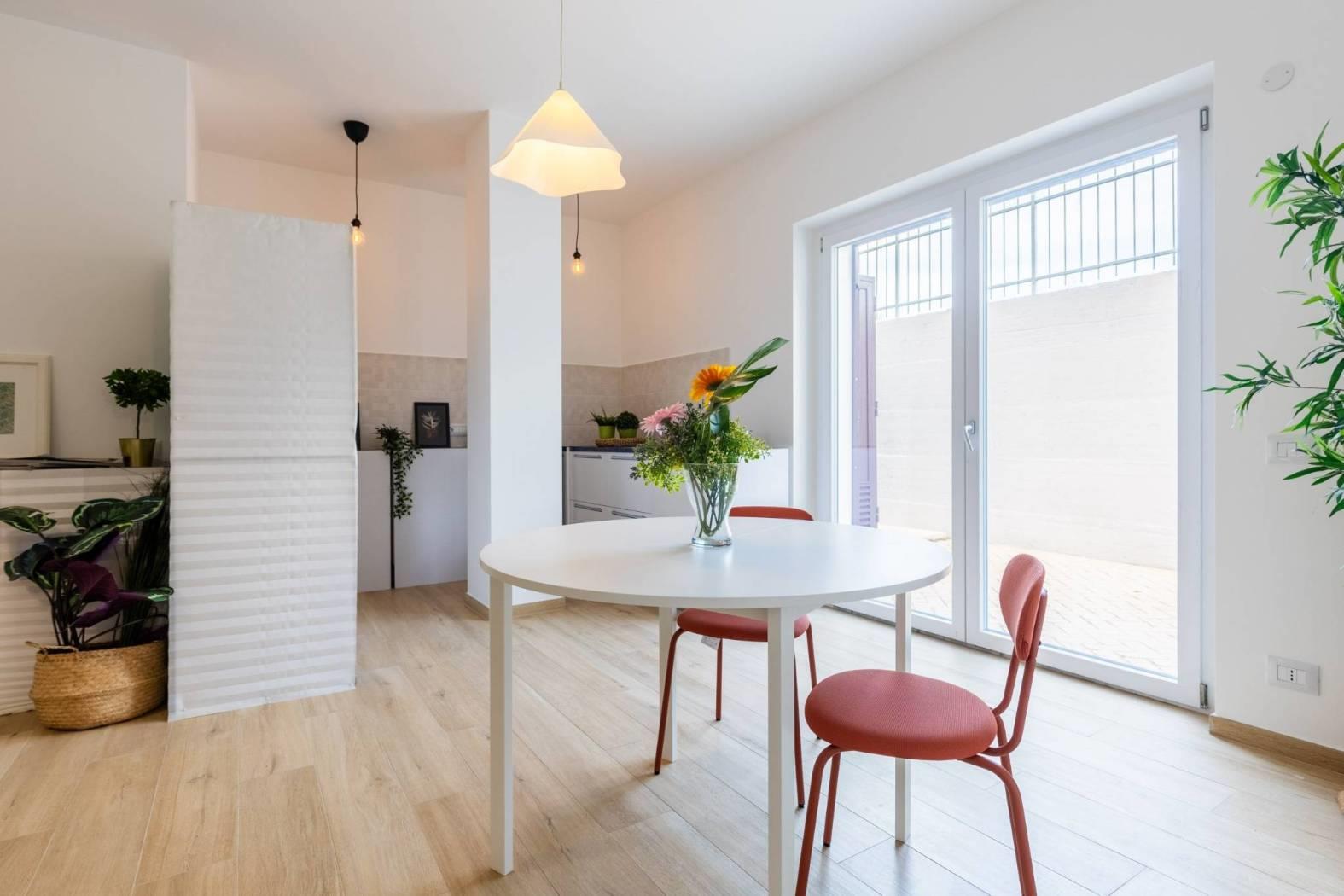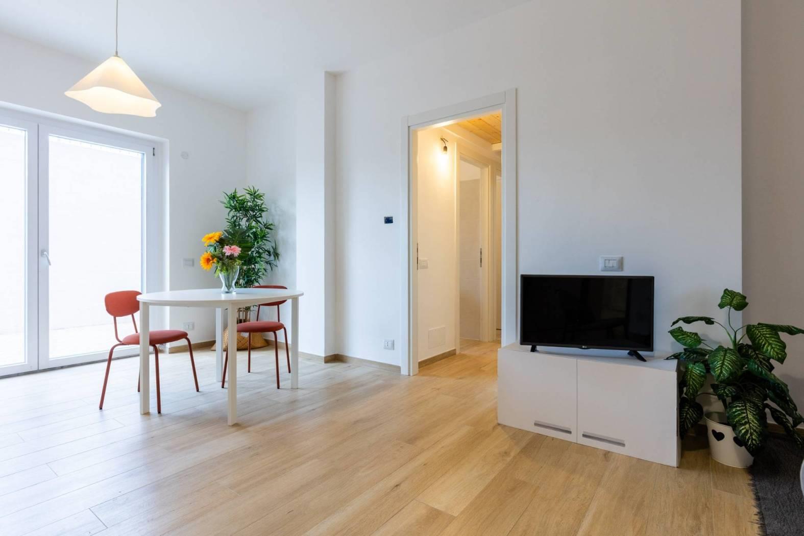 Piano terra, composto da un soggiorno con angolo cottura, una camera matrimoniale, una seconda camera, un vano soppalcato e finestrato, due bagni finestrati. La proprietà include un comodo giardino e un posto auto scoperto, con possibilità di acquistare un secondo posto auto. La classe energetica è A2, garantendo elevata efficienza energetica e bassi costi di gestione.
