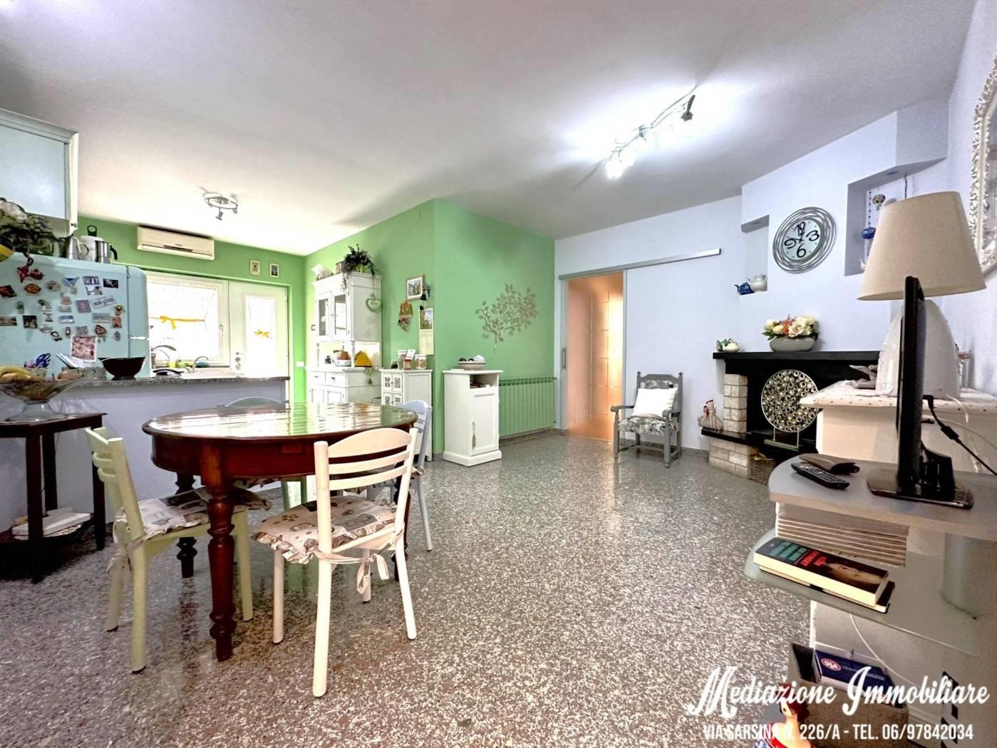 Zona Giorno: Ampio soggiorno e cucina abitabile a vista arricchita da un suggestivo camino, ideale per l’atmosfera invernale;
