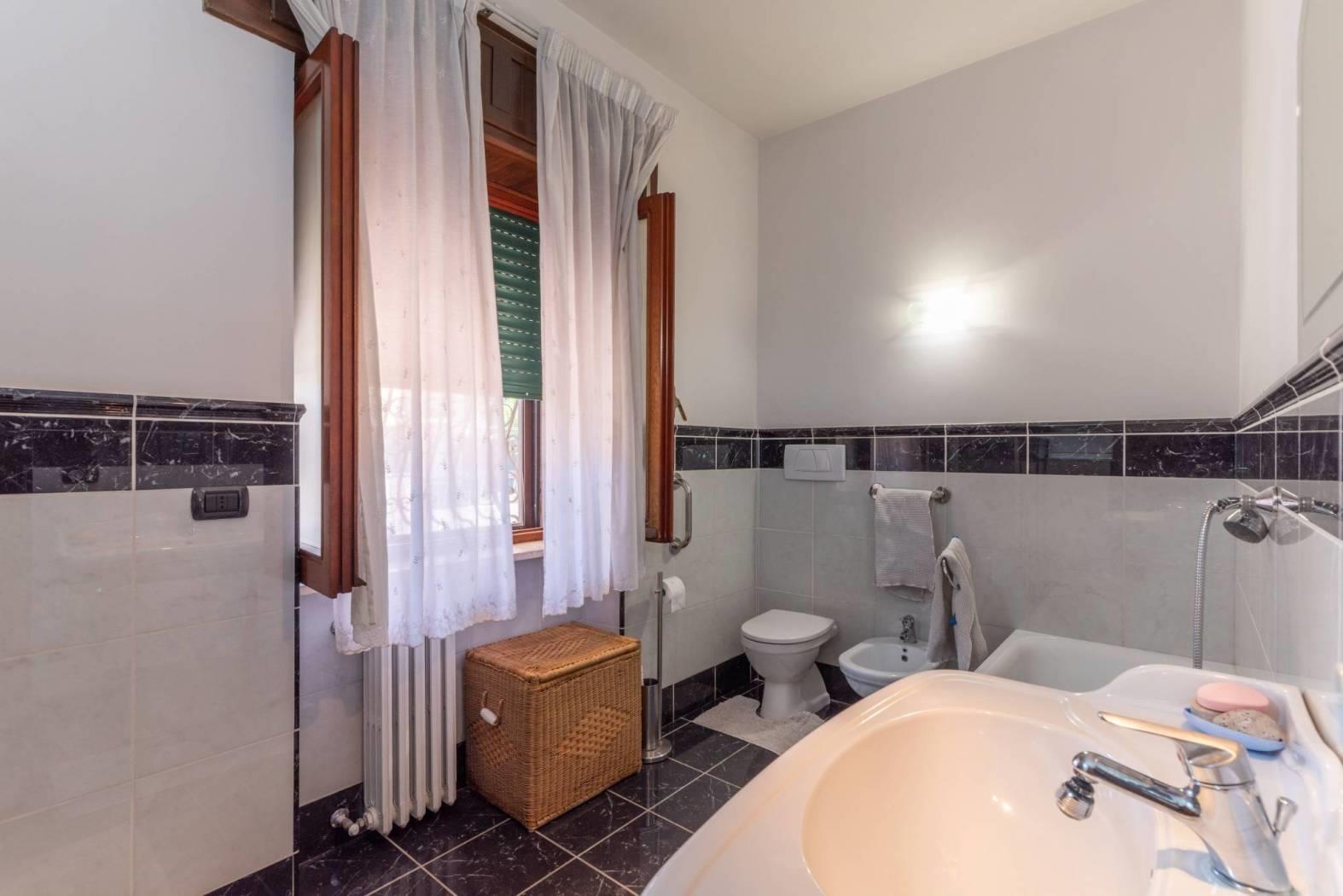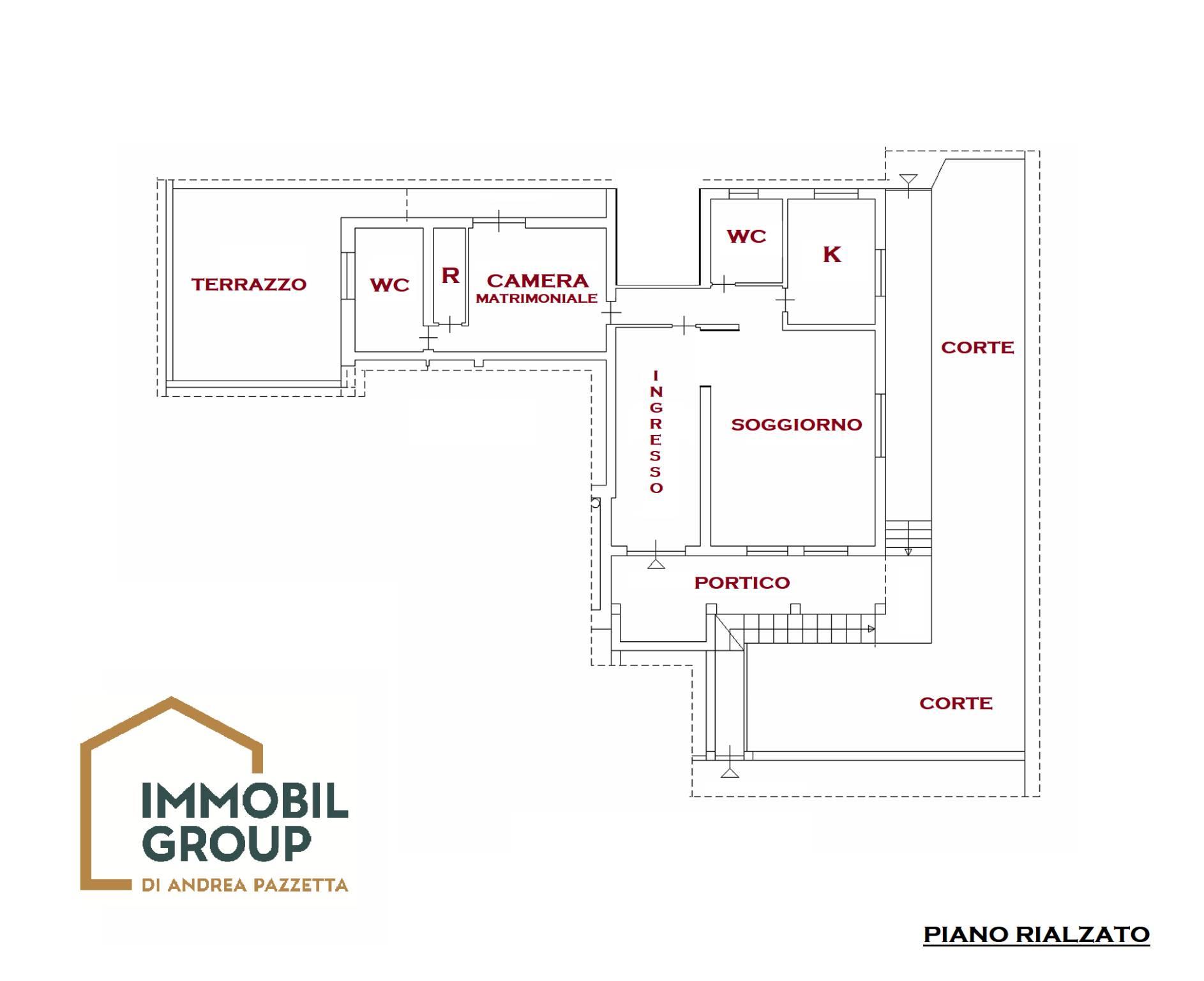 Tramite cancello su strada si accede alla proprietà, salendo dei gradini si arriva al piano rialzato, nel quale troviamo una corte esclusiva ed un portico coperto; tramite un portone si entra all’interno dell’appartamento, come primo ambiente troviamo un ingresso che ci conduce ad un ampio salone doppio, antistante abbiamo una cucina abitabile ed un bagno finestrato con doccia; proseguendo nel corridoio, in fondo troviamo un’ampia camera da letto matrimoniale con cabina armadio, un bagno finestrato con doccia ed un ampio terrazzo di pertinenza della camera. Scendendo al piano sottostante con scala esterna, ma con possibilità in futuro di crearne anche una interna, si arriva all’ampia sala hobby nella quale troviamo anche un angolo cottura, un ripostiglio, un bagno finestrato con doccia ed un bagno di servizio; inoltre il piano seminterrato è dotato anche di ampia cantina ed un altro ripostiglio. Completa la proprietà un box auto al piano seminterrato ed adiacente la sala hobby. L’abitazione è molto particolare nel suo genere e composta da ampi spazi; internamente richiede alcuni lavori di ristrutturazione.