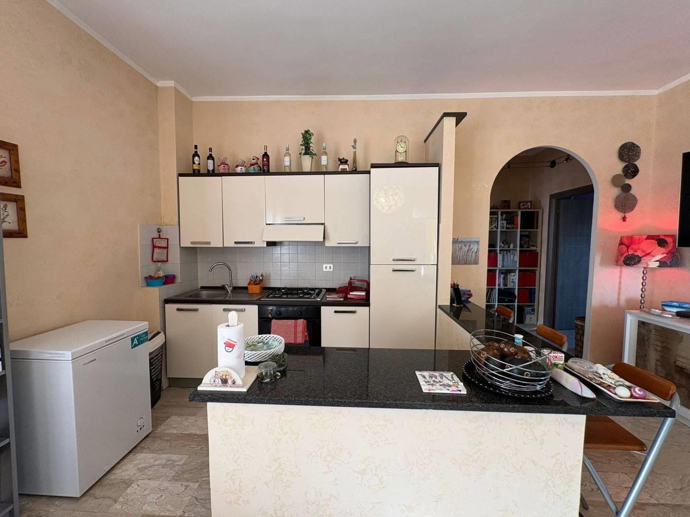 Procedendo troviamo un ampio salone con angolo cottura, anche qui l'ampia area finestrata oltre a permetterci di uscire sul balcone ci inonda di luce naturale.