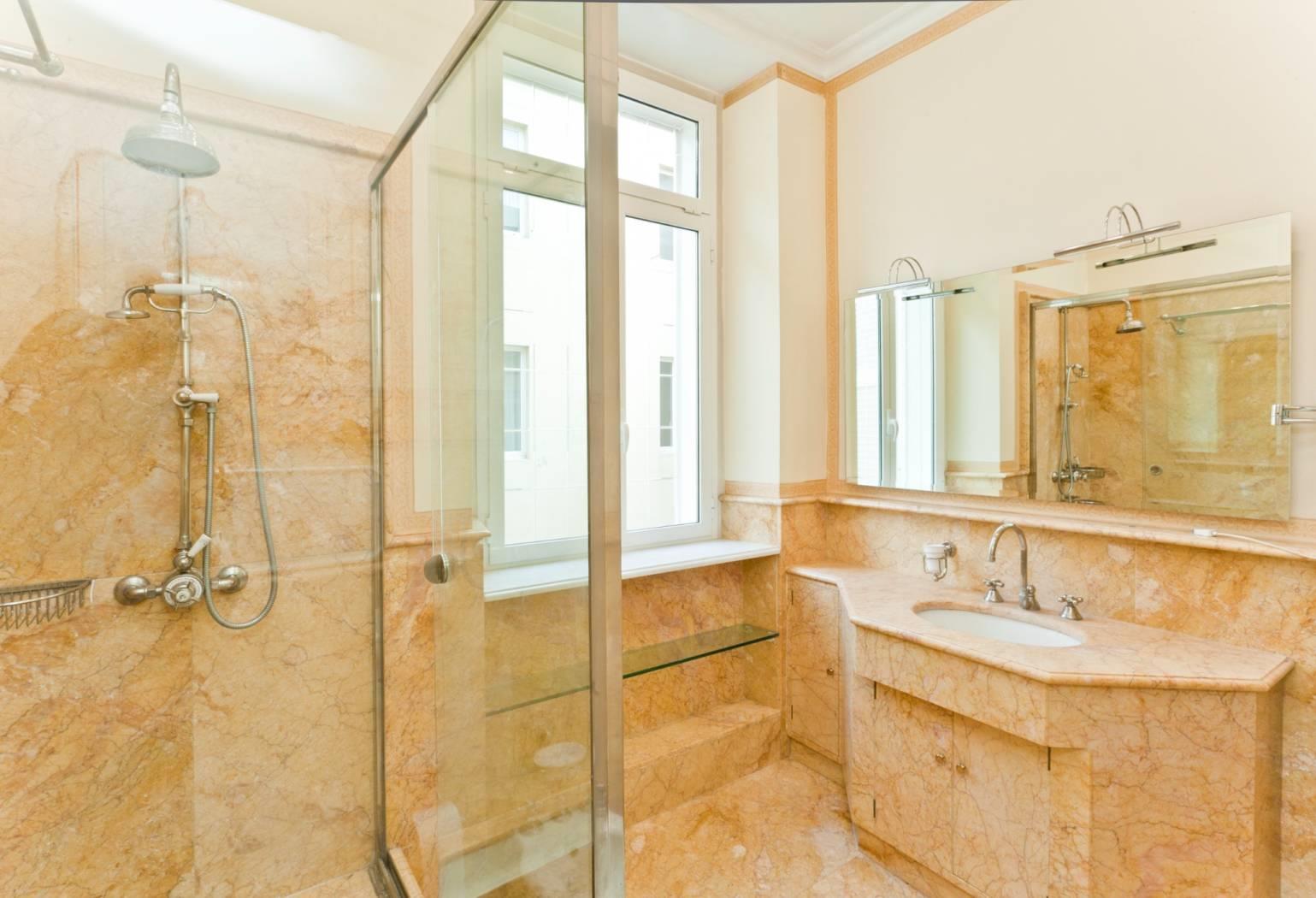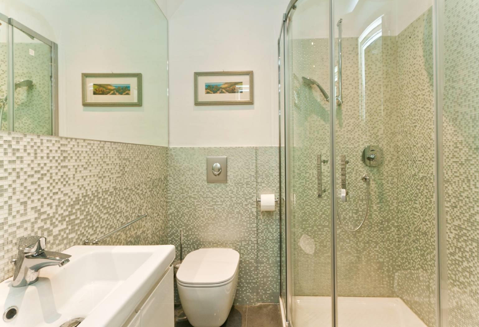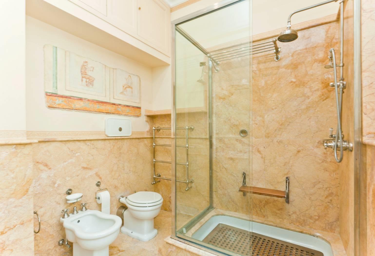 * da altri due bagni, uno in marmo bianco di carrara, l’altro con rivestimento in mosaico