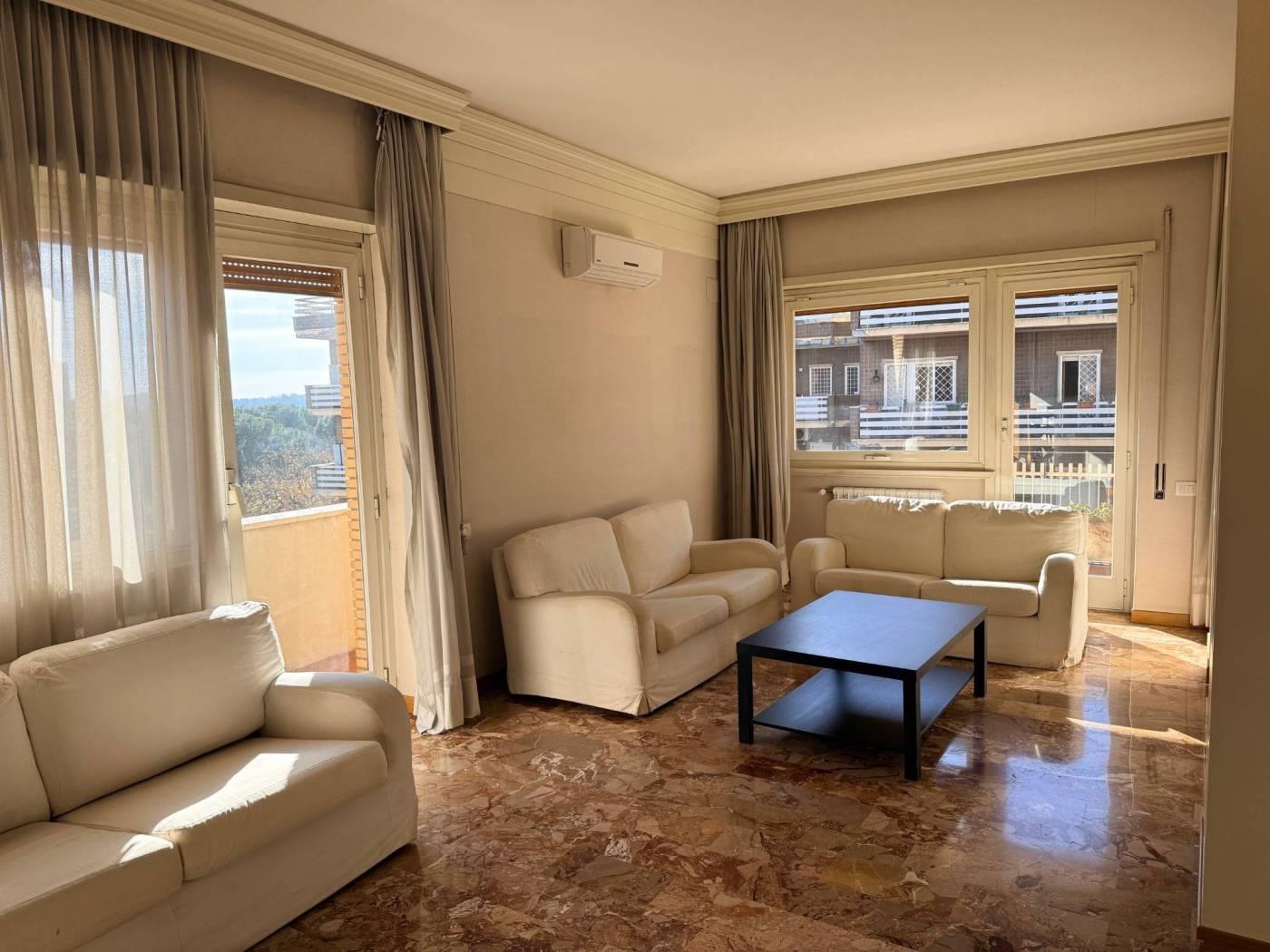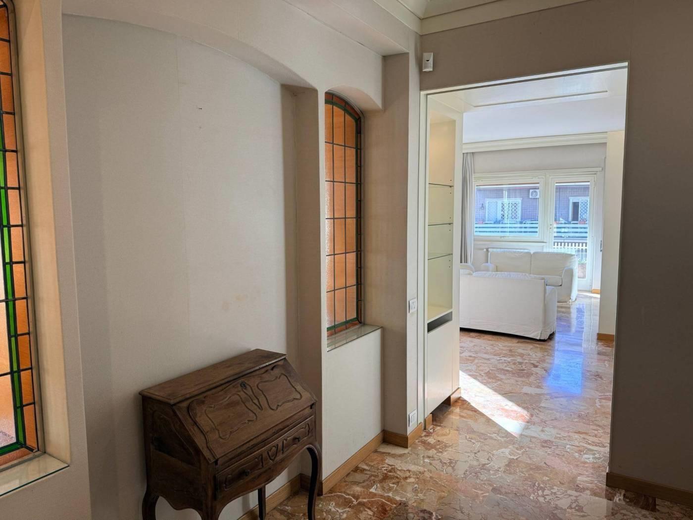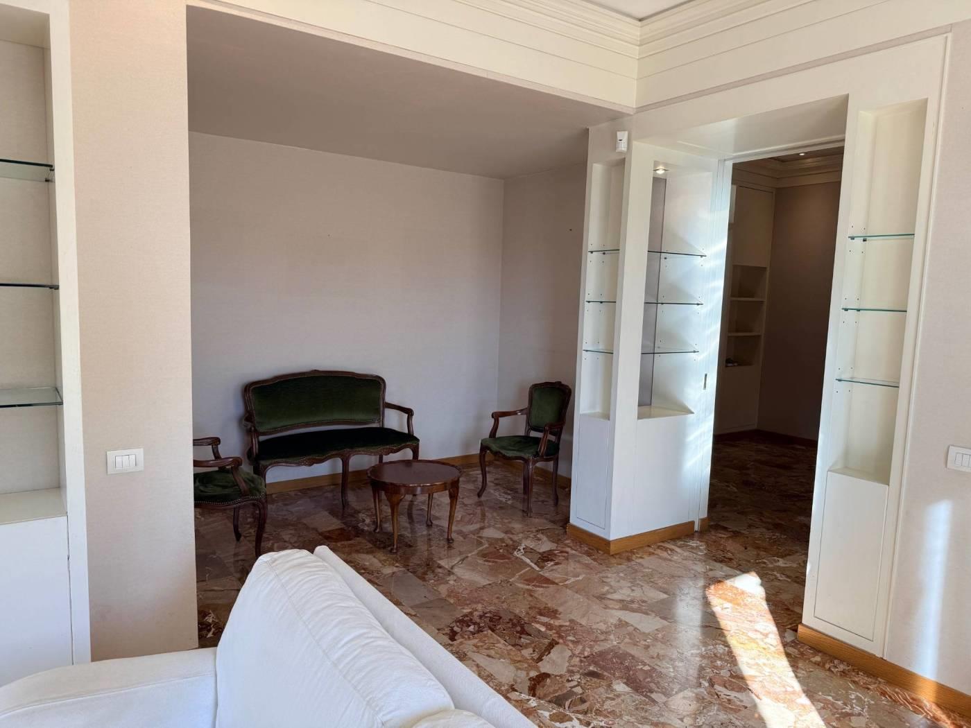 Gli infissi sono in alluminio doppio vetro, mentre la pavimentazione è marmo nella soggiorno, mentre nella zona notte e nella sala da pranzo è in parquet essenza rovere.