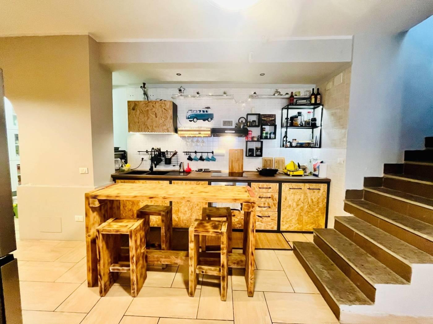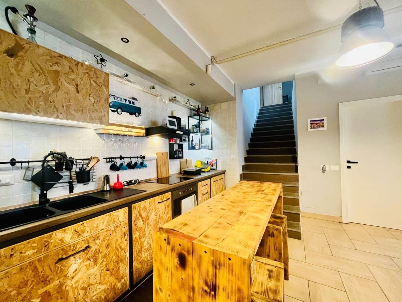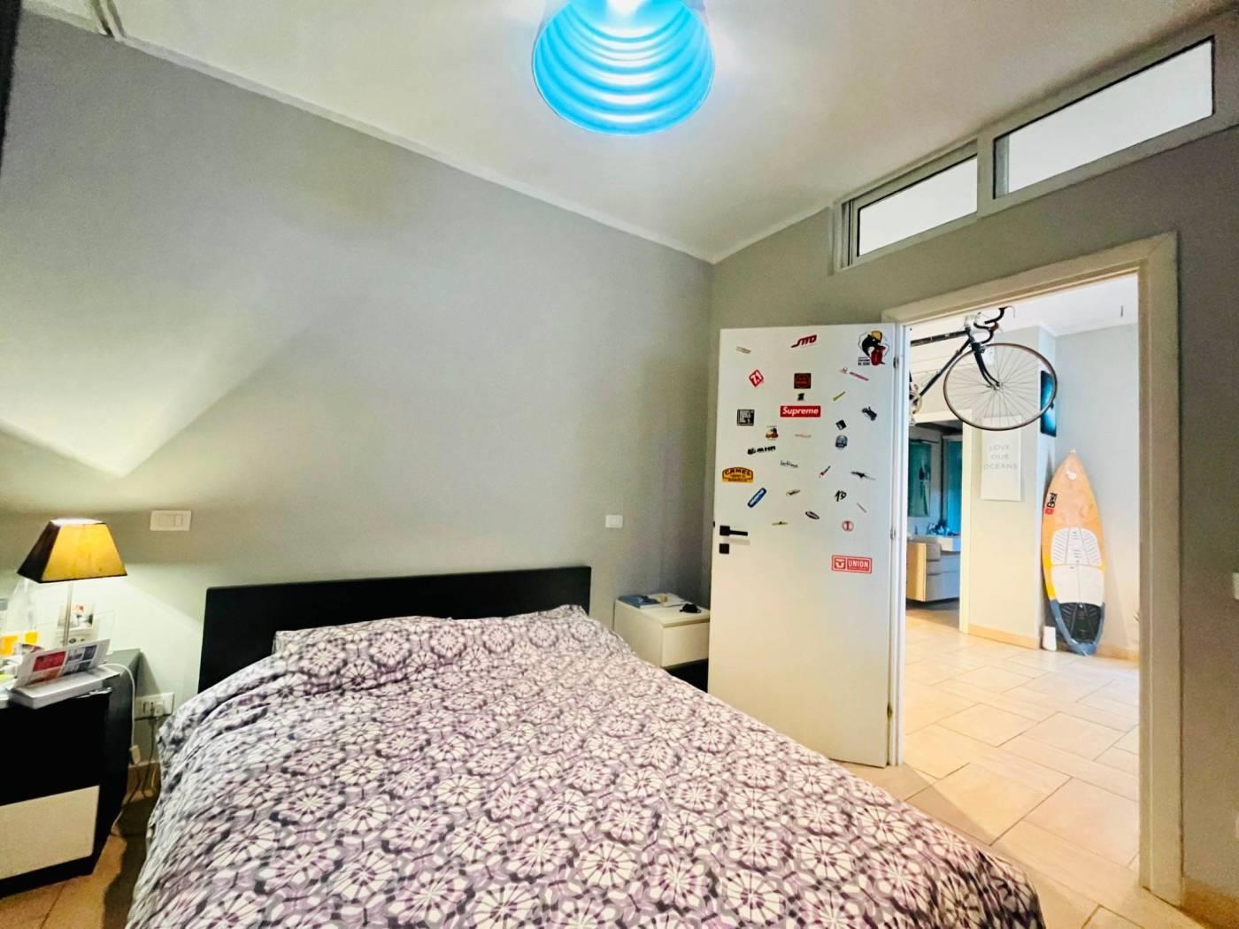 Una scala interna collega il livello superiore, dove è presente un’ulteriore camera con servizio e accesso a un giardino pavimentato.