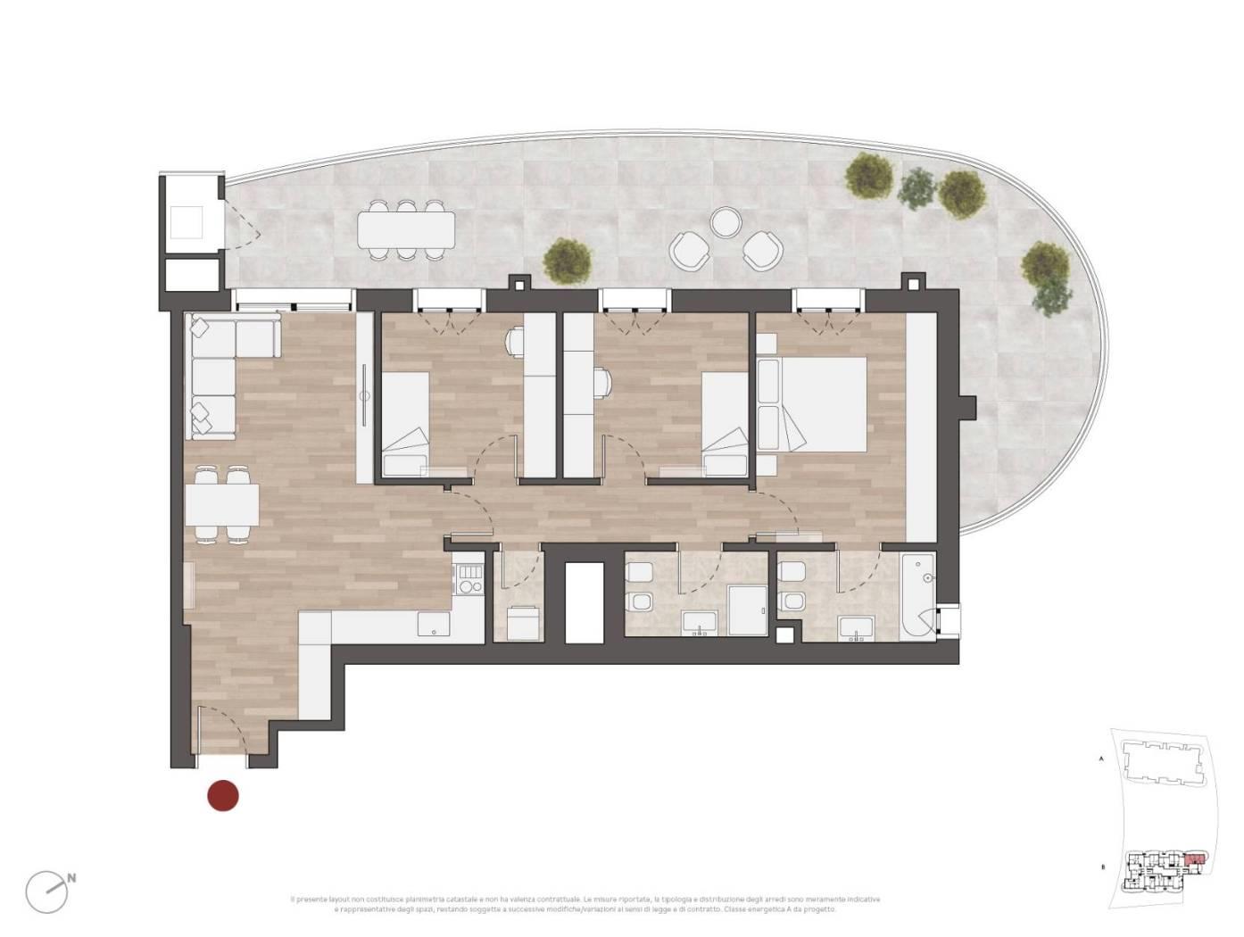 Questo quadrilocale, posto al primo piano, è caratterizzato da una metratura generosa. Il balcone molto ampio e a giro crea un'atmosfera di totale privacy. Gli interni presentano una distribuzione classica con una cucina separata ed una zona notte con un'ampia camera matrimoniale, due singole e due eleganti bagni.