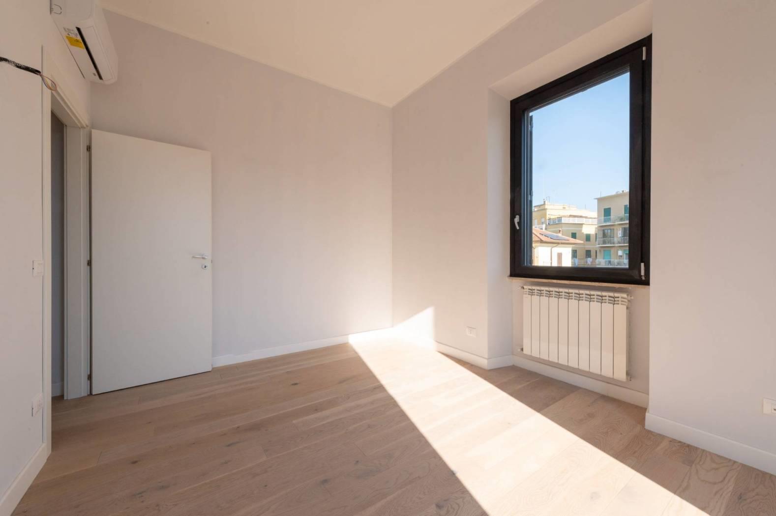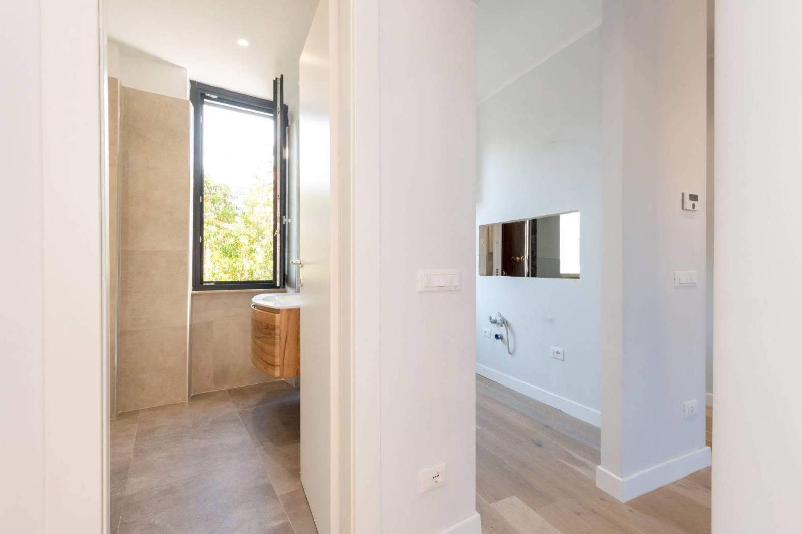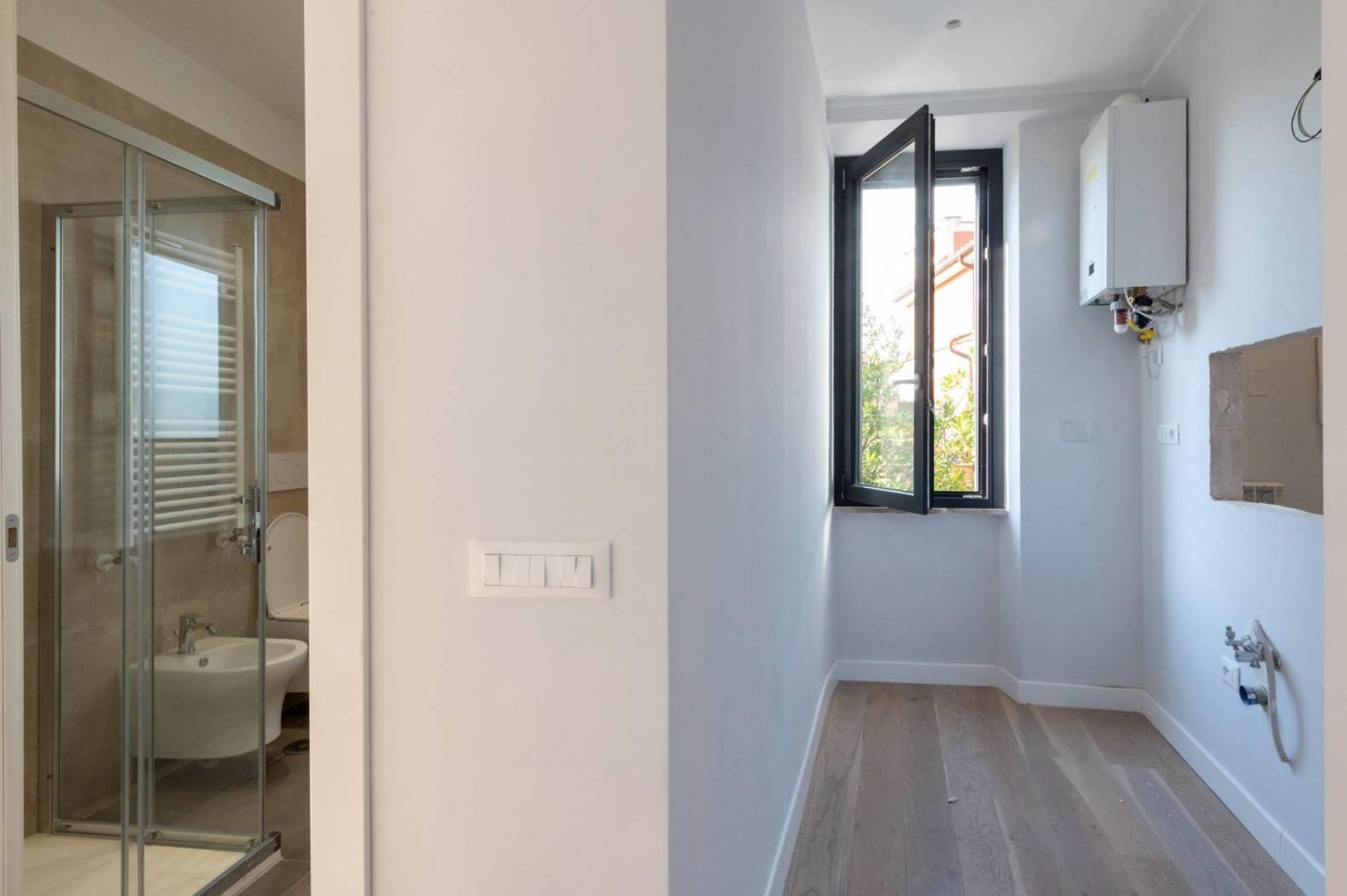 L'appartamento, mai abitato e interamente ristrutturato con materiali di alta qualità, si sviluppa su un livello e presenta apie finiture moderne. La disposizione comprende un luminoso salotto con angolo cottura, due confortevoli camere da letto e un bagno.