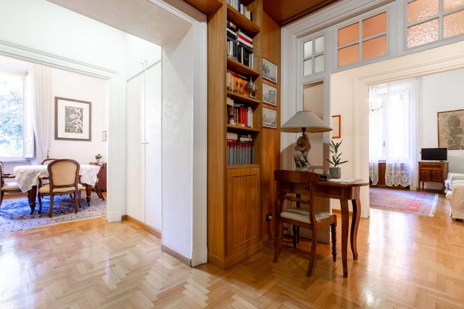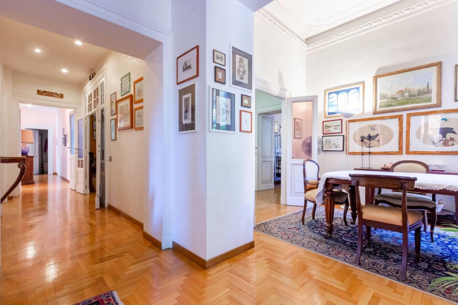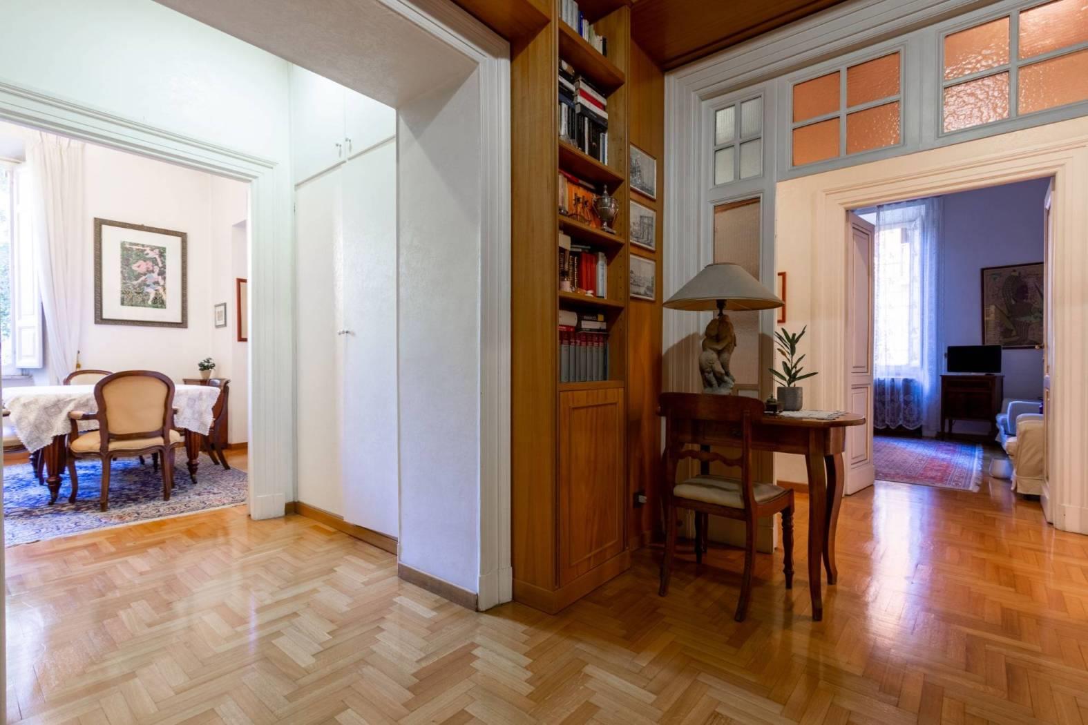 L'appartamento, di oltre 190 mq, si compone di un ingresso accogliente arredato con una libreria boiserie su misura, un salone doppio luminoso, una cucina abitabile e tre camere matrimoniali, oltre a una cameretta ideale per ospiti o come studio. I doppi servizi offrono praticità per tutta la famiglia.