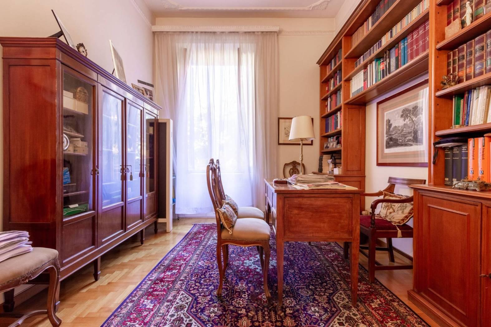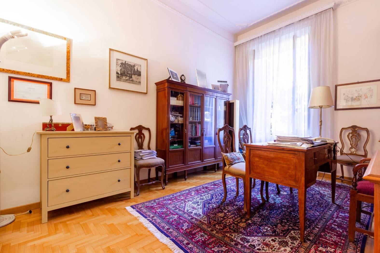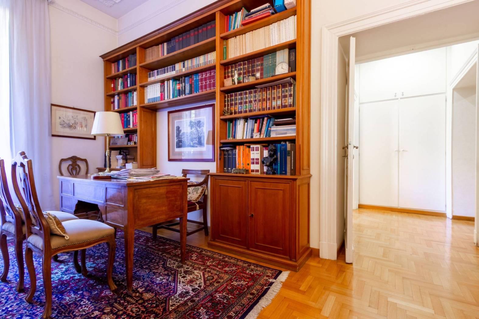 L'appartamento, di oltre 190 mq, si compone di un ingresso accogliente arredato con una libreria boiserie su misura, un salone doppio luminoso, una cucina abitabile e tre camere matrimoniali, oltre a una cameretta ideale per ospiti o come studio. I doppi servizi offrono praticità per tutta la famiglia.