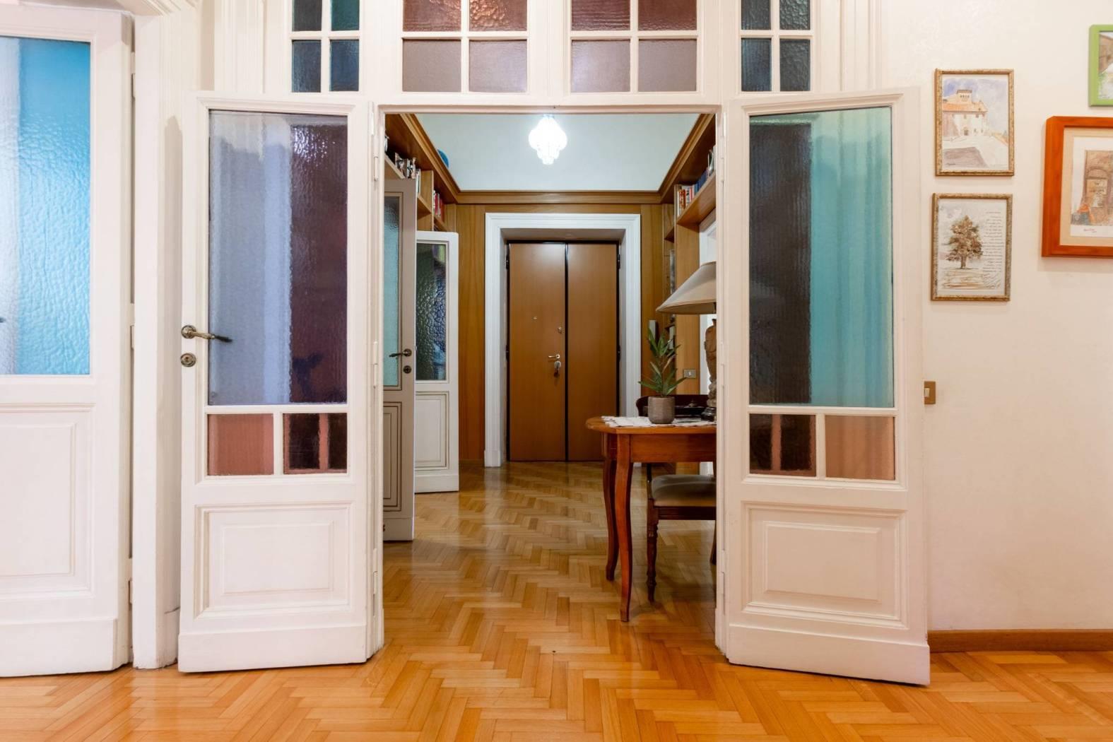 Gli alti soffitti stuccati, di 3,5 metri conferiscono un senso di grandezza e luminosità agli spazi interni.