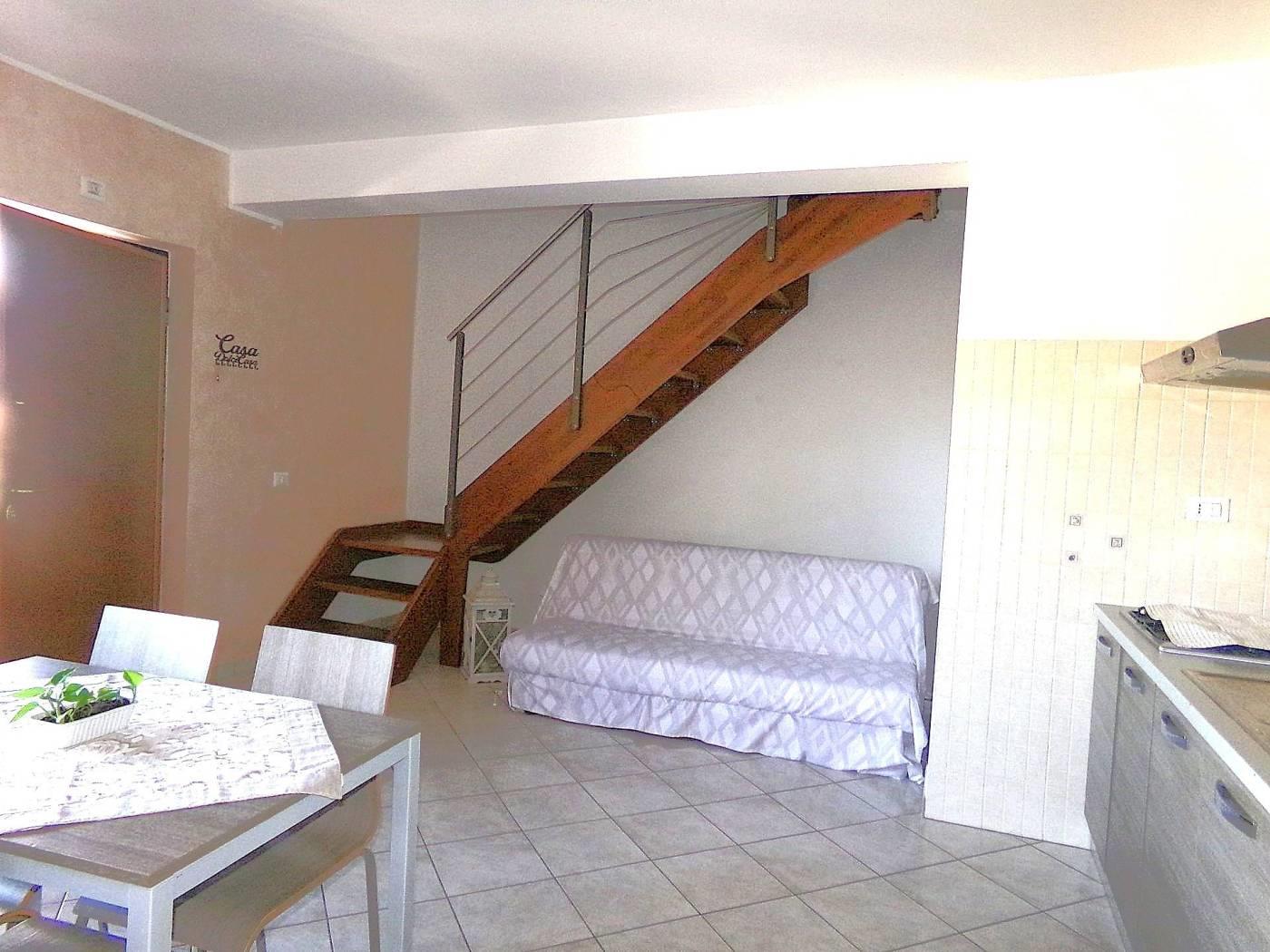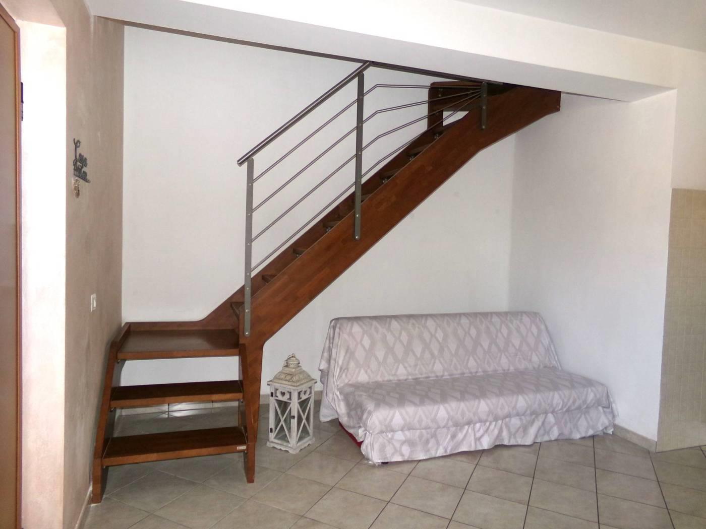 L’immobile, disposto su due piani, presenta al primo livello l’ambiente abitativo, composto da luminoso salone con angolo cottura, camera matrimoniale, cameretta, bagno con doccia e un balcone con ripostiglio esterno; tramite elegante scala in legno si accede dall'interno al livello superiore, dove un comodo disimpegno (pluriuso) introduce alla terrazza di proprietà di circa 100 mq, che rappresenta un importante valore aggiunto per situazioni conviviali e momenti privati di relax.