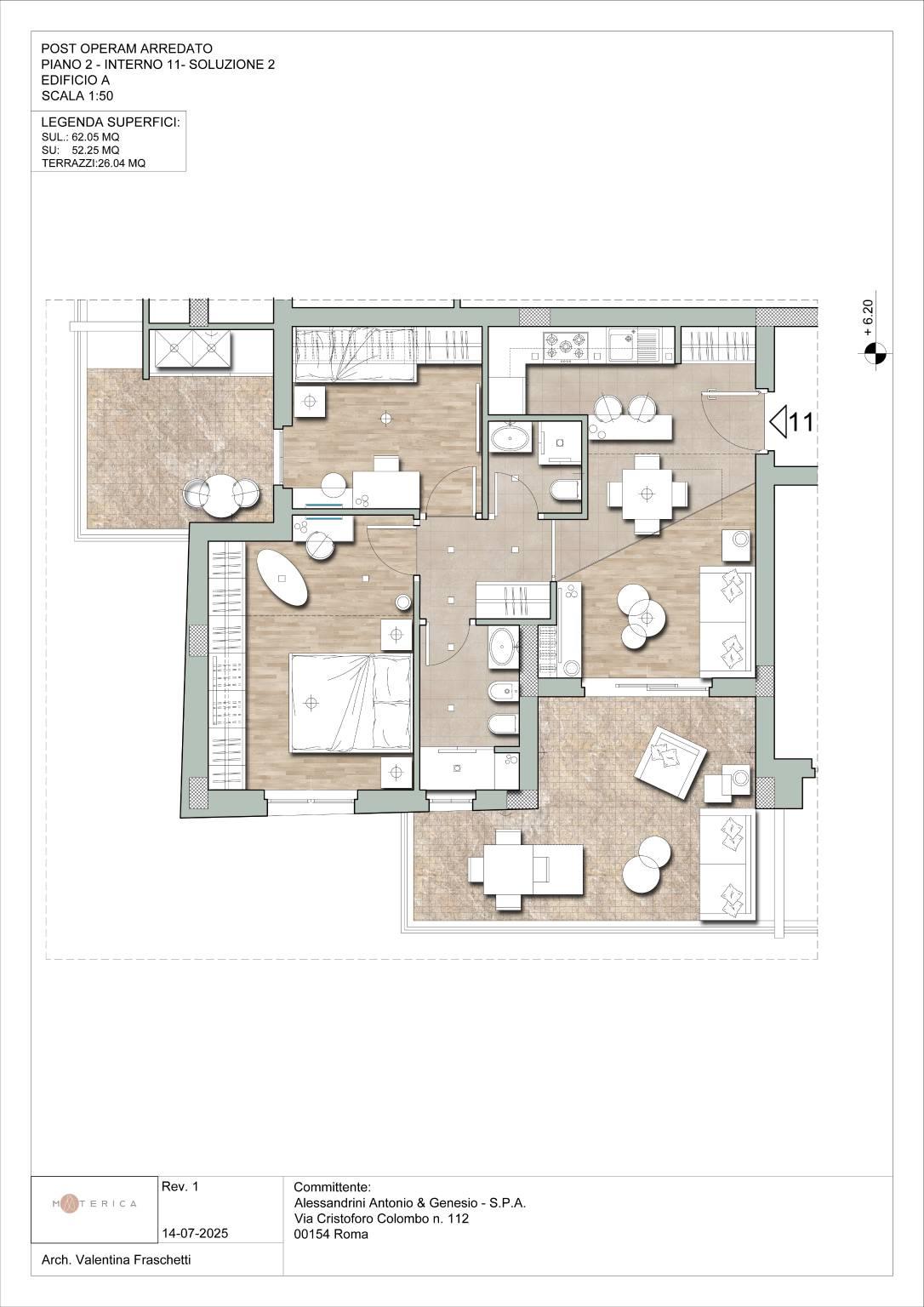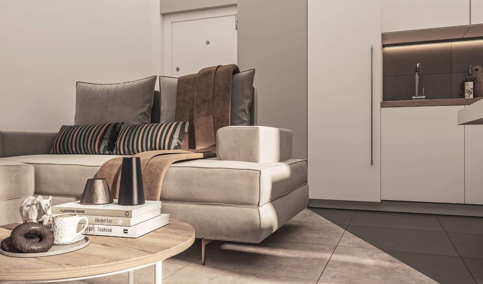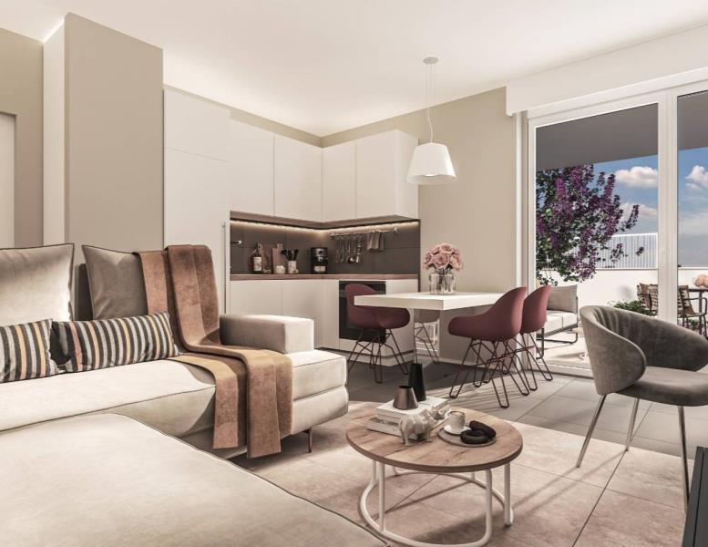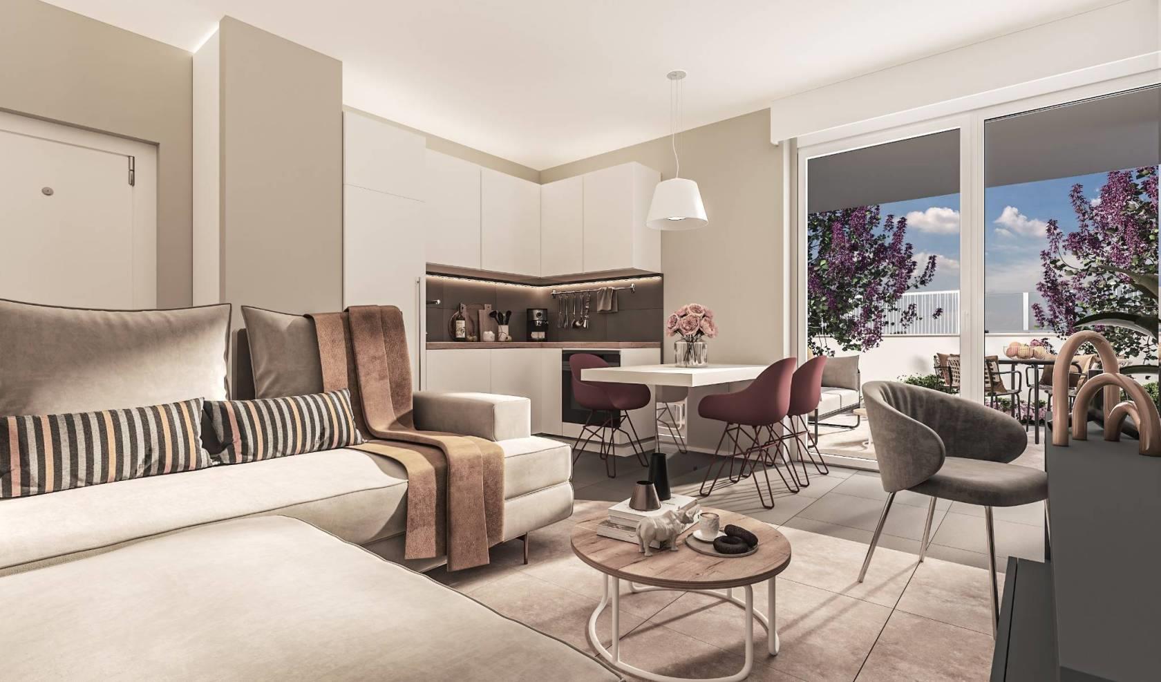 Gli interni, progettati dallo studio Materica, offrono ambienti eleganti e funzionali: zone giorno vivibili con angolo cottura o cucina separata, ingressi e disimpegni arredabili, bagni finestrati con docce spaziose.