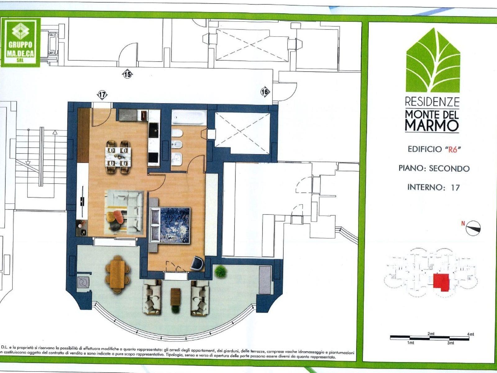 RESIDENZE MONTE DEL MARMO, nuovo complesso residenziale, CONSEGNA PREVISTA MARZO 2027, proponiamo in vendita appartamento di mq. commerciali 60 circa, bilocale, piano secondo, esposizione SO, composto da salone con angolo cottura, camera matrimoniale, bagno, terrazzo di 35 mq. circa. Completa la proprietà una cantina. € 285.000 - Possibilità di acquisto del posto auto e/o box. Classe energetica A4 - - R6 - INTERNO 17 Il riscaldamento degli ambienti e la produzione di acqua calda sanitaria sono affidati alla centrale di teleriscaldamento con regolazione della temperatura indipendente. Il confort estivo è garantito dagli impianti di condizionamento e di ricambio dell’aria che creano una temperatura piacevolmente fresca nei mesi caldi. Molteplici sono gli accorgimenti che garantiranno il massimo della sicurezza e del comfort in materia di risparmio energetico, bioedilizia ed isolamento termico ed acustico: struttura antisismica, impianto centralizzato, pannelli fotovoltaici, sistema domotico, sistema radiante a pavimento, recupero delle acque piovane, assorbimento termico. Il comprensorio sarà dotato di piscina, campi da paddle, zona fitness, parco giochi, area cani.