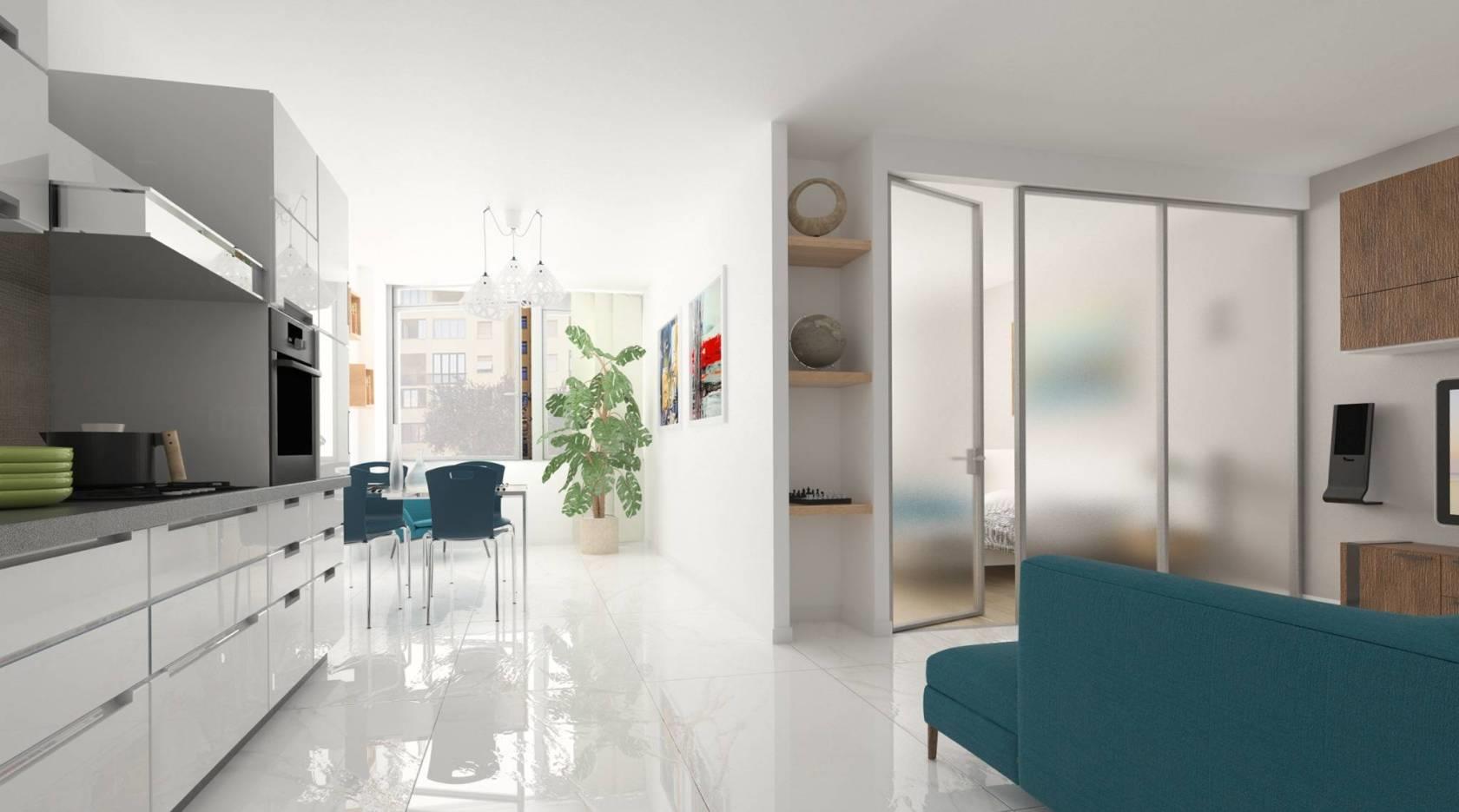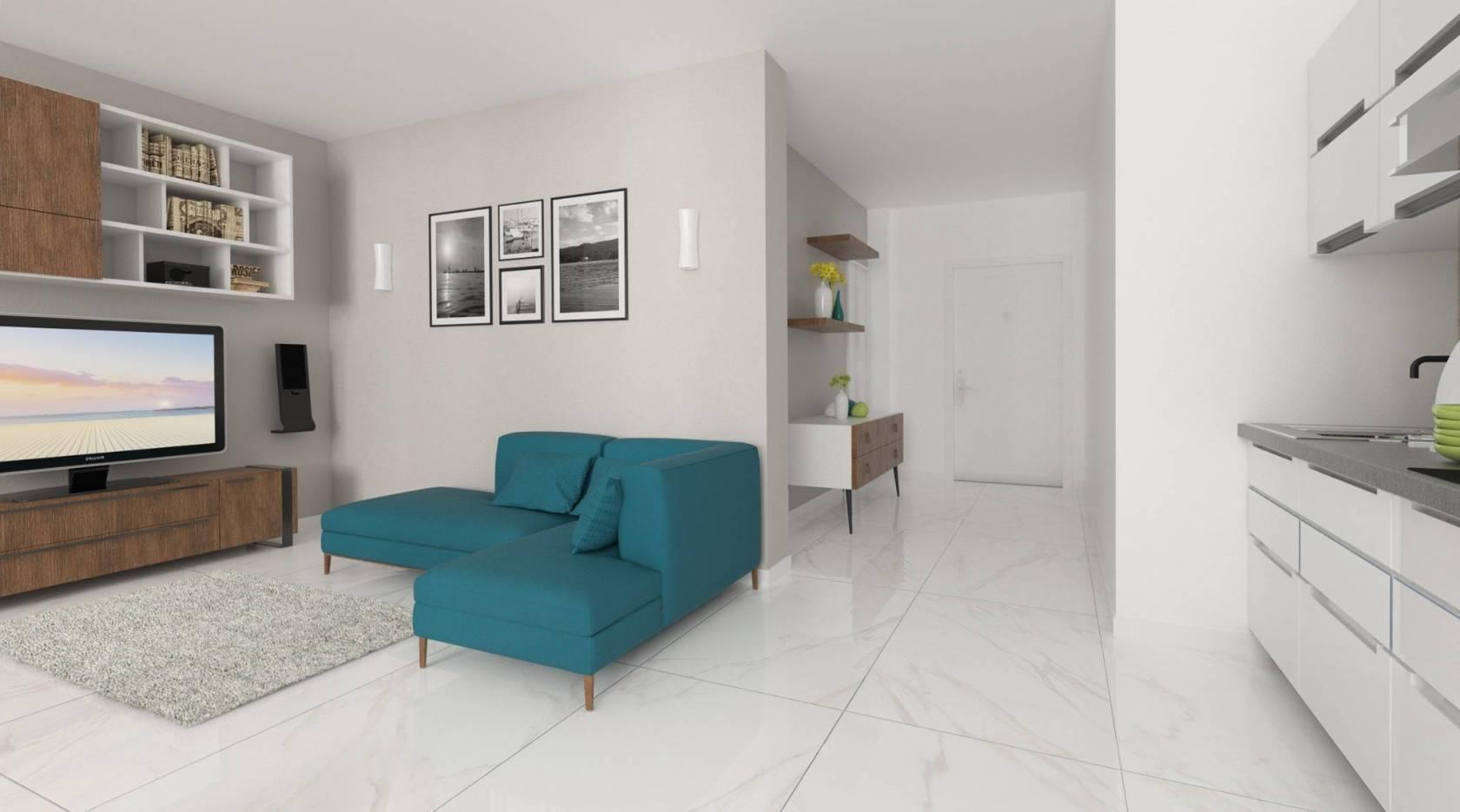 Splendido appartamento di ultima generazione, con affaccio luminoso a sud, personalizzabile internamente, composto da ingresso, soggiorno con cucina a vista, camera da letto matrimoniale con reparto guardaroba e possibilità di veranda, 2 bagni.