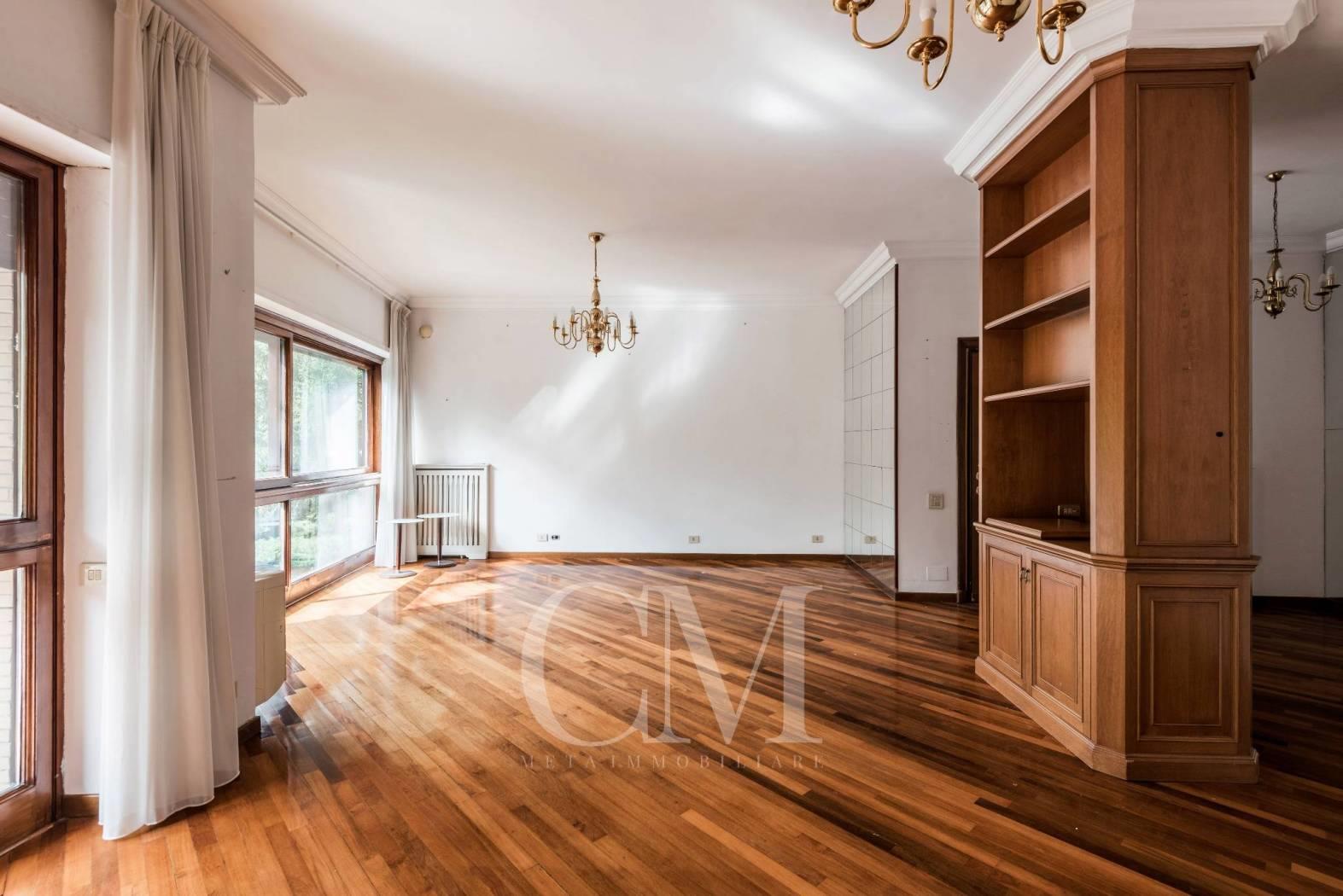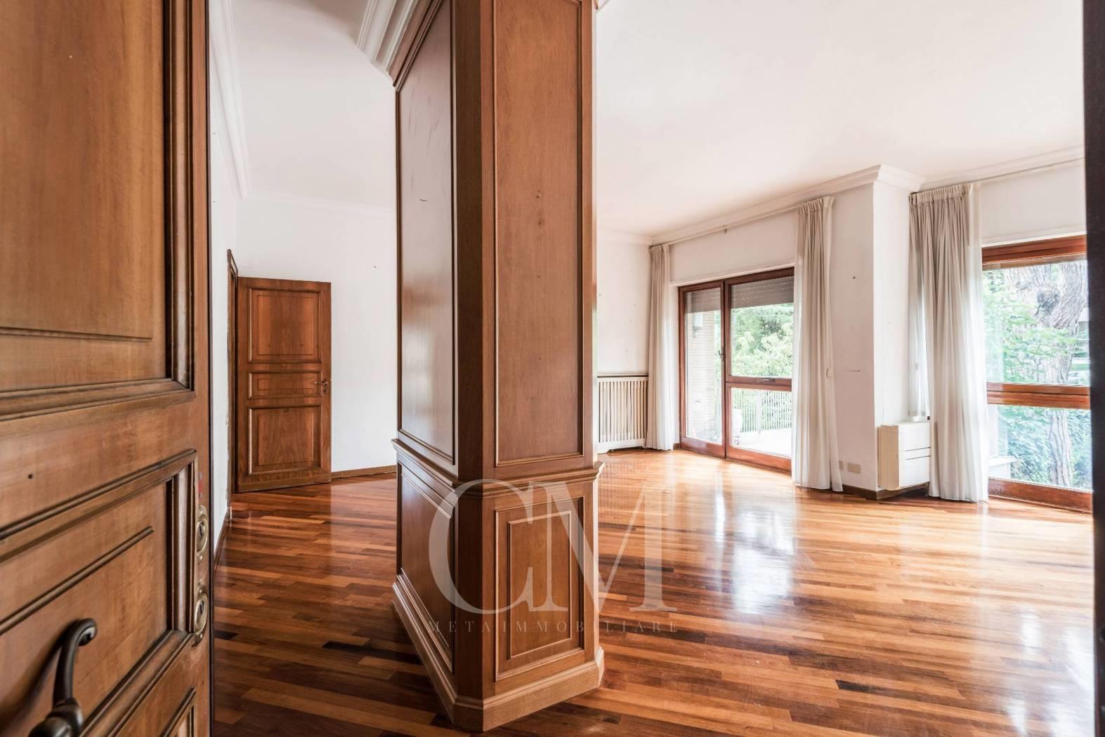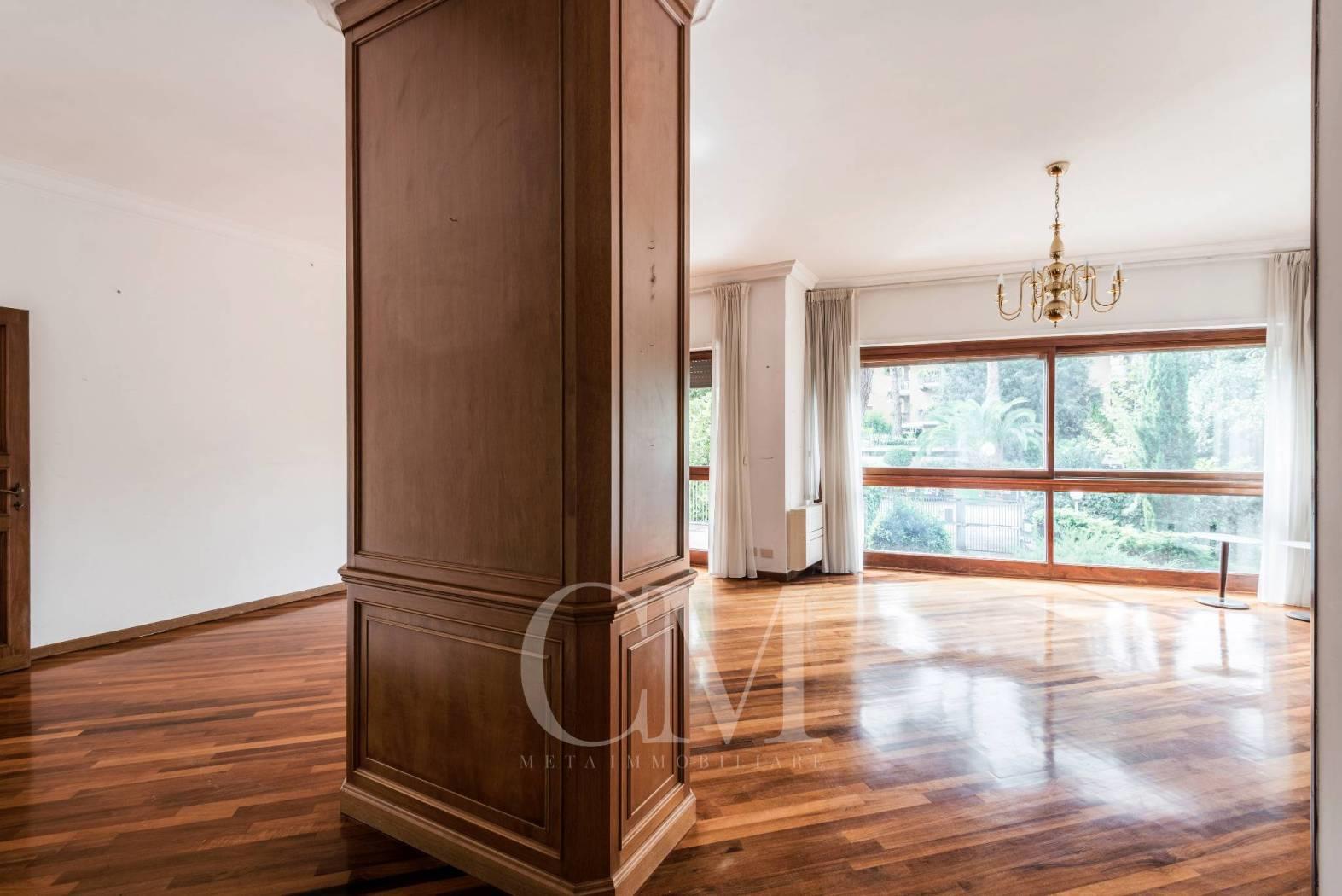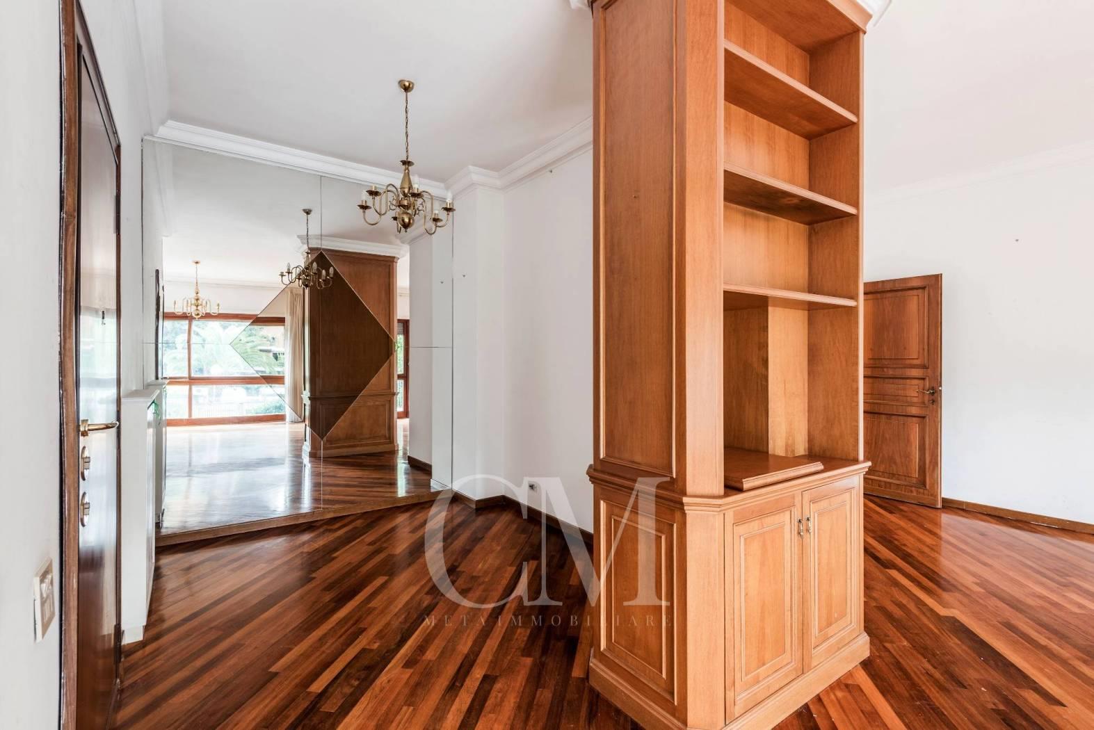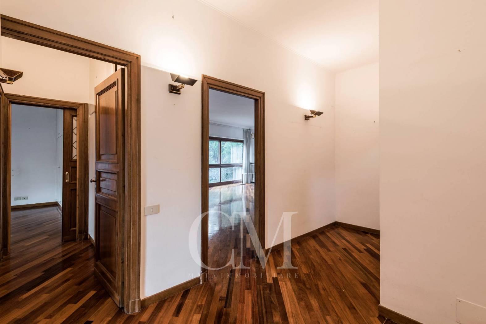 La distribuzione degli spazi è impeccabile: un salone doppio di alta rappresentanza, studio e tre camere da letto, completati da tre bagni e un comodo doppio ingresso.
