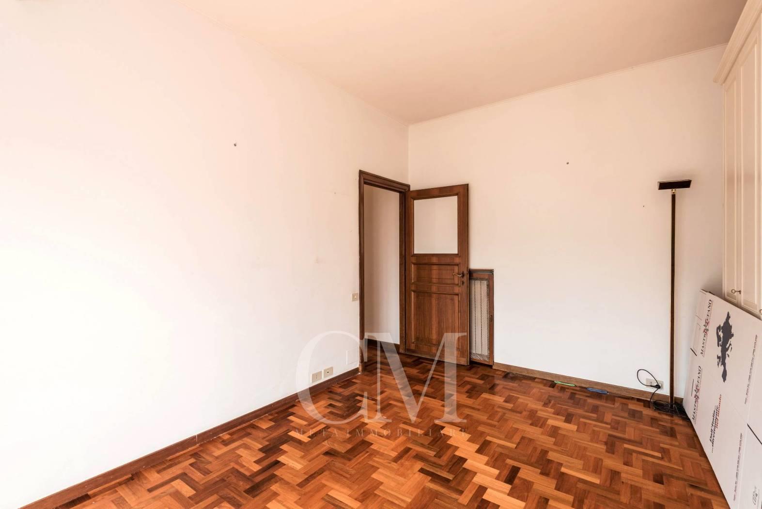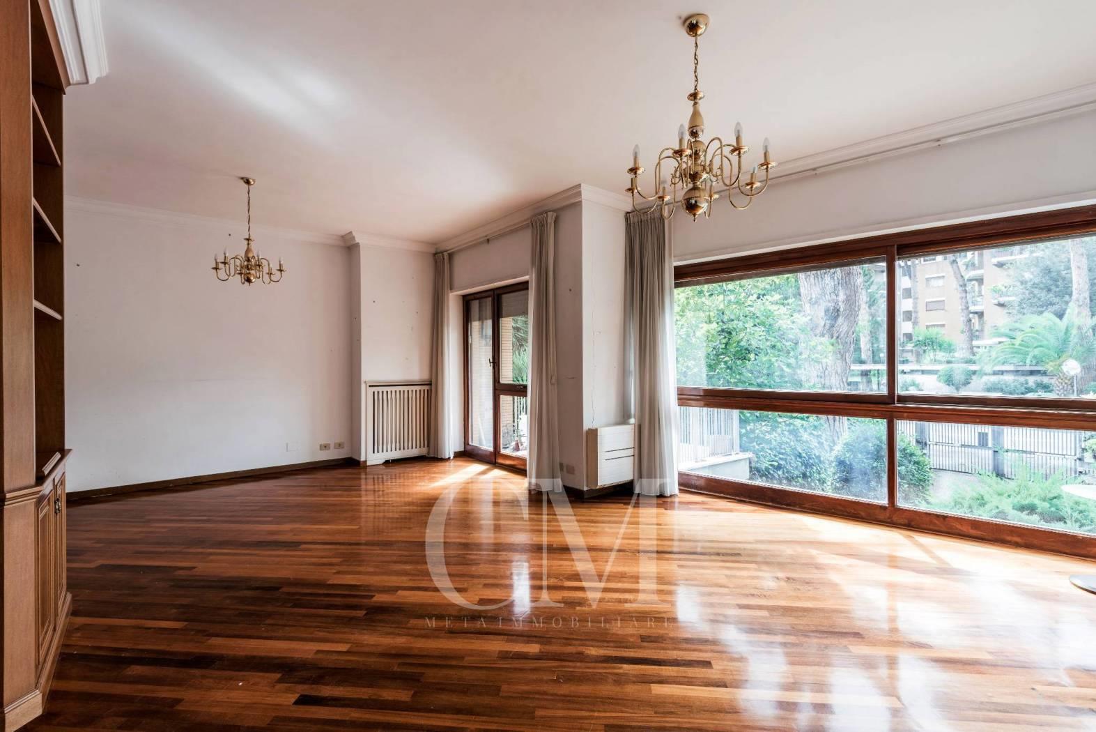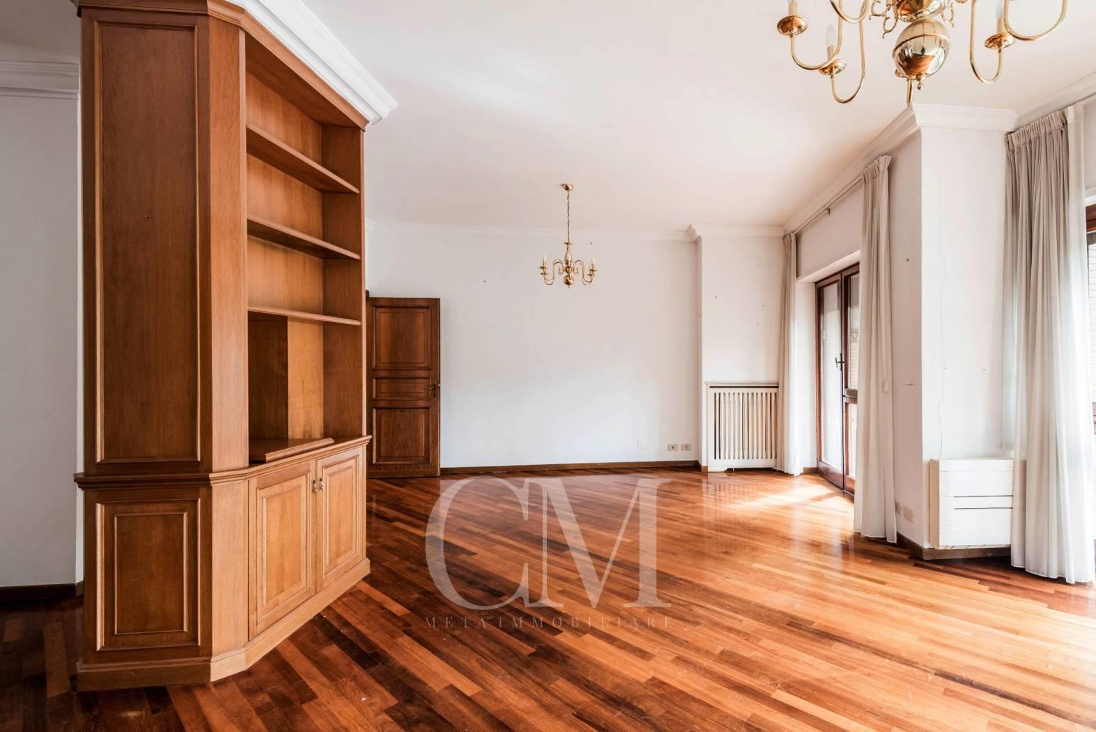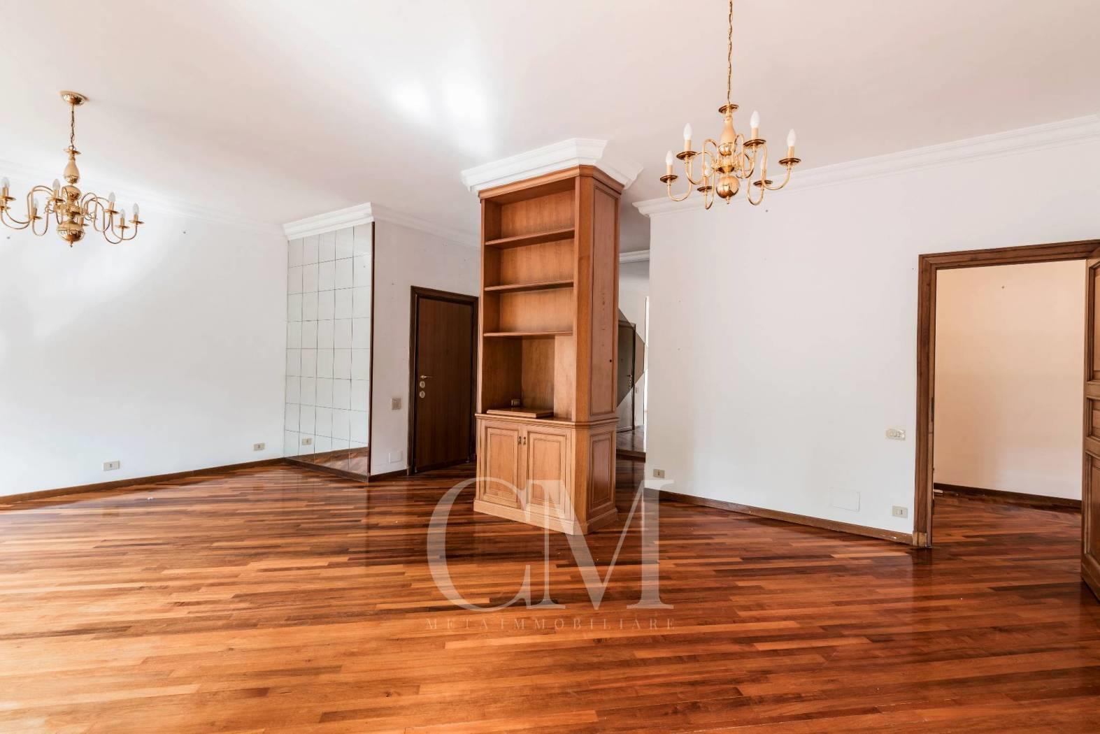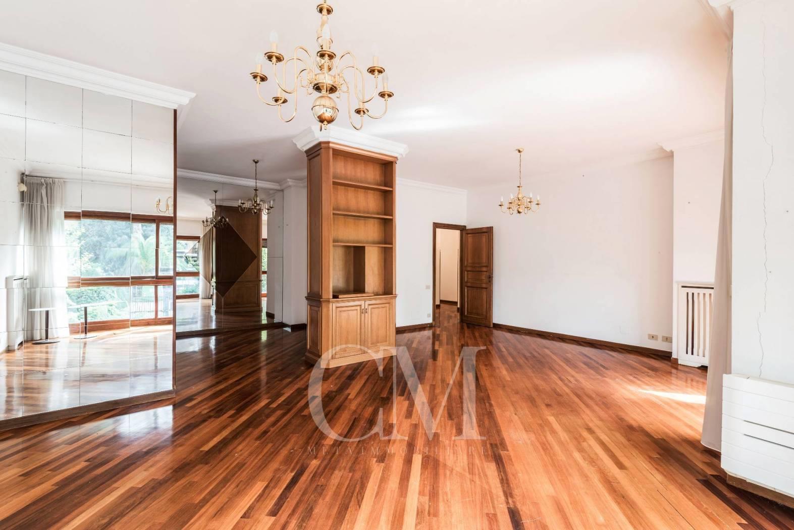 La distribuzione degli spazi è impeccabile: un salone doppio di alta rappresentanza, studio e tre camere da letto, completati da tre bagni e un comodo doppio ingresso.