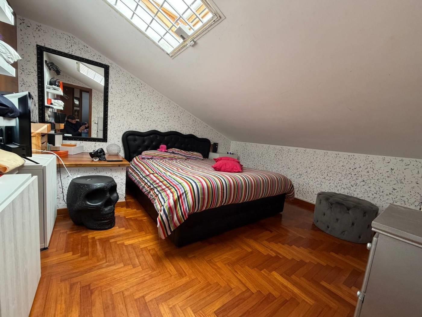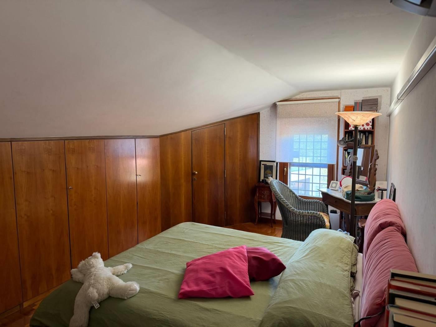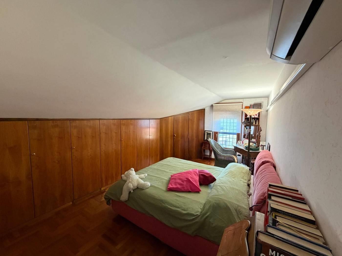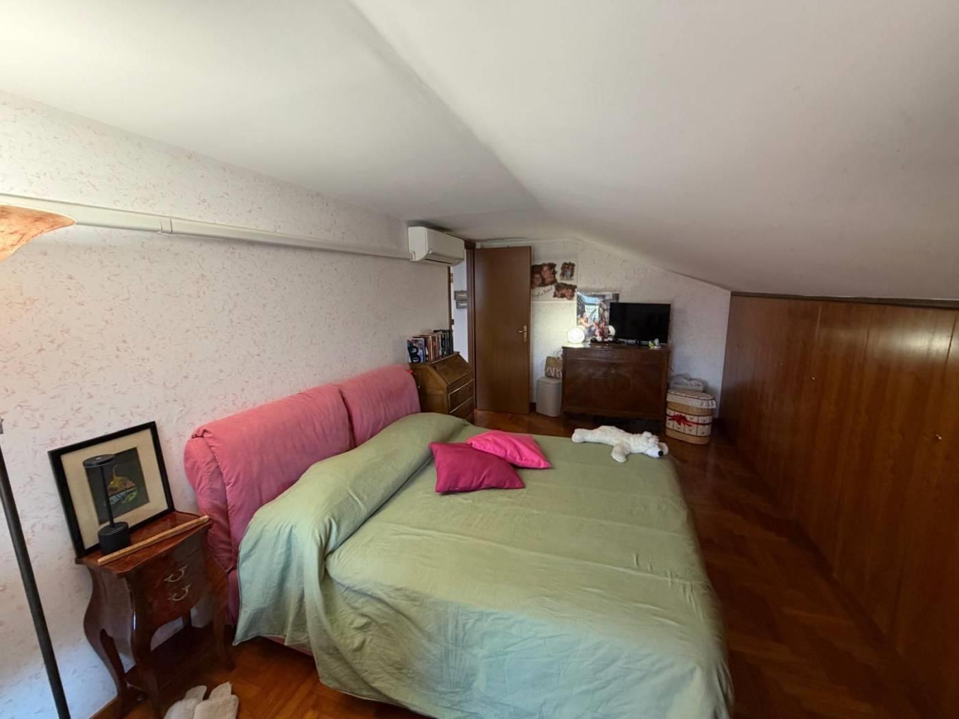L'appartamento è composto da salone, cucina semi abitabile, camera da letto matrimoniale, bagno completamente ristrutturato in chiave moderna con finestra, balcone perimetrale, al piano sovrastante (completamente pavimentato in parquet) si trovano due camere mansardate ed un bagno con doccia e vasca idromassaggio.