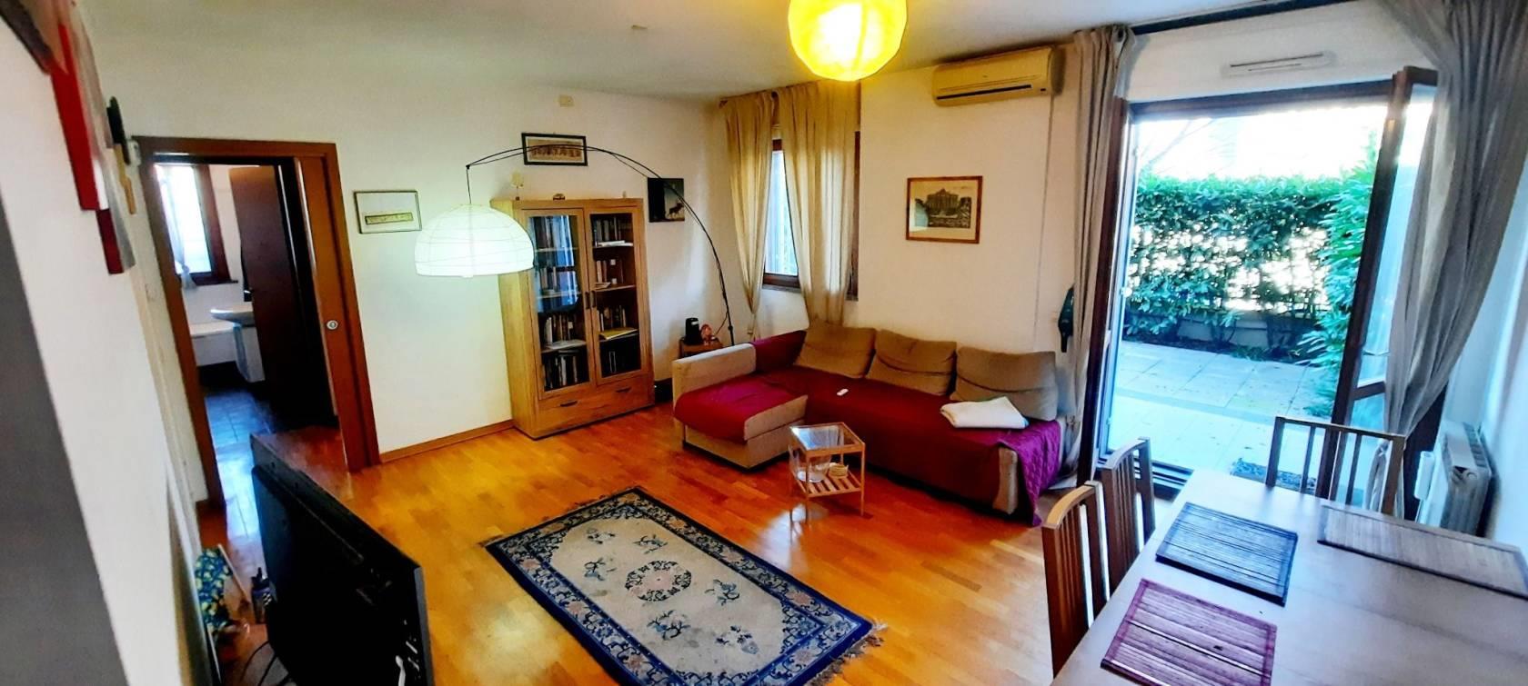 Proponiamo in vendita, in un contesto residenziale e tranquillo, un appartamento di mq 63 con giardino privato di mq 140 ,ristrutturato, cosi meglio descritto: