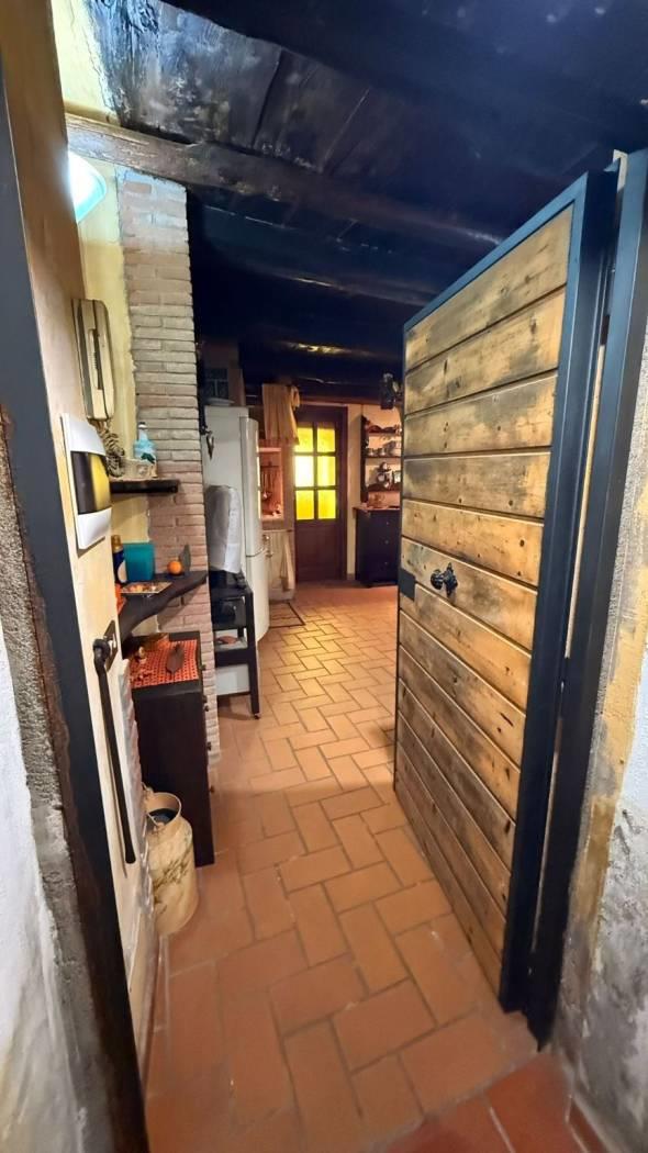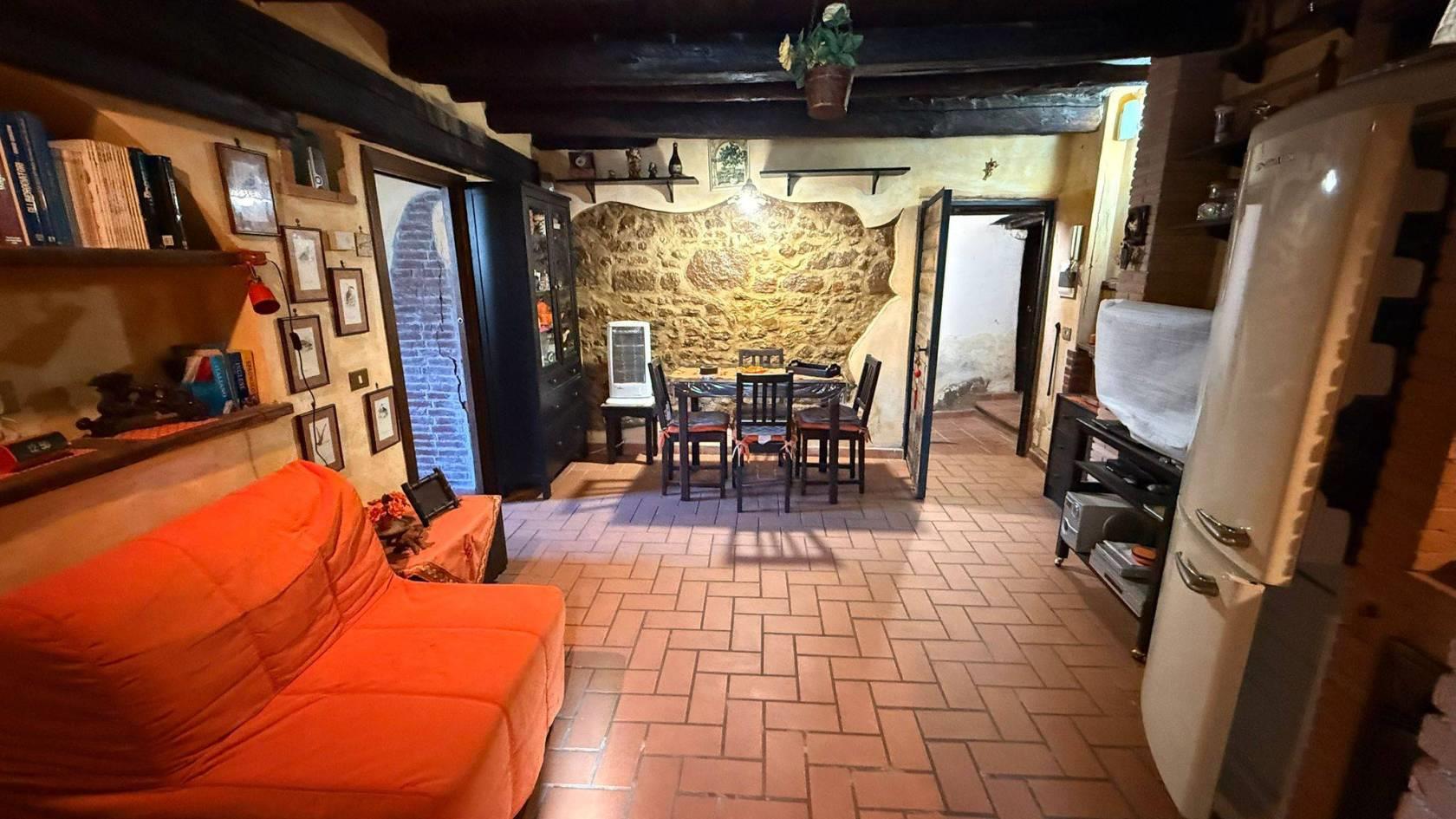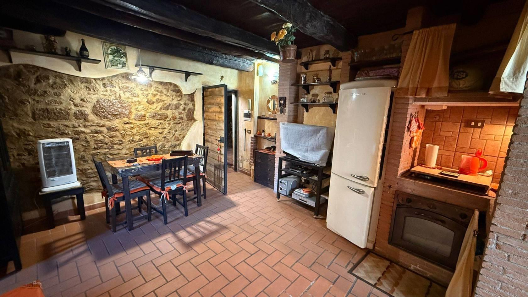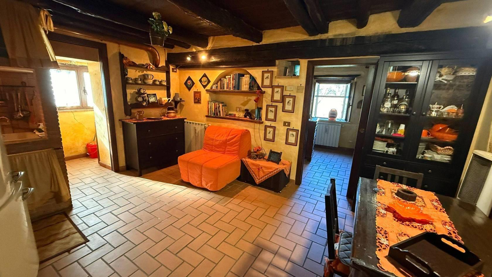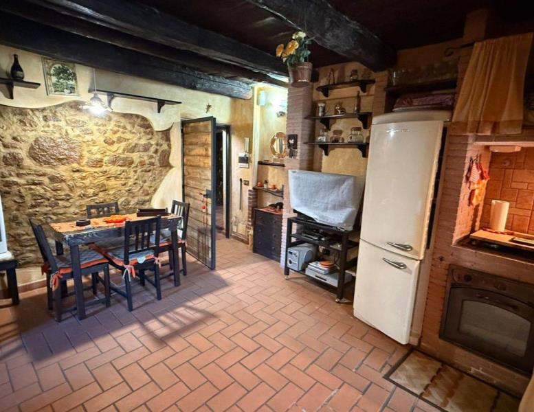 L’ingresso si apre su un ampio soggiorno con angolo cottura in stile rustico, impreziosito da travi in legno a vista, pareti in pietra e dettagli in muratura che richiamano il fascino delle case di una volta.