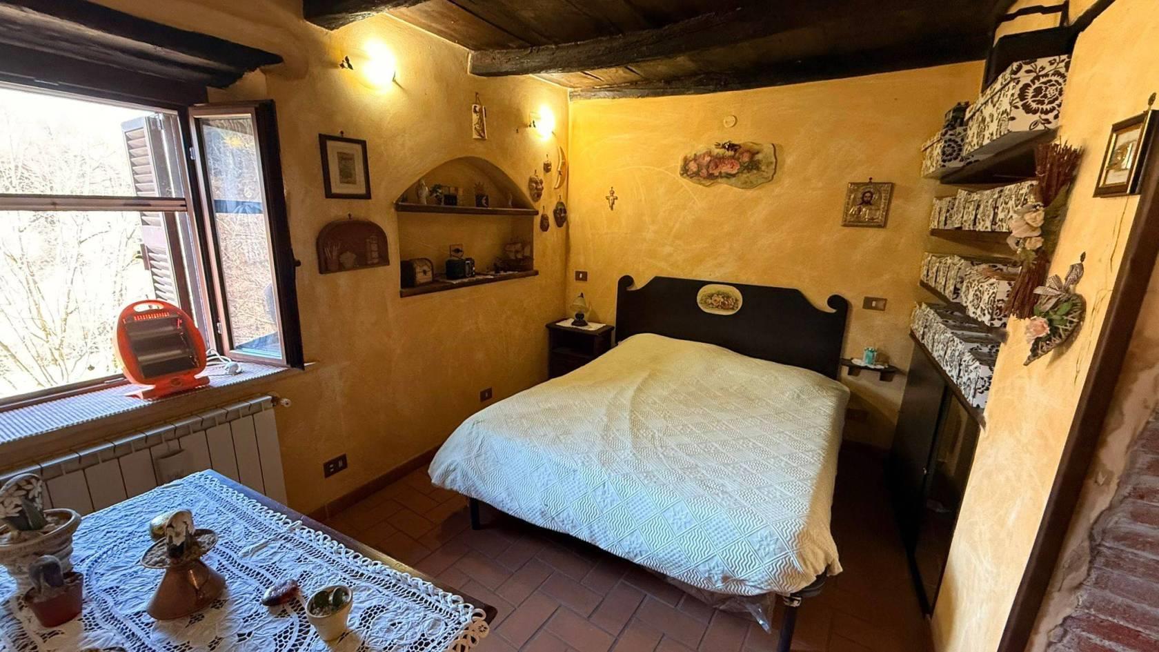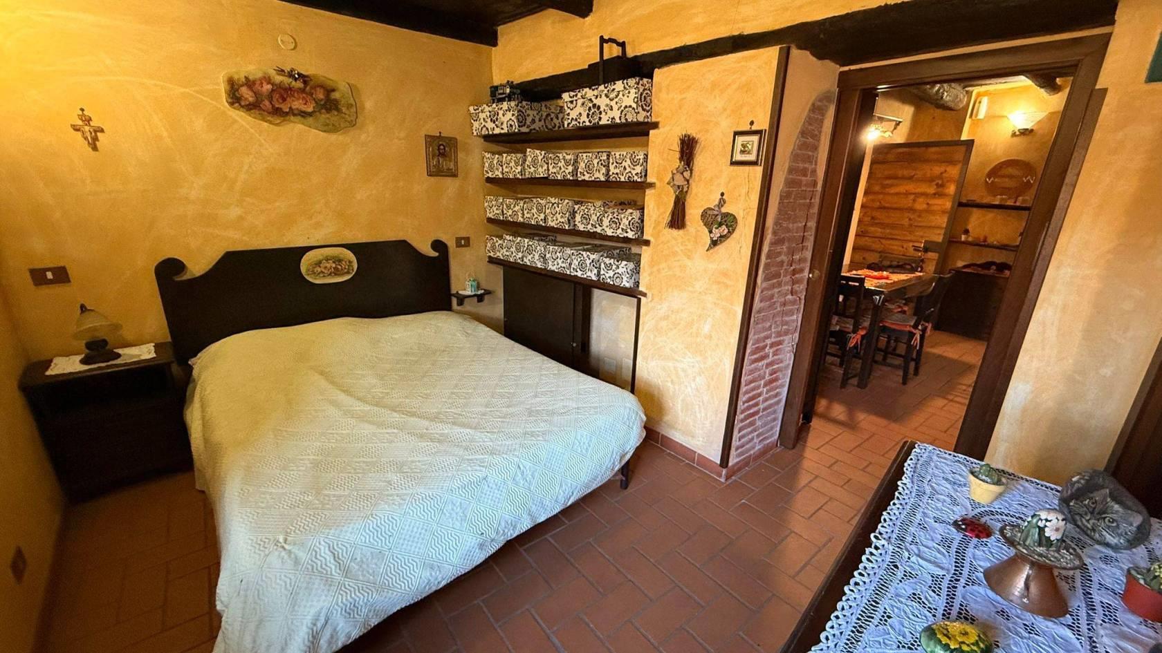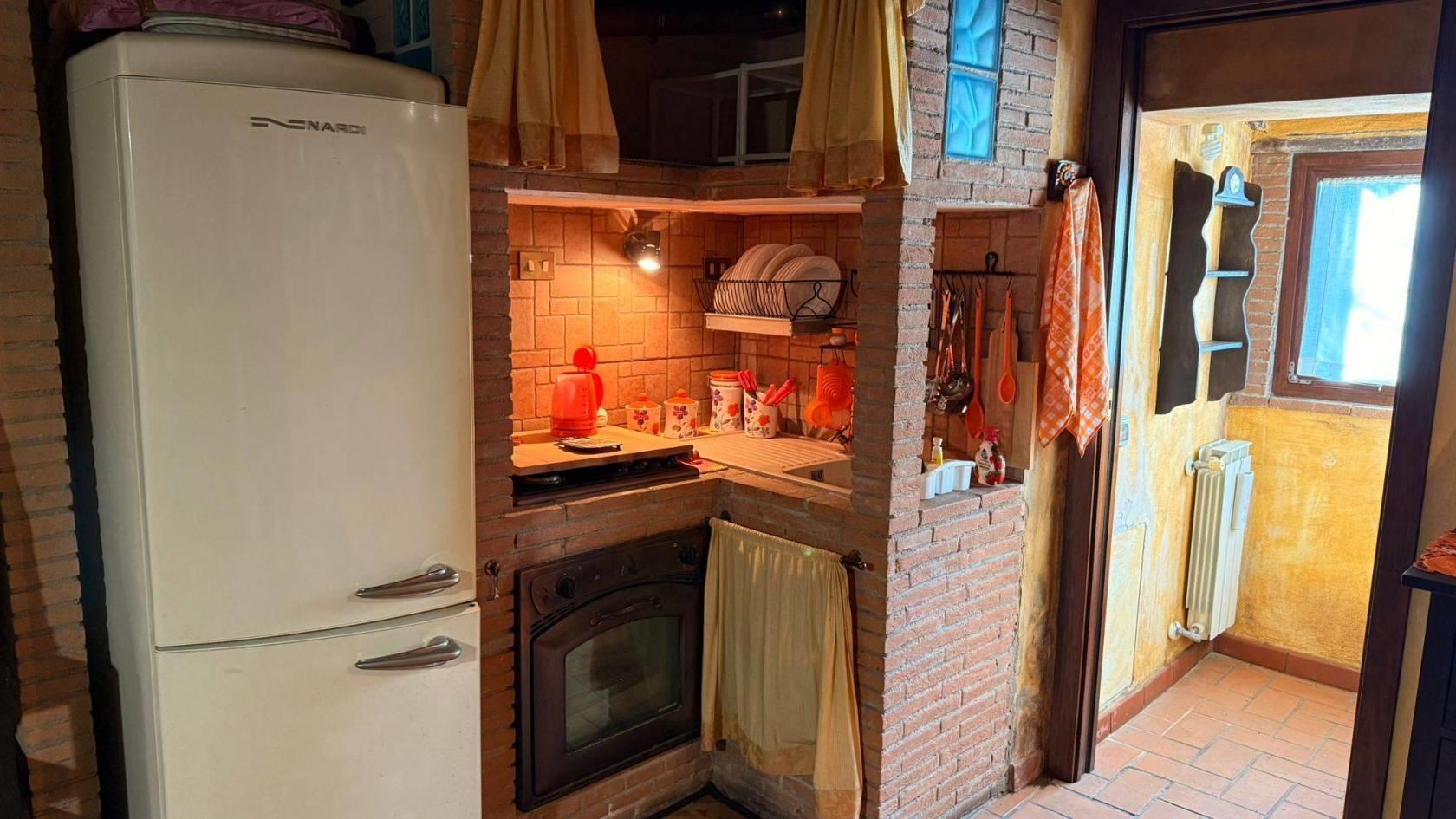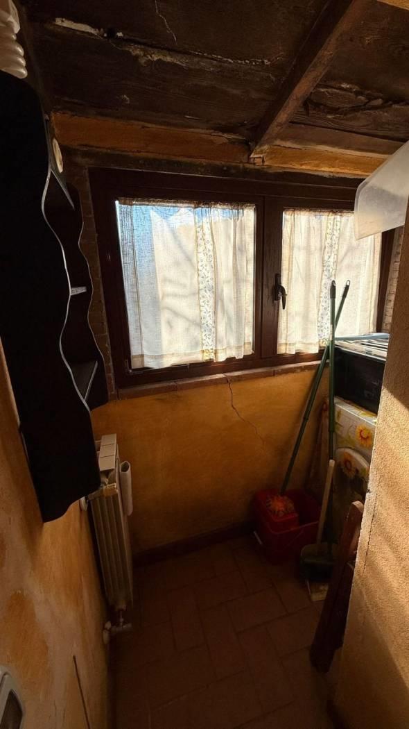 L’ingresso si apre su un ampio soggiorno con angolo cottura in stile rustico, impreziosito da travi in legno a vista, pareti in pietra e dettagli in muratura che richiamano il fascino delle case di una volta.