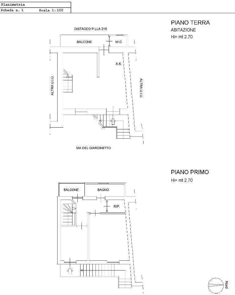 Via del Giardinetto, palazzetto cielo-terra con entrata indipendente su due livelli: P.T. Soggiorno con angolo cottura e bagno di servizio. P. 1 Camera, cameretta, bagno e balcone. Ristrutturato.