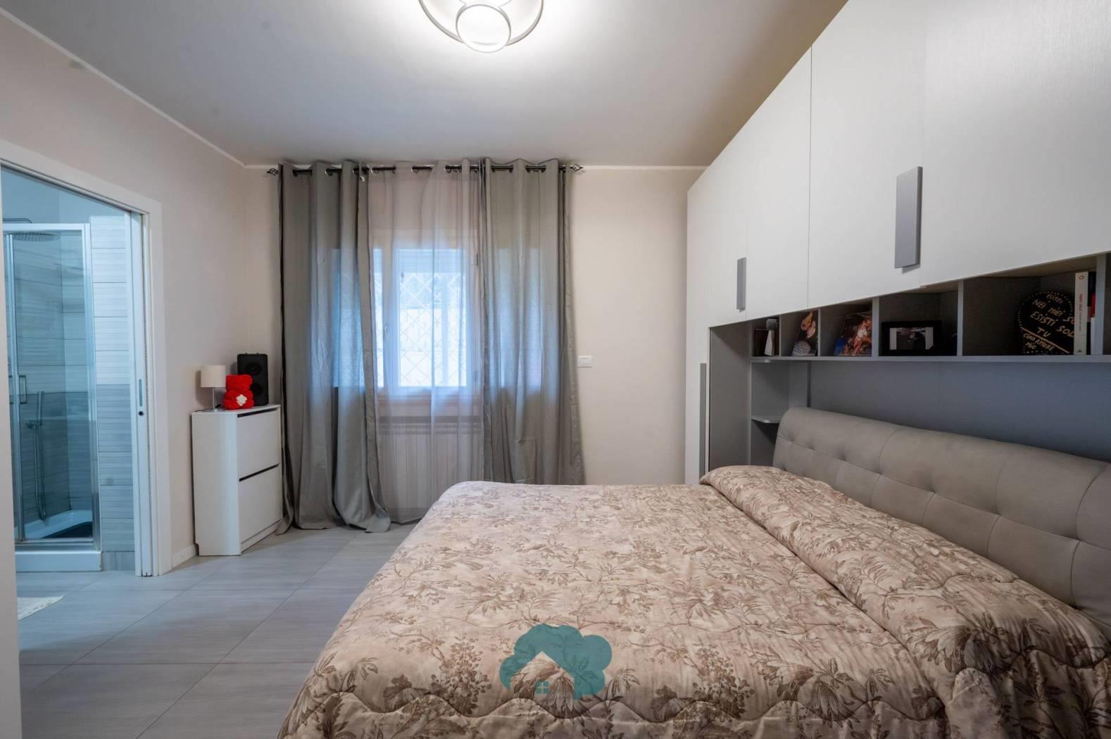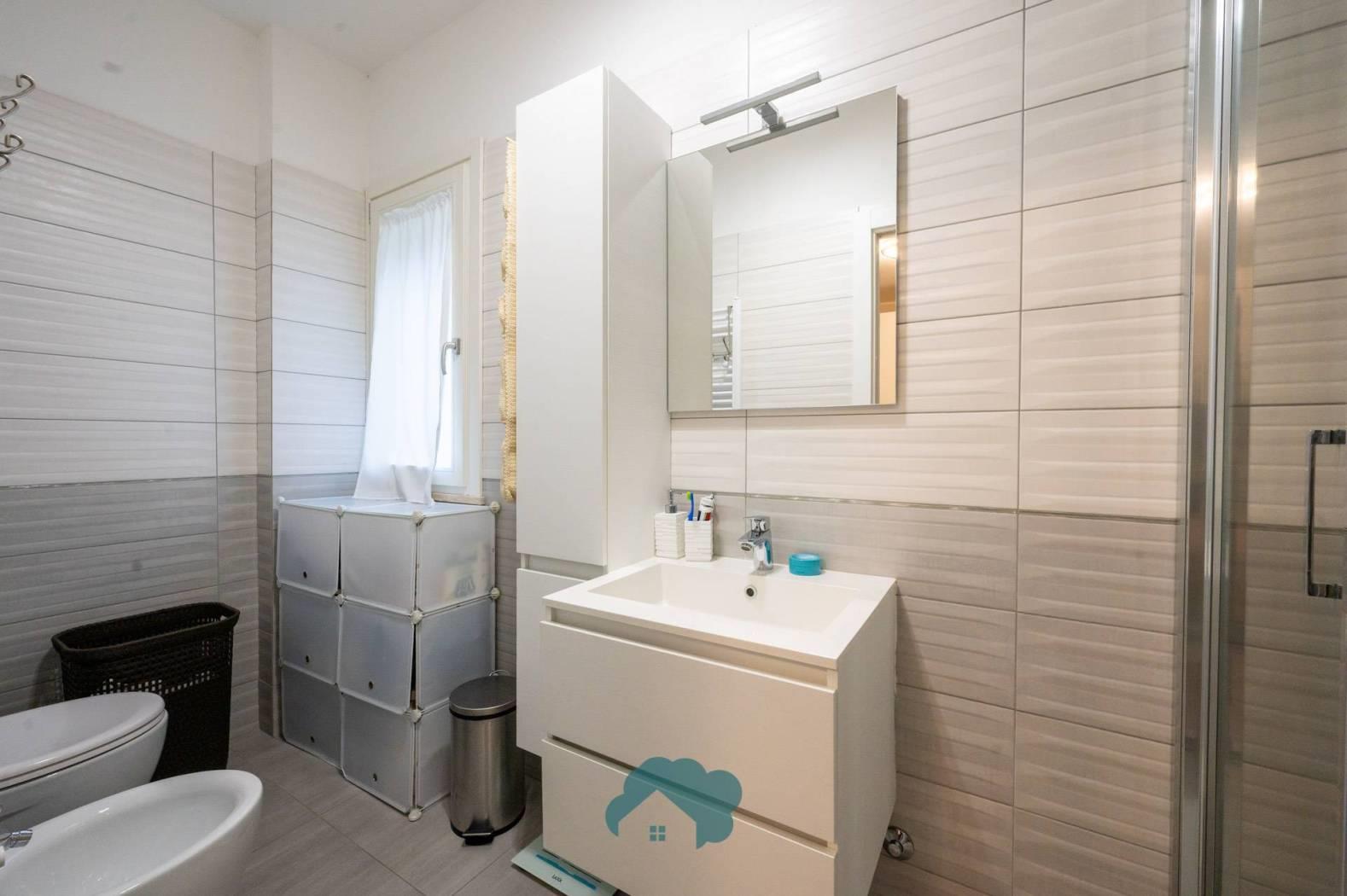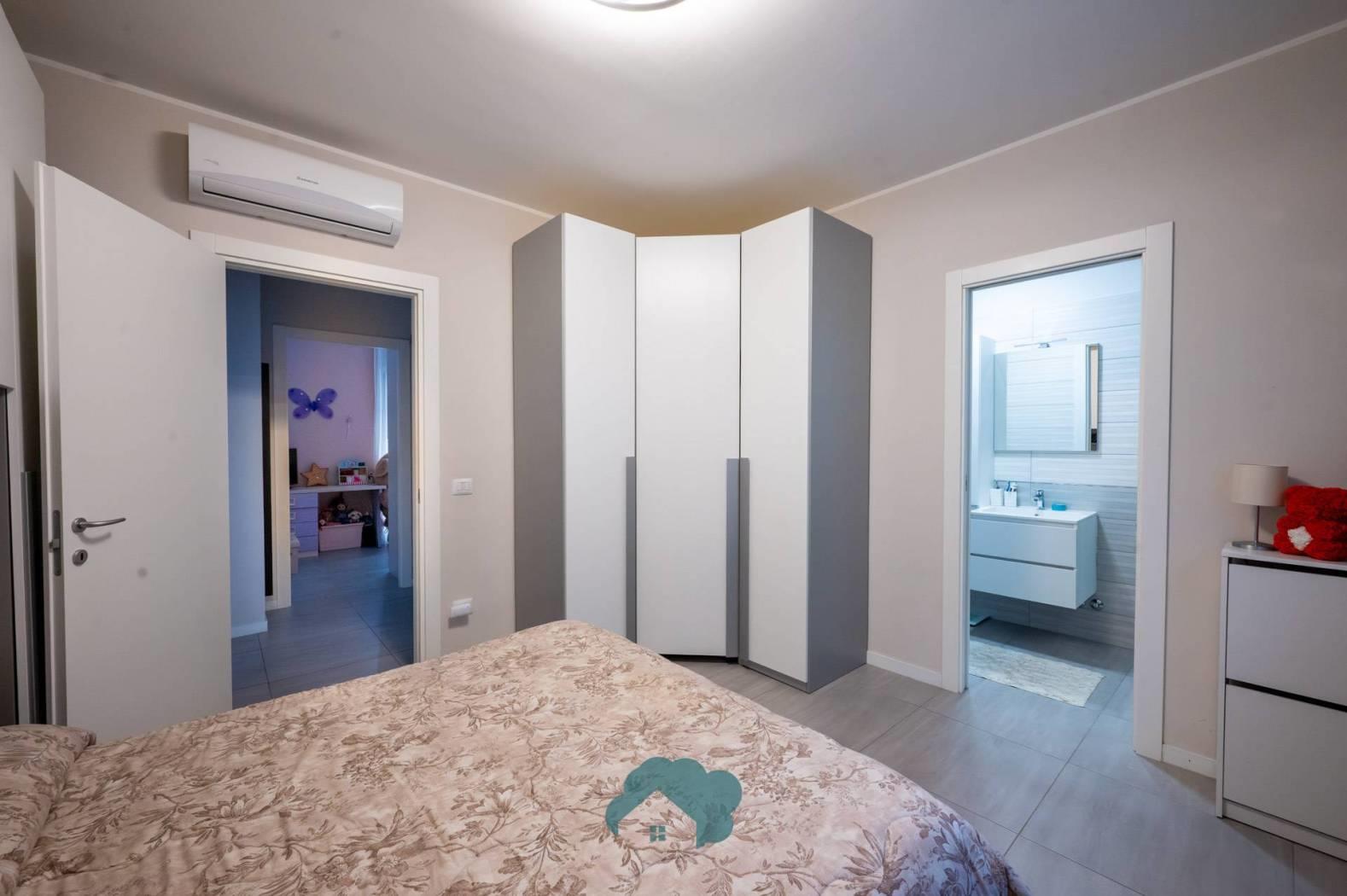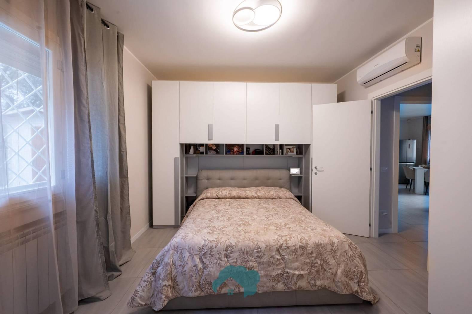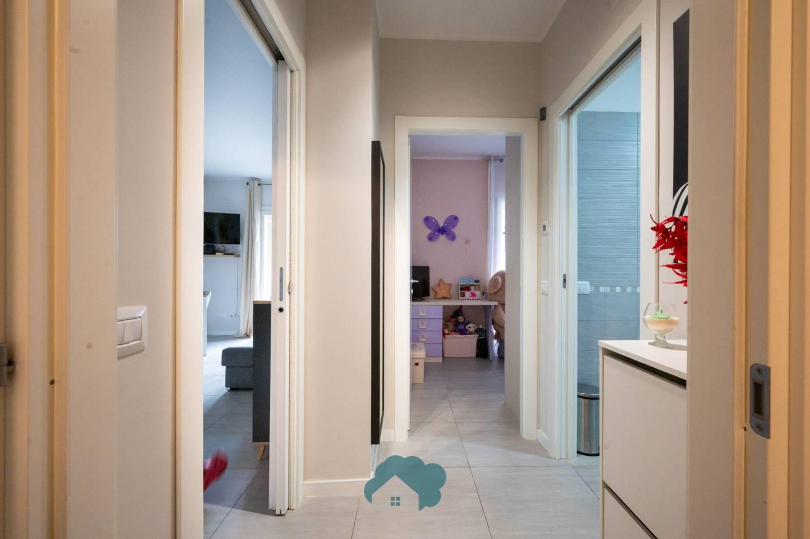 L'appartamento è così suddiviso: salone con angolo cottura con uscita sul portico, disimpegno, camera da letto matrimoniale con bagno finestrato dotato di doccia, cameretta con uscita sul portico e secondo bagno finestrato e con vasca.