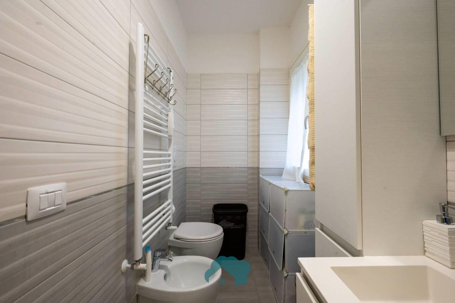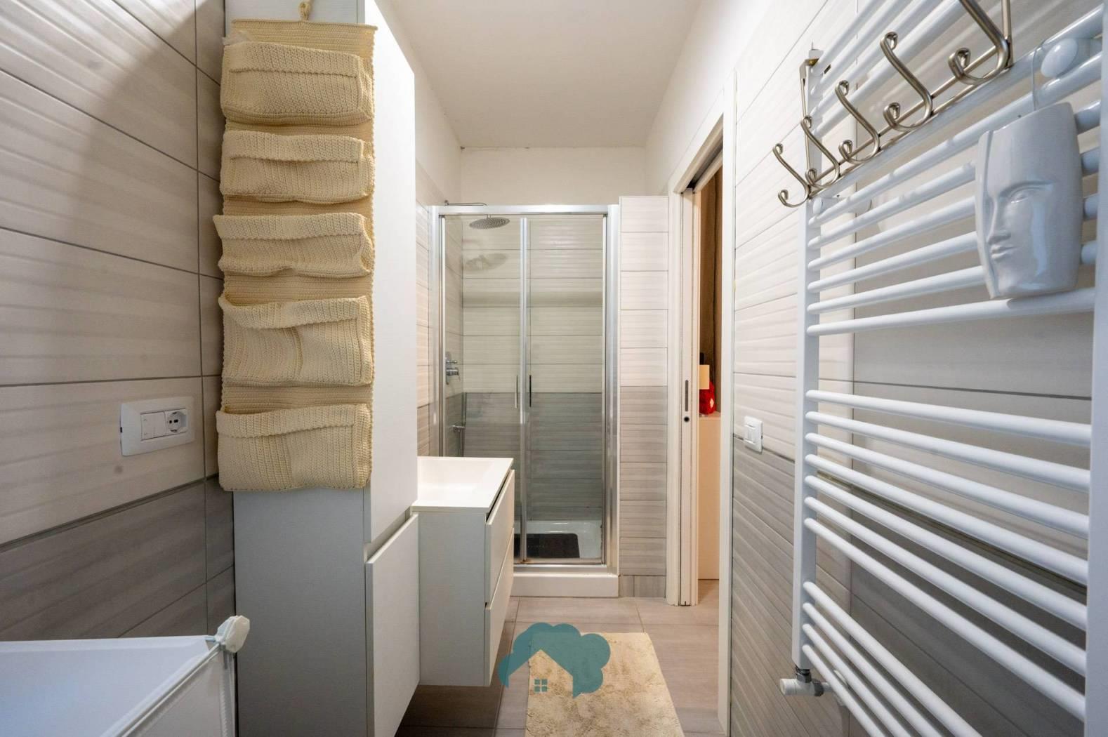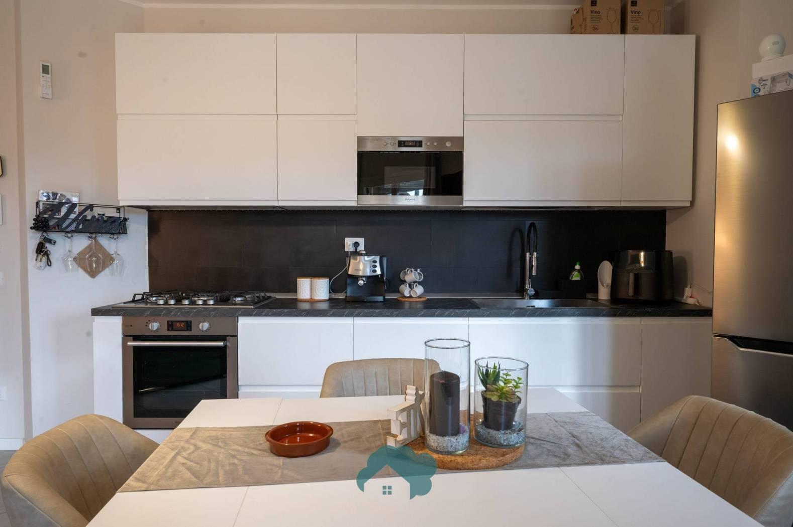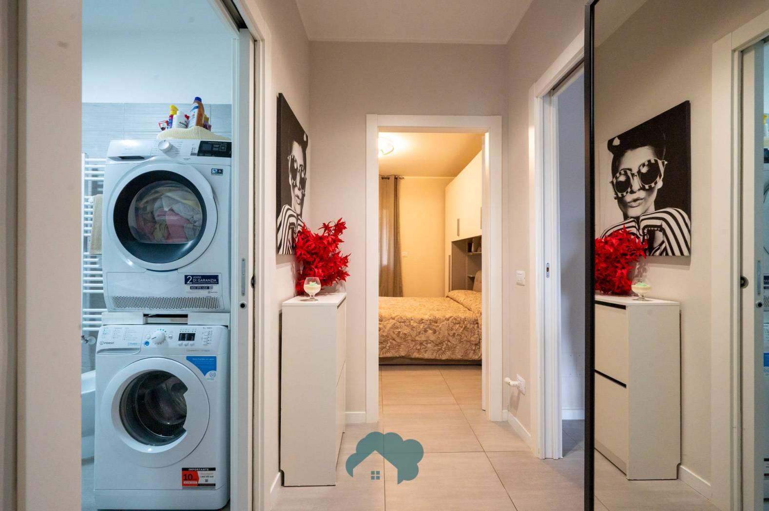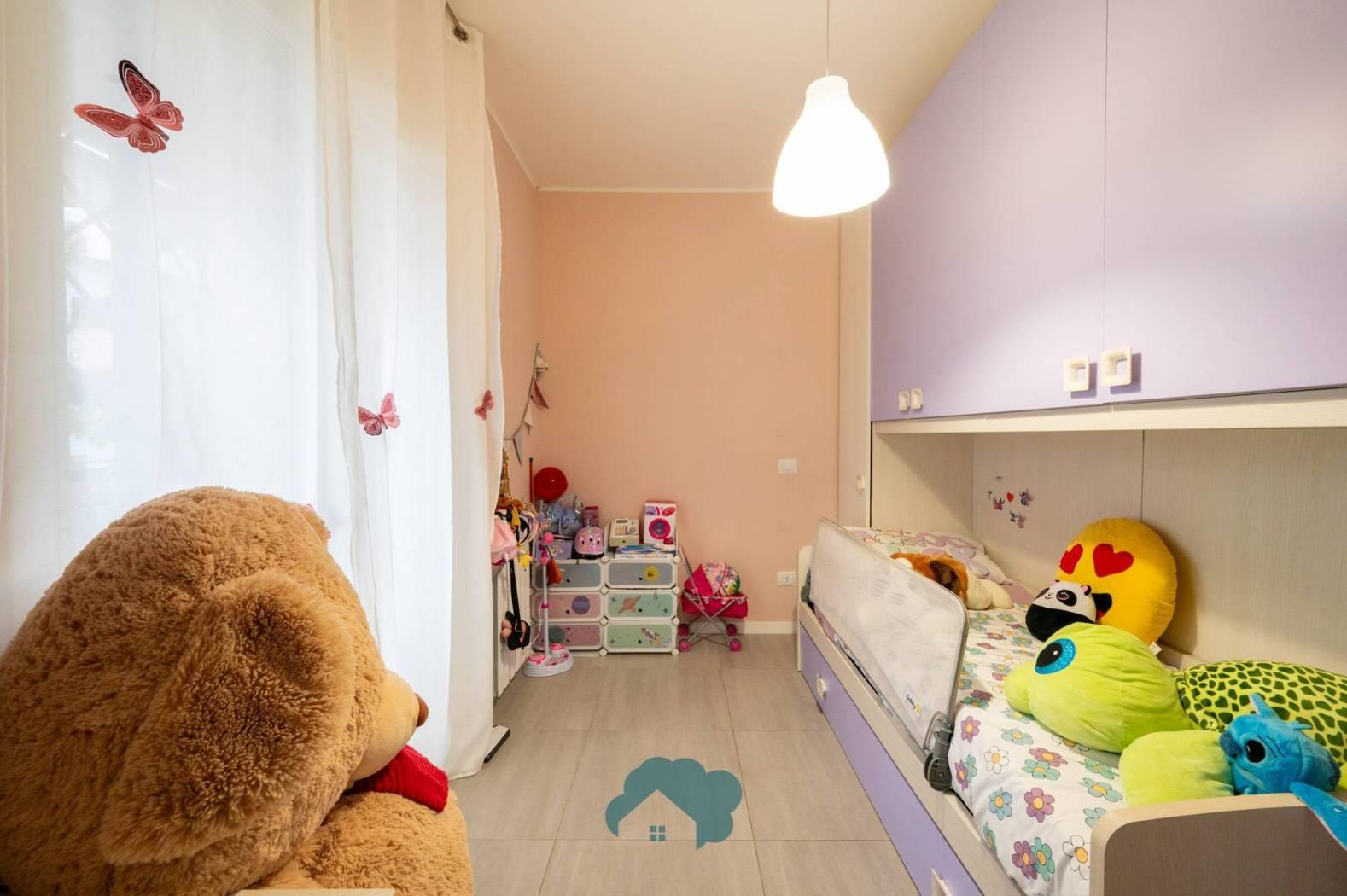 L'appartamento è così suddiviso: salone con angolo cottura con uscita sul portico, disimpegno, camera da letto matrimoniale con bagno finestrato dotato di doccia, cameretta con uscita sul portico e secondo bagno finestrato e con vasca.