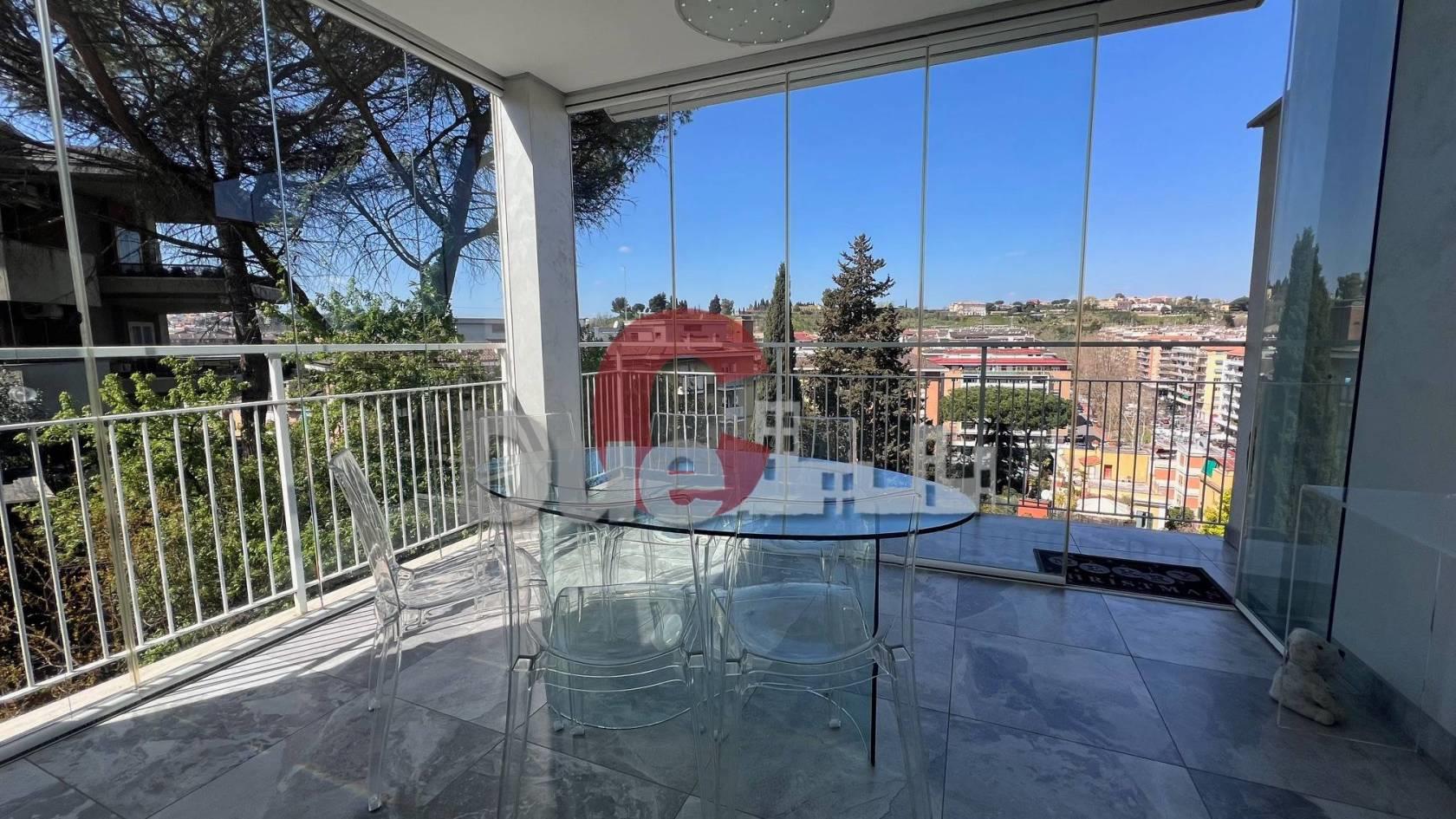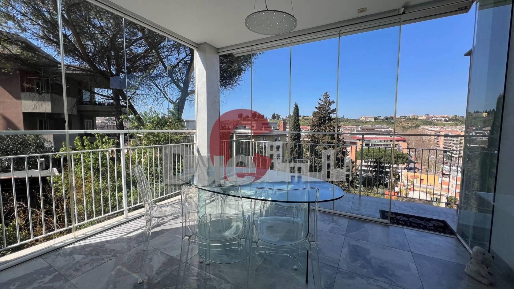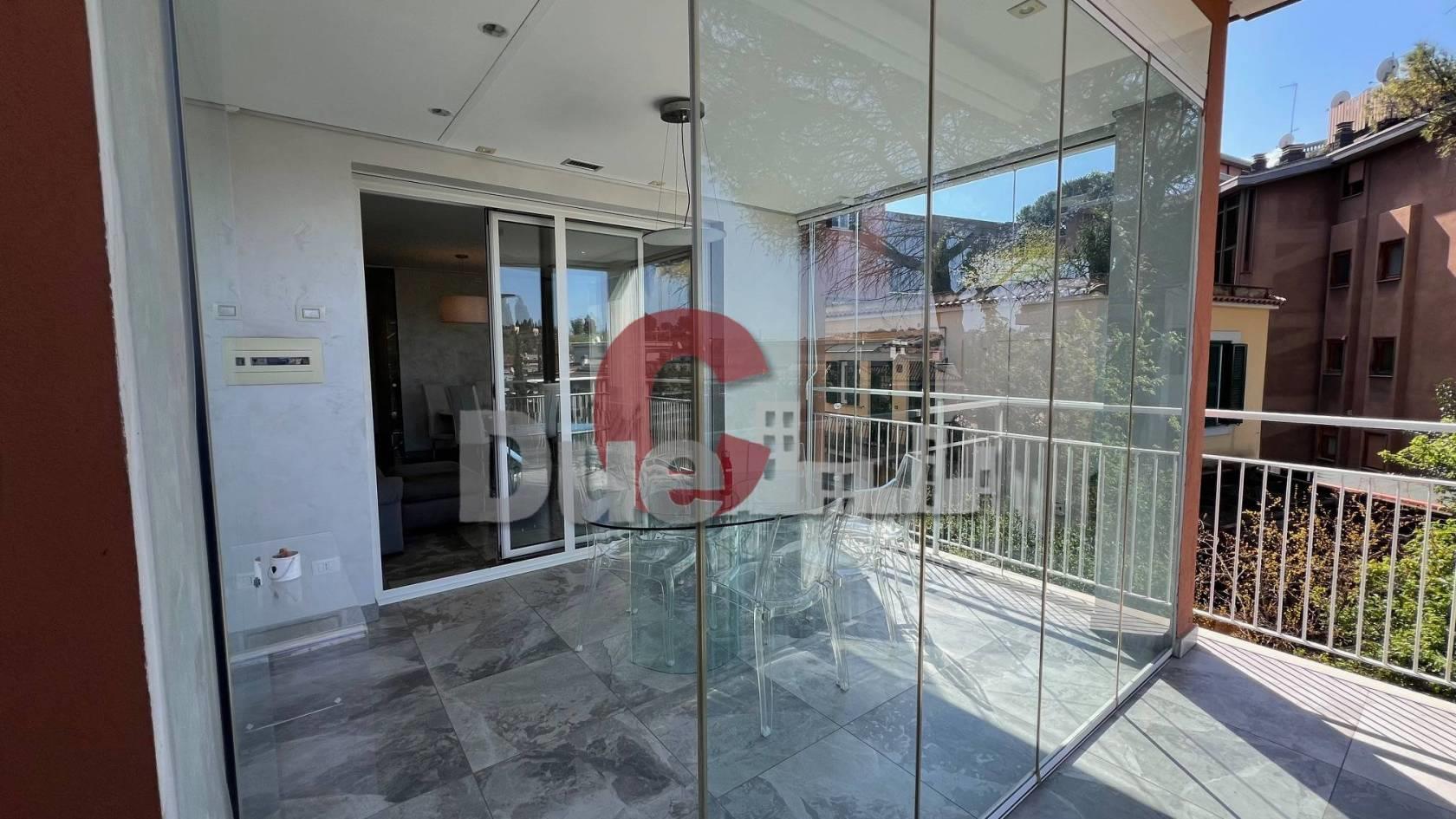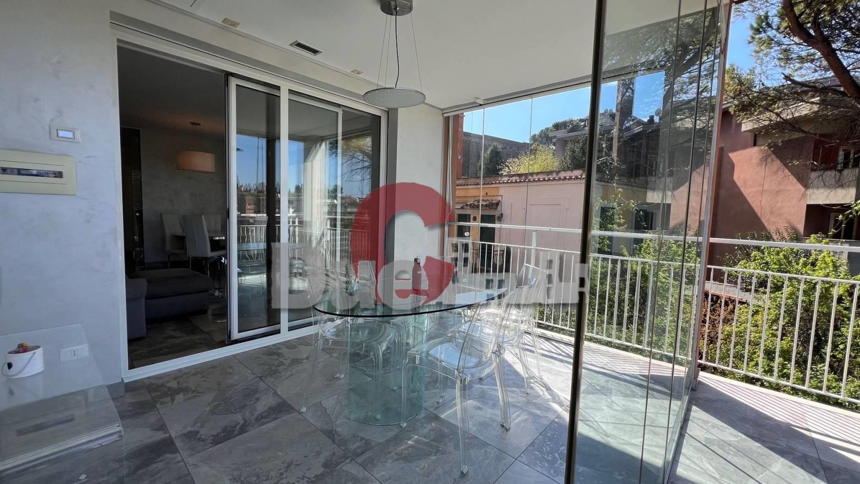Appartamento con tripla esposizione, completamente ristrutturato con materiali di pregio, posto comodamente al piano terra dall'ingresso mentre dalla parte del terrazzo al 5 piano. L'appartamento è composto da: ingresso con porta blindata su un disimpegno ed accesso ad un piccolo ripostiglio con cassettiera porta oggetti e impiantistica elettrica ed allarme. Soggiorno ampio con doppia finestra di cui una grande e scorrevole, per l'accesso al terrazzo/veranda e balcone. Dal soggiorno si accede alla cucina tramite un doppio passaggio con pareti divisorie in vetro. La cucina è completamente arredata come da foto, con il frigorifero e lavastoviglie appena sostituiti. Dalla cucina si accede al secondo balcone, con lavabo, attacco gas per barbecue esterno. Dal corridoio si accede alla camera da letto arredata da grande armadio a 6 ante e due comodini, sempre dal corridoio si accede al bagno grande con doccia e sanitari separati. Sempre dal corridoio si accede alla seconda cameretta con balcone e bagno privato. L'immobile è dotato di tutte le finestre a chiusura motorizzata elettrica, gli infissi sono in alluminio doppio vetro camera, le porte in legno laccato bianco sono di marca Garofalo, impianto di riscaldamento con caldaia a condensazione e distribuzione radiante a soffitto con VMC. Impianto di ricircolo ventilazione aria (incluso). Impianti elettrici, termici ed idraulici, completamente nuovi. Impianto di antifurto con centrale, contatti su tutti gli infissi e segnalatori interni. In veranda ci sono due tende da sole, una elettrica con telecomando ed una manuale, nel balcone della cucina ci sono due teli per la tenda manuale, uno invernale ed uno estivo. La casa viene venduta completa di arredamenti come da foto. Posto auto di proprietà (11 mq), con ingresso carrabile nel condominio, nella proprietà è inclusa una cantina al piano -2 di circa 4mq. Inferiate nella camera da letto e finestra nel corridoio e bagno padronale. Lo stato dell'immobile non presenta parti da ristrutturare, salvo una rinfrescata alle pareti, con cambio tinta di vernice a piacimento. Con lo stesso impianto di riscaldamento radiante a soffitto, si può ottenere il raffrescamento della casa, posizionando un corpo macchina (NON COMPRESO) sul balcone della veranda. Palazzo con cappotto termico. Totali 5 tende da sole di cui una elettrica con sensore pioggia e chiusura automatica ed una con allestimento estate e inverno (Doppio telo). Info e documenti in sede. Leggera trattabilità!
