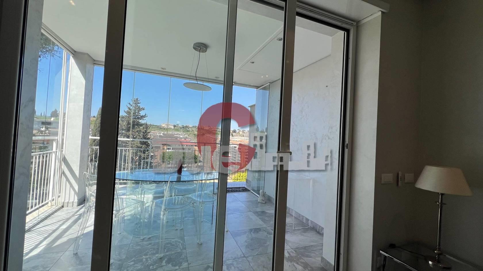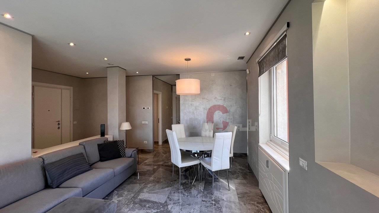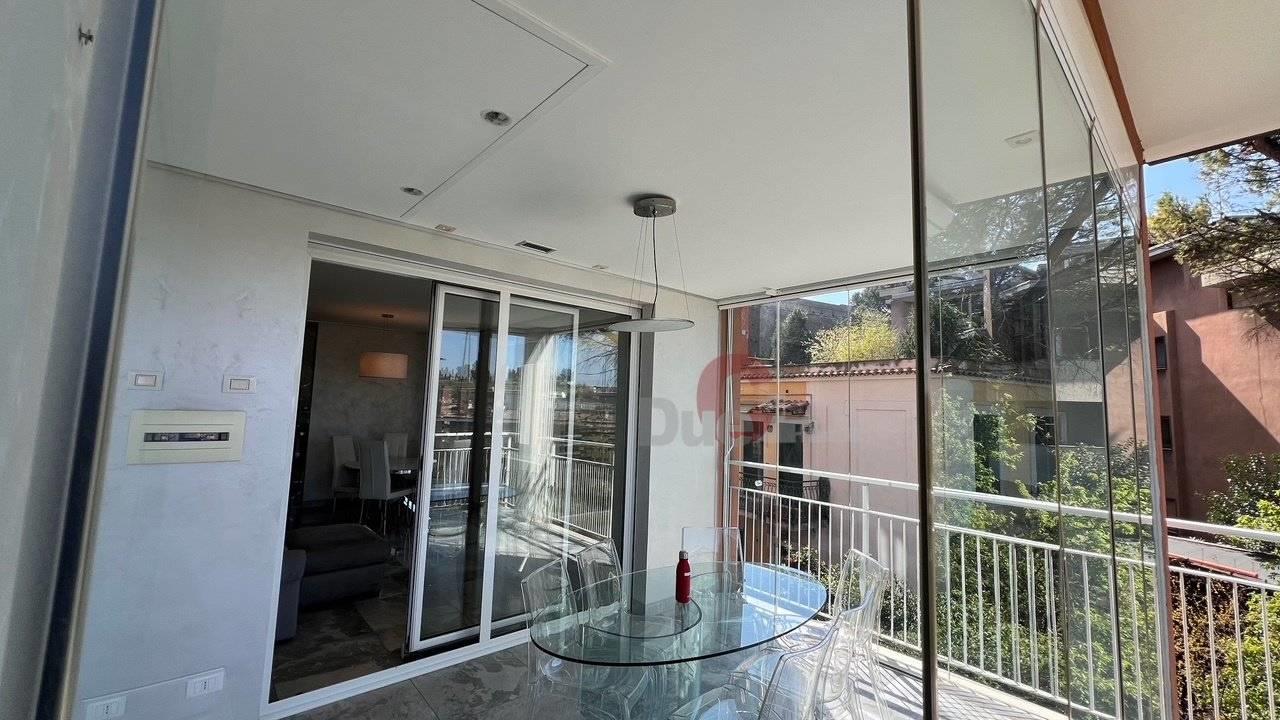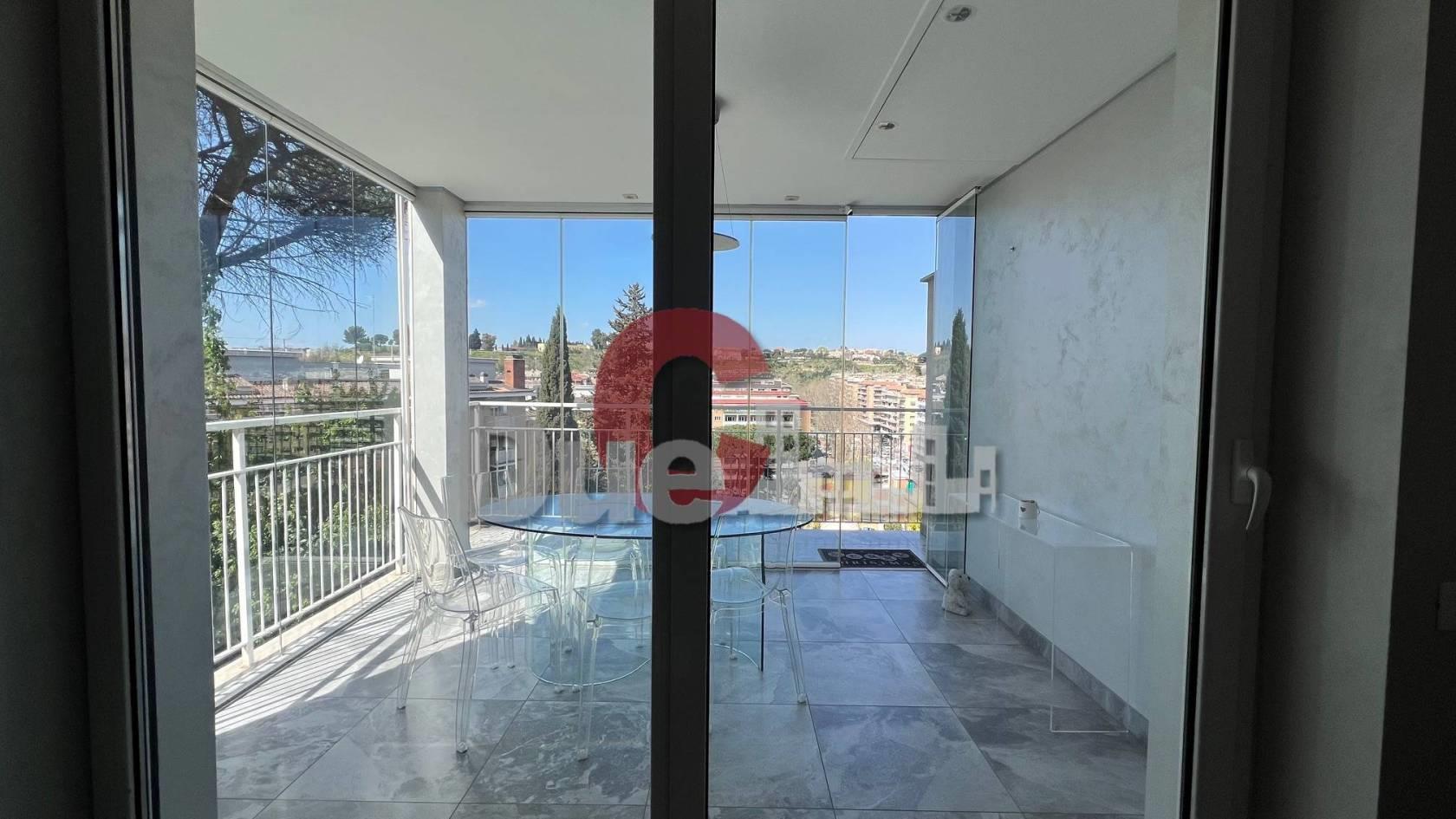 Appartamento con tripla esposizione, completamente ristrutturato con materiali di pregio, posto comodamente al piano terra dall'ingresso mentre dalla parte del terrazzo al 5 piano. L'appartamento è composto da: ingresso con porta blindata su un disimpegno ed accesso ad un piccolo ripostiglio con cassettiera porta oggetti e impiantistica elettrica ed allarme. Soggiorno ampio con doppia finestra di cui una grande e scorrevole, per l'accesso al terrazzo/veranda e balcone. Dal soggiorno si accede alla cucina tramite un doppio passaggio con pareti divisorie in vetro. La cucina è completamente arredata come da foto, con il frigorifero e lavastoviglie appena sostituiti. Dalla cucina si accede al secondo balcone, con lavabo, attacco gas per barbecue esterno. Dal corridoio si accede alla camera da letto arredata da grande armadio a 6 ante e due comodini, sempre dal corridoio si accede al bagno grande con doccia e sanitari separati. Sempre dal corridoio si accede alla seconda cameretta con balcone e bagno privato. L'immobile è dotato di tutte le finestre a chiusura motorizzata elettrica, gli infissi sono in alluminio doppio vetro camera, le porte in legno laccato bianco sono di marca Garofalo, impianto di riscaldamento con caldaia a condensazione e distribuzione radiante a soffitto con VMC. Impianto di ricircolo ventilazione aria (incluso). Impianti elettrici, termici ed idraulici, completamente nuovi. Impianto di antifurto con centrale, contatti su tutti gli infissi e segnalatori interni. In veranda ci sono due tende da sole, una elettrica con telecomando ed una manuale, nel balcone della cucina ci sono due teli per la tenda manuale, uno invernale ed uno estivo. La casa viene venduta completa di arredamenti come da foto. Posto auto di proprietà (11 mq), con ingresso carrabile nel condominio, nella proprietà è inclusa una cantina al piano -2 di circa 4mq. Inferiate nella camera da letto e finestra nel corridoio e bagno padronale. Lo stato dell'immobile non presenta parti da ristrutturare, salvo una rinfrescata alle pareti, con cambio tinta di vernice a piacimento. Con lo stesso impianto di riscaldamento radiante a soffitto, si può ottenere il raffrescamento della casa, posizionando un corpo macchina (NON COMPRESO) sul balcone della veranda. Palazzo con cappotto termico. Totali 5 tende da sole di cui una elettrica con sensore pioggia e chiusura automatica ed una con allestimento estate e inverno (Doppio telo). Info e documenti in sede. Leggera trattabilità!