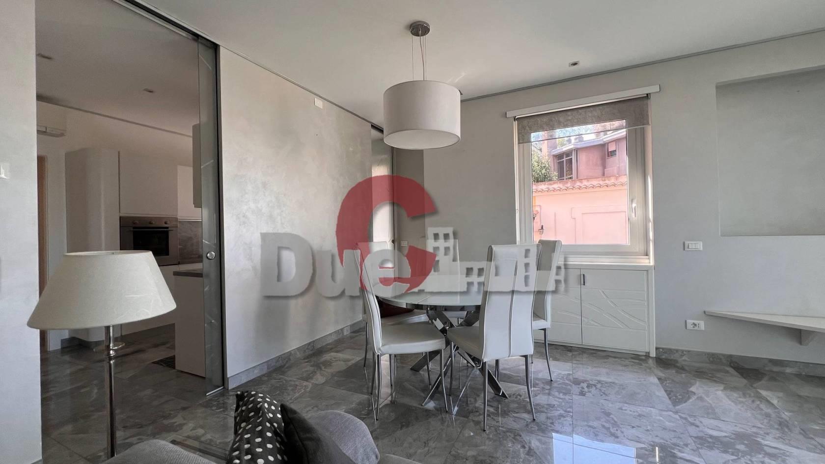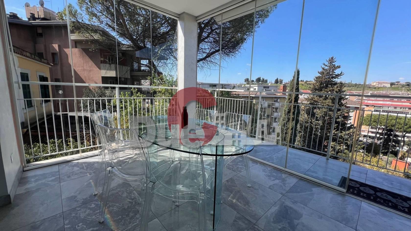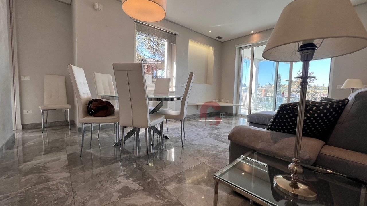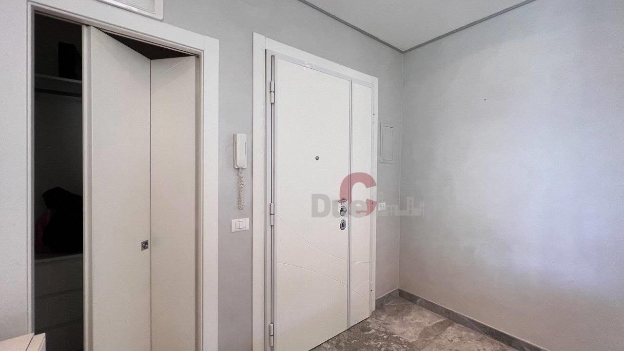 Appartamento con tripla esposizione, completamente ristrutturato con materiali di pregio, posto comodamente al piano terra dall'ingresso mentre dalla parte del terrazzo al 5 piano. L'appartamento è composto da: ingresso con porta blindata su un disimpegno ed accesso ad un piccolo ripostiglio con cassettiera porta oggetti e impiantistica elettrica ed allarme. Soggiorno ampio con doppia finestra di cui una grande e scorrevole, per l'accesso al terrazzo/veranda e balcone. Dal soggiorno si accede alla cucina tramite un doppio passaggio con pareti divisorie in vetro. La cucina è completamente arredata come da foto, con il frigorifero e lavastoviglie appena sostituiti. Dalla cucina si accede al secondo balcone, con lavabo, attacco gas per barbecue esterno. Dal corridoio si accede alla camera da letto arredata da grande armadio a 6 ante e due comodini, sempre dal corridoio si accede al bagno grande con doccia e sanitari separati. Sempre dal corridoio si accede alla seconda cameretta con balcone e bagno privato. L'immobile è dotato di tutte le finestre a chiusura motorizzata elettrica, gli infissi sono in alluminio doppio vetro camera, le porte in legno laccato bianco sono di marca Garofalo, impianto di riscaldamento con caldaia a condensazione e distribuzione radiante a soffitto con VMC. Impianto di ricircolo ventilazione aria (incluso). Impianti elettrici, termici ed idraulici, completamente nuovi. Impianto di antifurto con centrale, contatti su tutti gli infissi e segnalatori interni. In veranda ci sono due tende da sole, una elettrica con telecomando ed una manuale, nel balcone della cucina ci sono due teli per la tenda manuale, uno invernale ed uno estivo. La casa viene venduta completa di arredamenti come da foto. Posto auto di proprietà (11 mq), con ingresso carrabile nel condominio, nella proprietà è inclusa una cantina al piano -2 di circa 4mq. Inferiate nella camera da letto e finestra nel corridoio e bagno padronale. Lo stato dell'immobile non presenta parti da ristrutturare, salvo una rinfrescata alle pareti, con cambio tinta di vernice a piacimento. Con lo stesso impianto di riscaldamento radiante a soffitto, si può ottenere il raffrescamento della casa, posizionando un corpo macchina (NON COMPRESO) sul balcone della veranda. Palazzo con cappotto termico. Totali 5 tende da sole di cui una elettrica con sensore pioggia e chiusura automatica ed una con allestimento estate e inverno (Doppio telo). Info e documenti in sede. Leggera trattabilità!