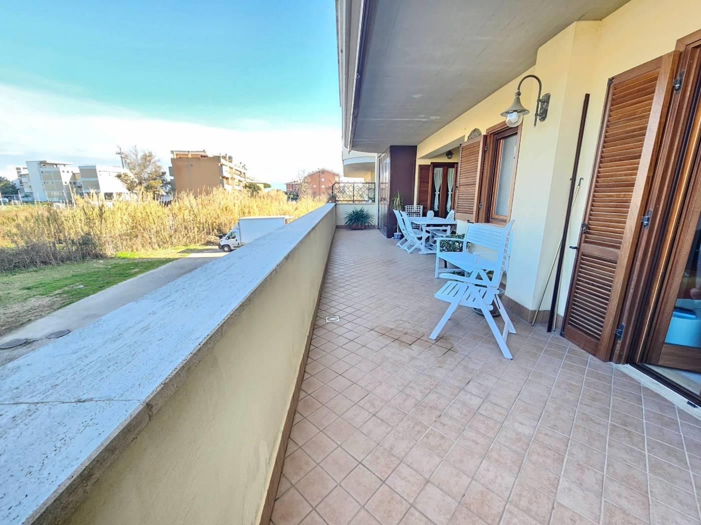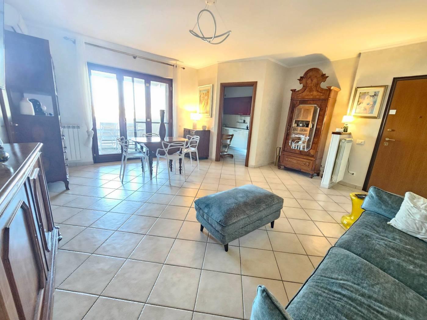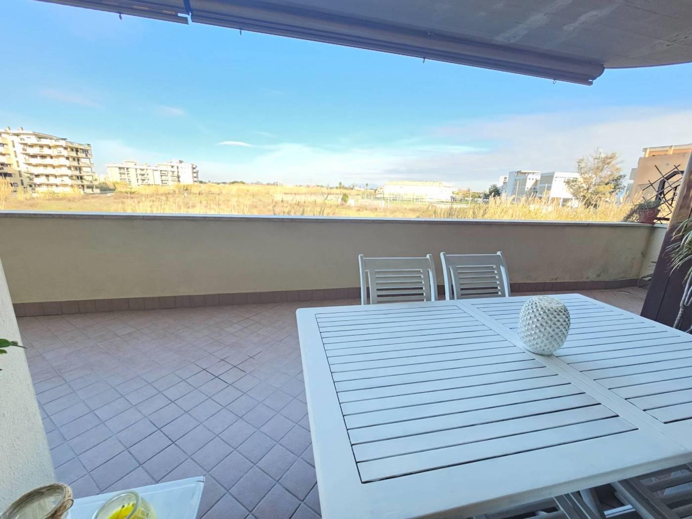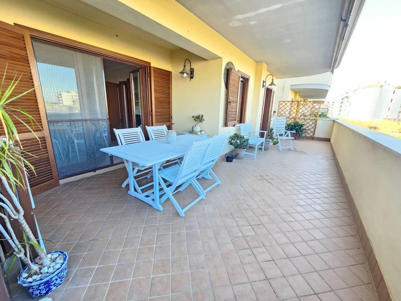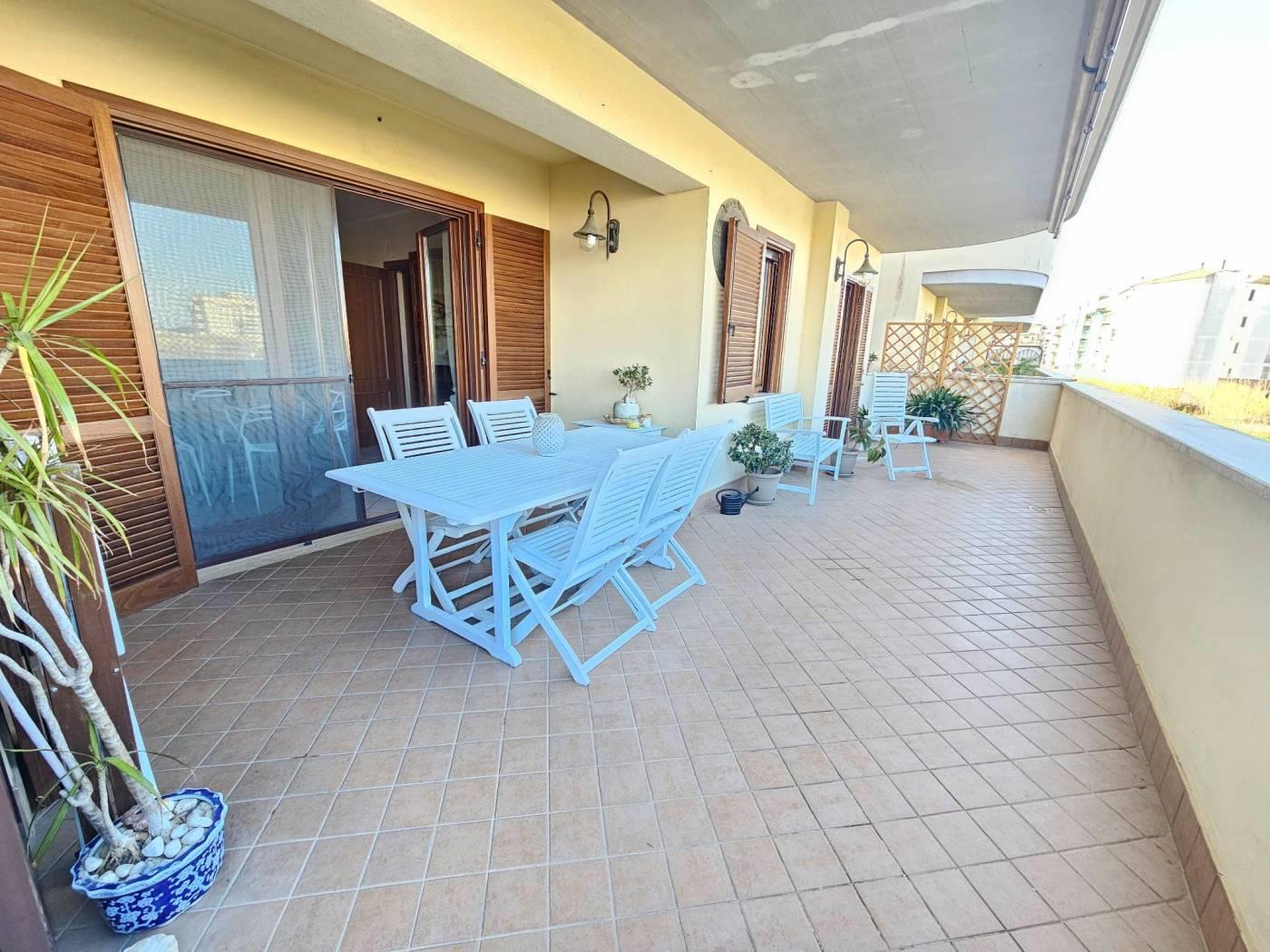 L'immobile è composto da: salone, cucina abitabile, disimpegno, camera matrimoniale con bagno interno servito da doccia, cameretta, secondo bagno finestrato con doccia idromassaggio e un ampio ripostiglio. La zona esterna vanta un vivibile terrazzo a livello accessoriato con tende da sole e un funzionale mobile in alluminio che ospita la caldaia, il motore dei condizionatori e l'angolo lavanderia (lavatrice e asciugatrice). Completano la proprietà un box auto di 25 mq e una cantina di 3 mq. L'appartamento si presenta in ottime condizioni, è dotato di zanzariere, riscaldamento autonomo e impianto di condizionamento. L'immobile vanta una Classe Energetica B, che consente di accedere a mutui a tasso agevolato (Mutui Green). La documentazione è completa di certificazioni degli impianti e certificato di agibilità. La zona è altamente servita: al piano stradale dello stabile è presente un supermercato , mentre a soli 100 metri si trovano farmacia e forno. Le scuole distano circa 400 metri ed il mare è raggiungibile a piedi (circa 600 metri).