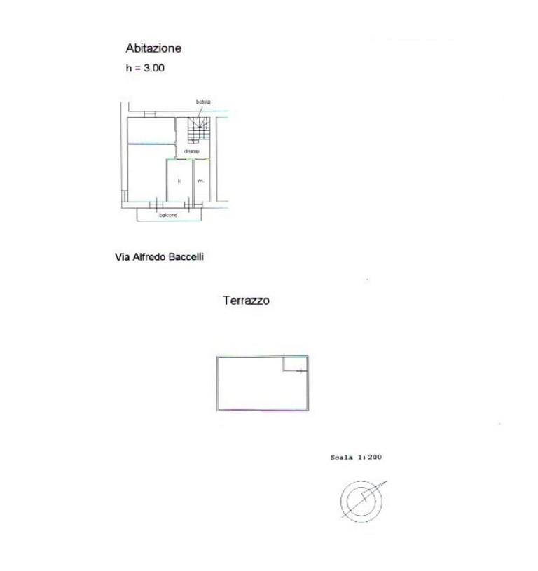 Via Baccelli, appartamento di 55 mq posto al piano secondo composto da ingresso, cucina, camera, cameretta, ripostiglio, balcone a livello e terrazzo sovrastante di 30 mq accessibile da scala interna. Panoramico.