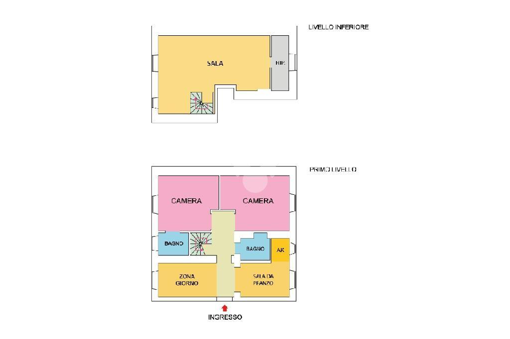 Attraverso una scala interna si accede al livello inferiore, di circa 40 mq, composto da un ampio ambiente unico e da un locale attualmente utilizzato come lavanderia e ripostiglio.