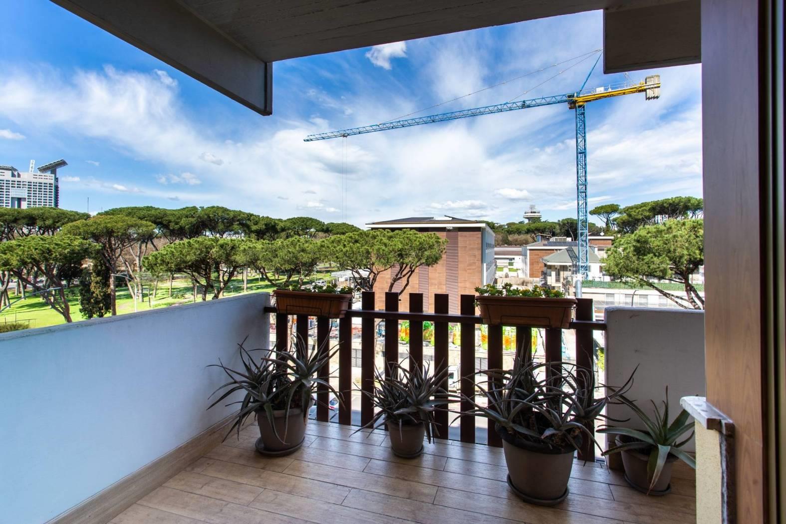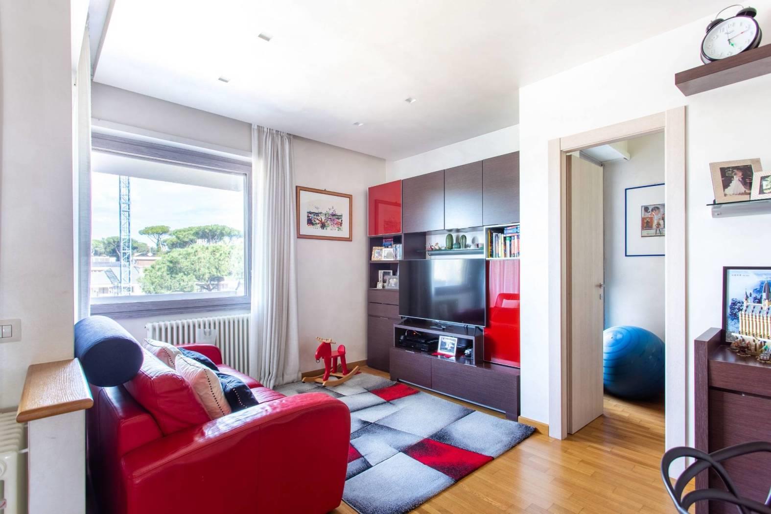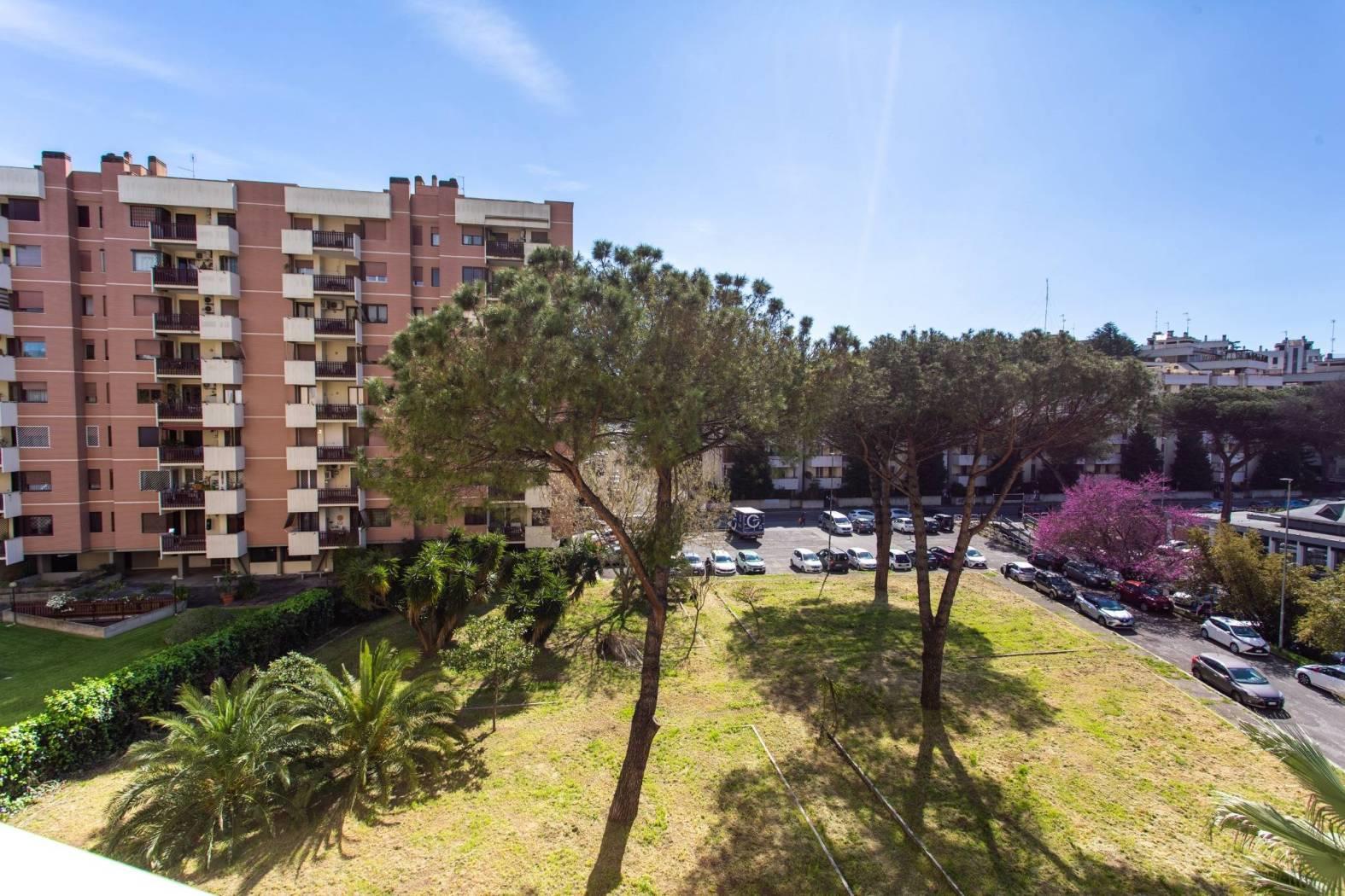 La zona giorno è affacciata su due ampi balconi vivibili con vista aperta sull’EUR da un lato e sul verde di quartiere dall’altro.
