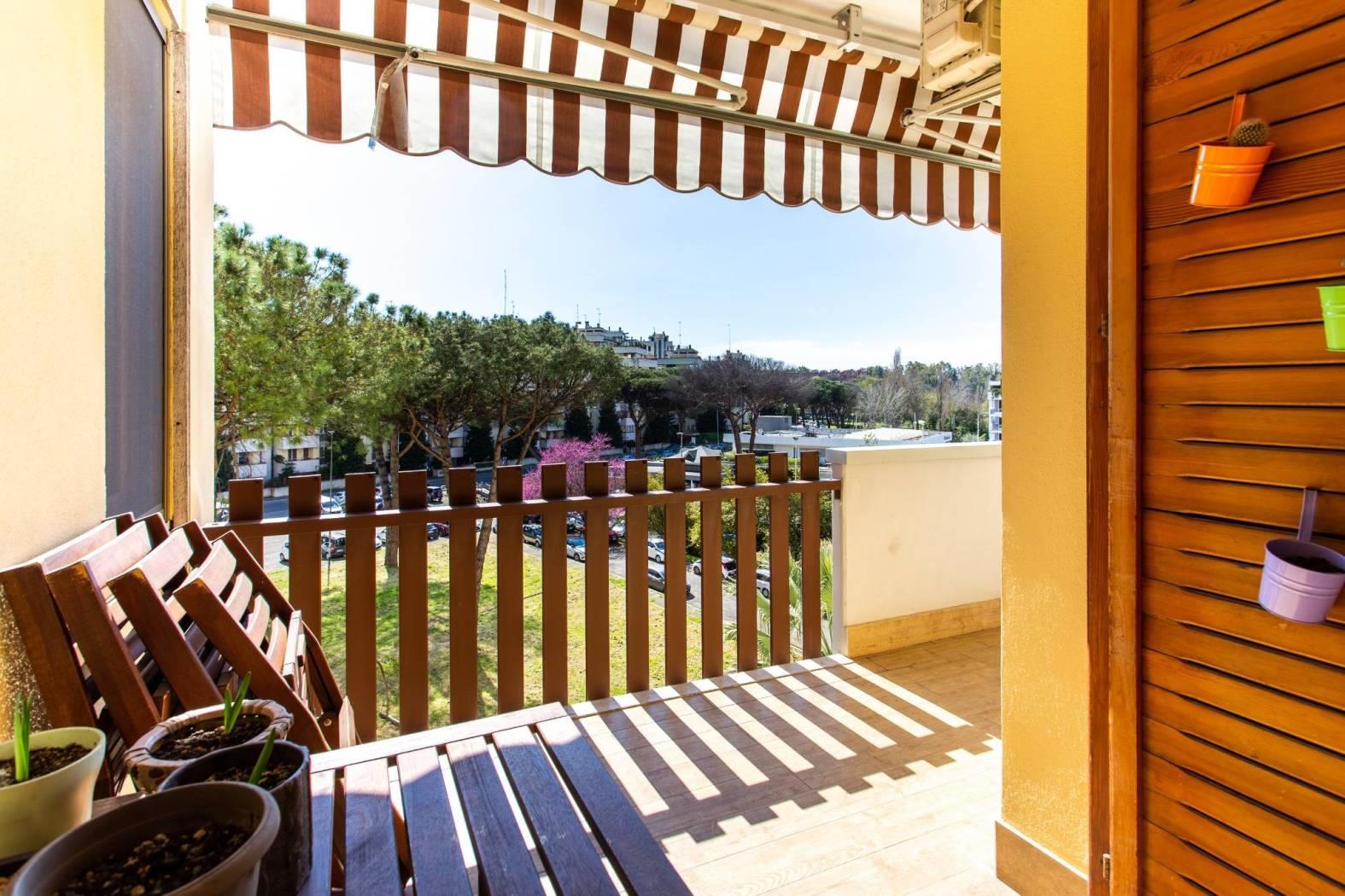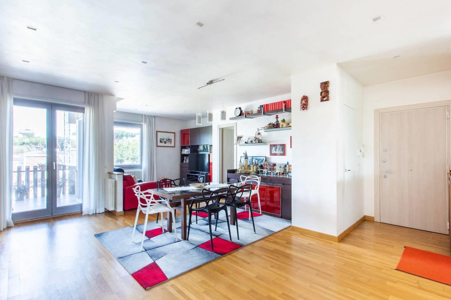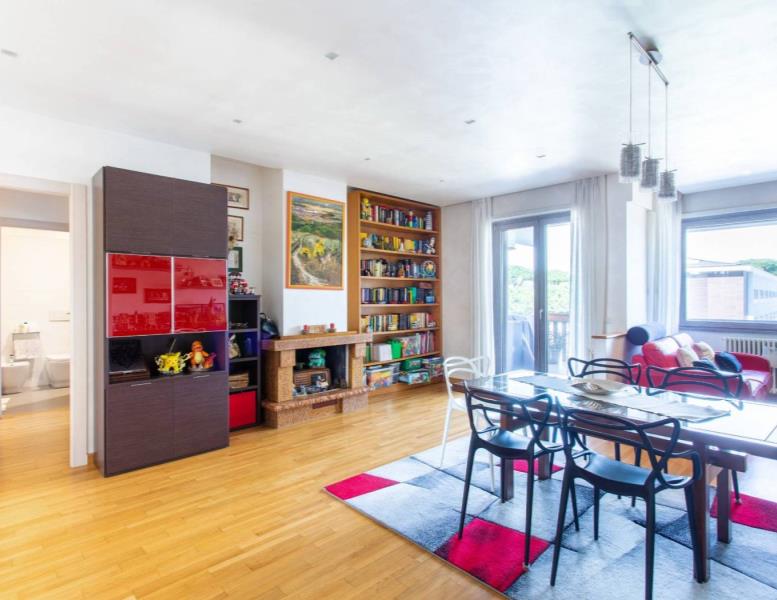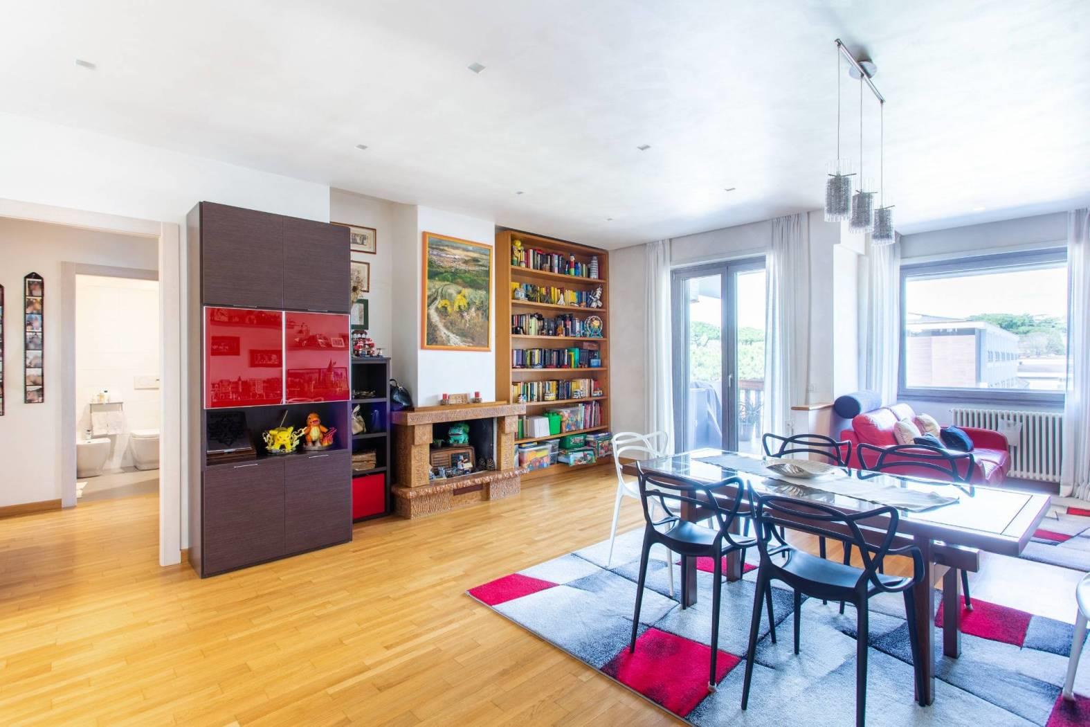 La zona giorno è affacciata su due ampi balconi vivibili con vista aperta sull’EUR da un lato e sul verde di quartiere dall’altro.