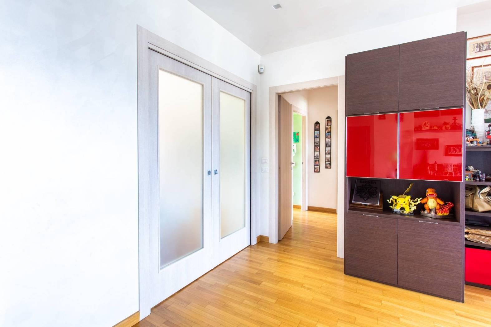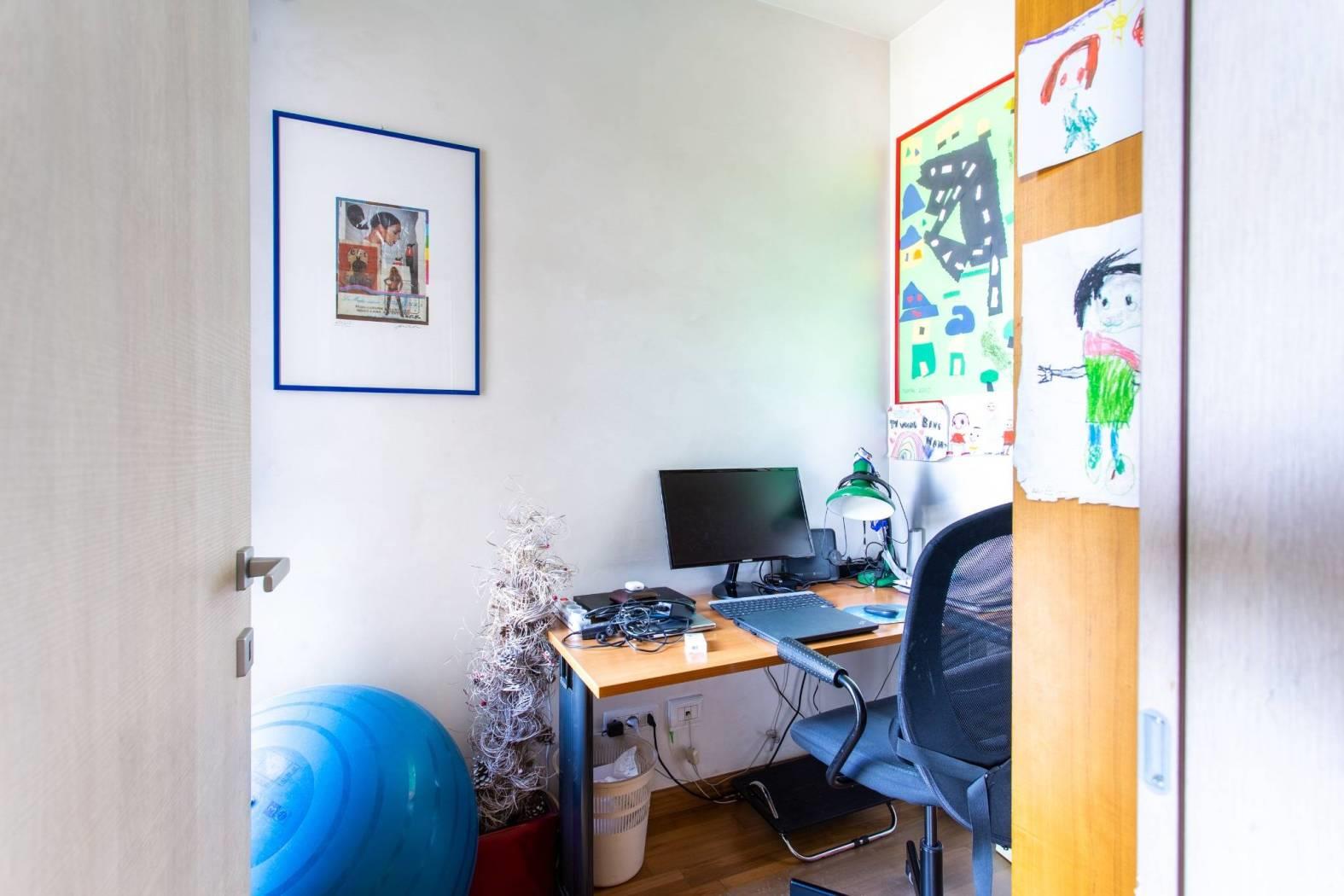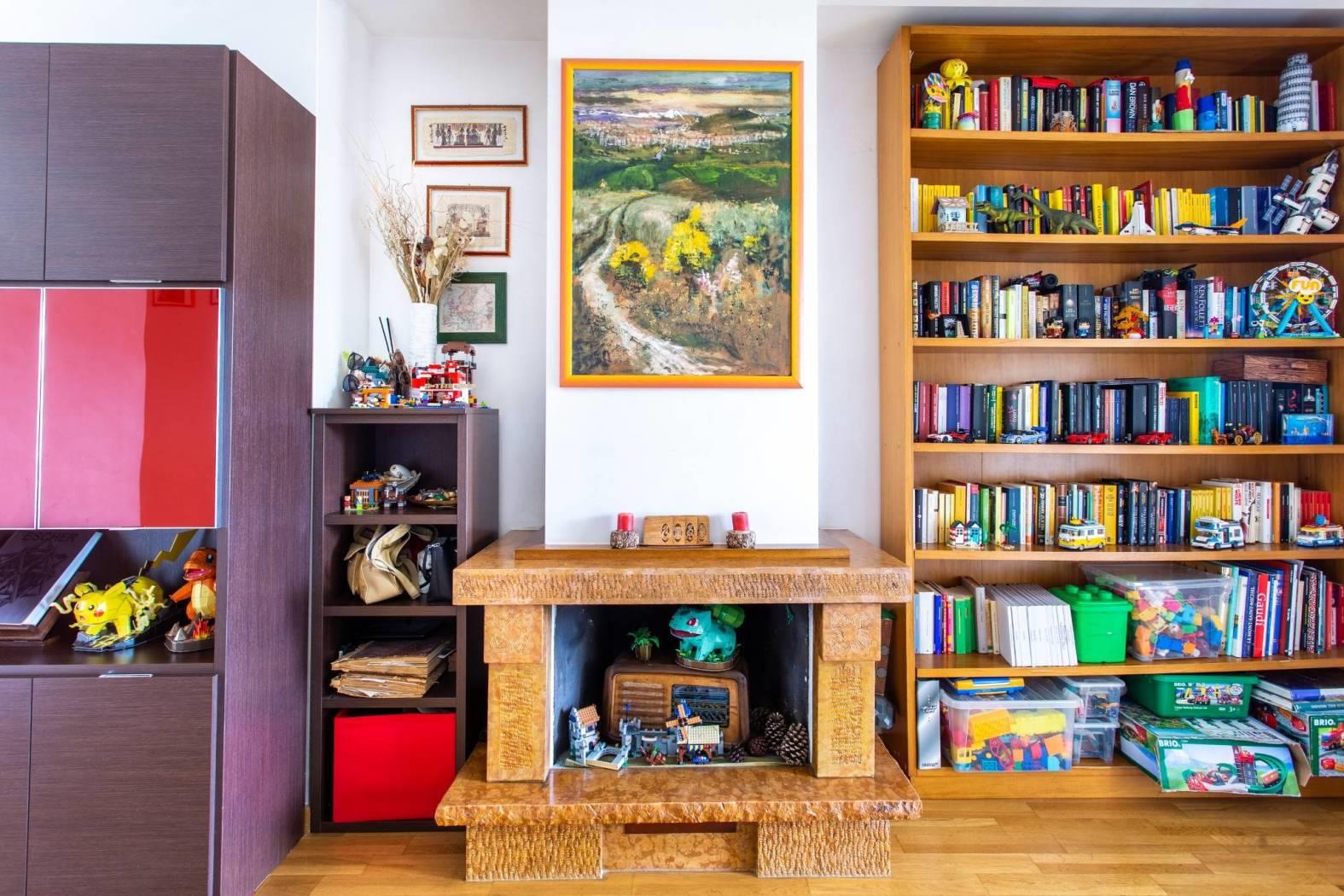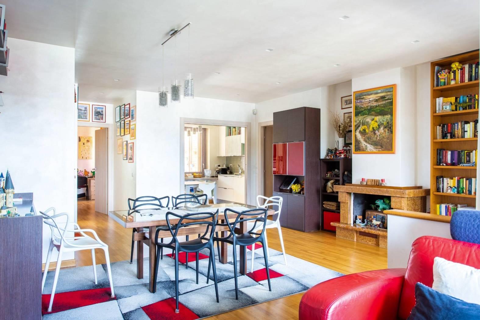L’appartamento con doppia esposizione nord/sud si compone di un ingresso con piccolo ripostiglio, un ampio soggiorno con camino, un piccolo e silenzioso studio ideale per le giornate di lavoro in casa, l’ampia cucina si apre sul soggiorno attraverso una grande porta scorrevole vetrata.