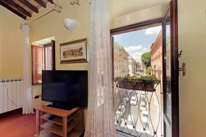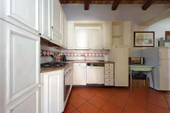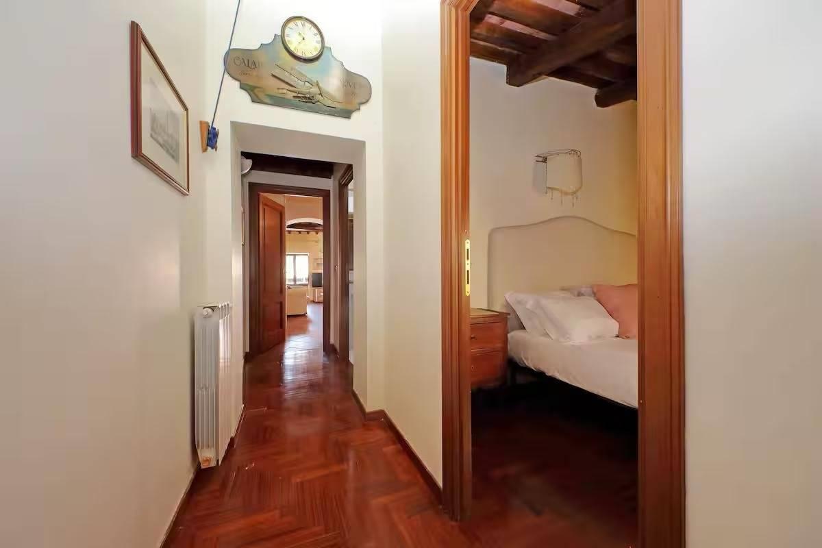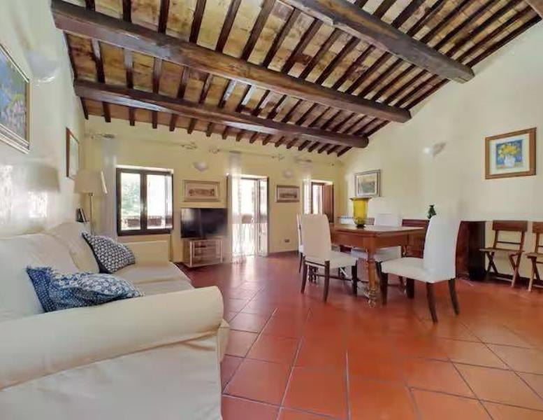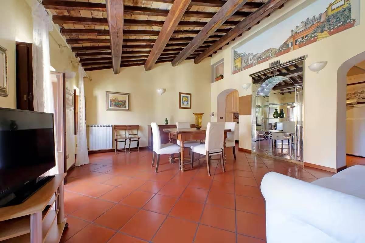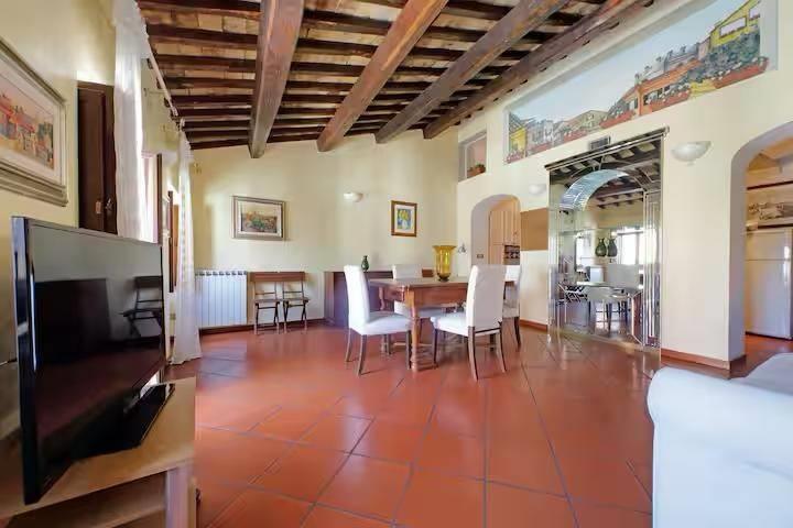 Il soggiorno è impreziosito da tre ampie finestre affacciate su Via dell’Oca, che garantiscono una splendida luminosità naturale durante tutta la giornata e una piacevole vista sui palazzi storici circostanti.
