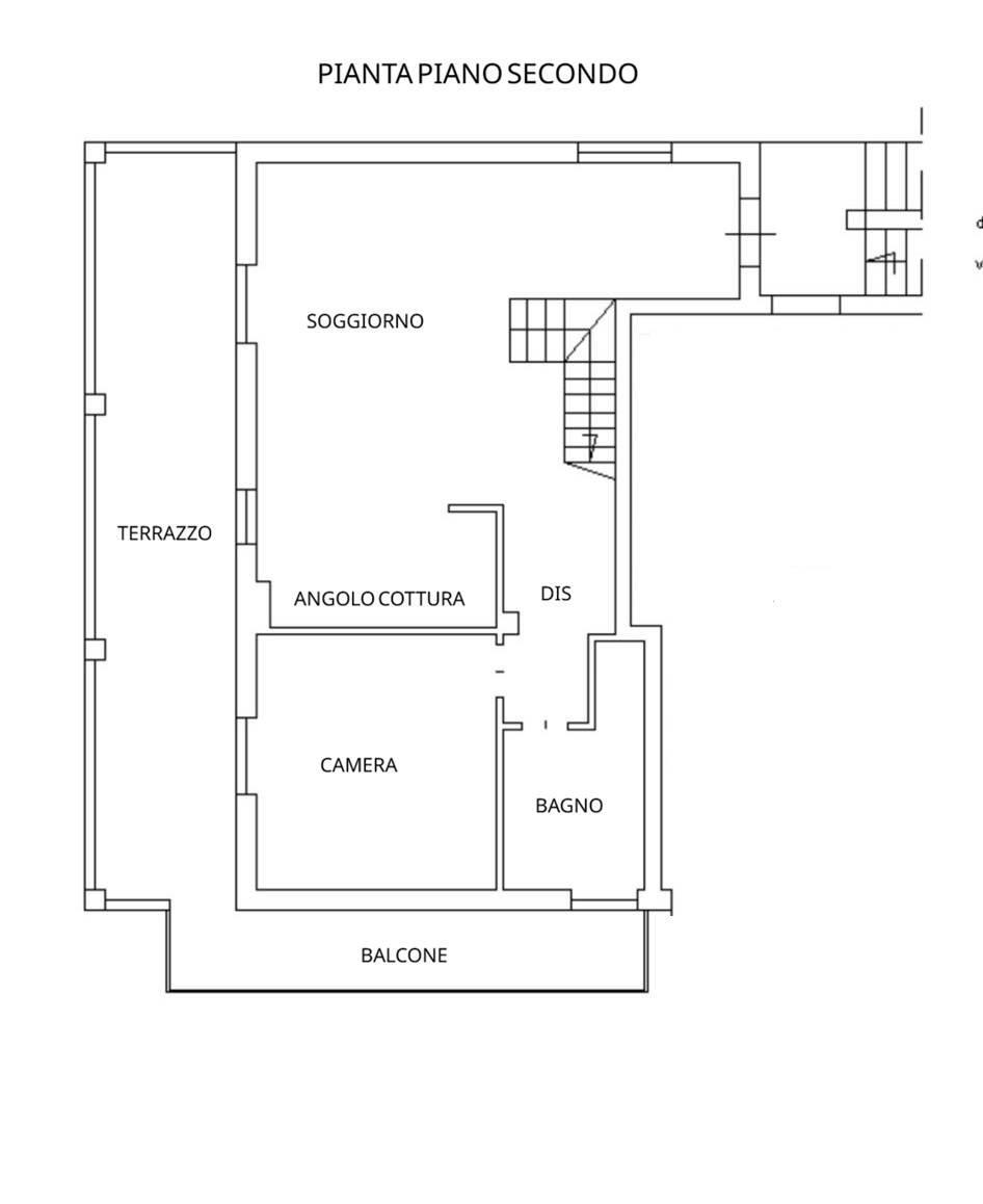L'appartamento al primo livello è composto da un ingresso, un ampio salone con camino e cucina a vista, facilmente ripristinabile in cucina abitabile. Sullo stesso piano si trovano una camera matrimoniale e un bagno finestrato. Tutti gli ambienti affacciano direttamente su un terrazzo vivibile, ideale per pranzi e cene all'aperto. Una scala interna collega il piano principale al livello superiore, piano servizi, dove sono presenti una seconda camera matrimoniale con accesso a un balcone, una cameretta e un secondo bagno, anch'esso dotato di finestra. La proprietà comprende inoltre un posto auto, elemento particolarmente prezioso data la centralità della zona.