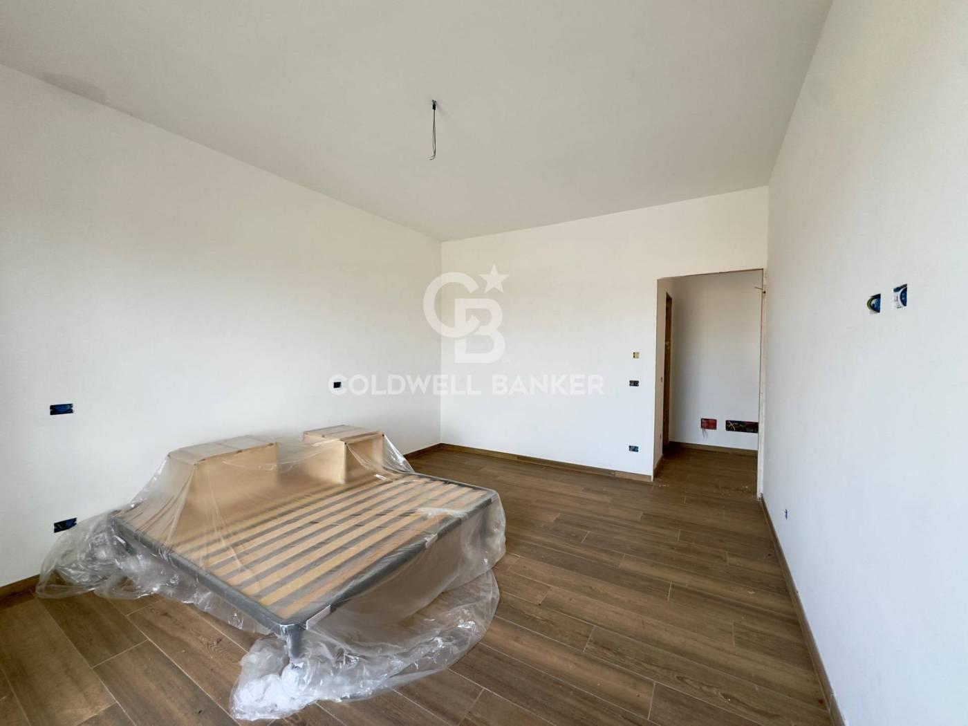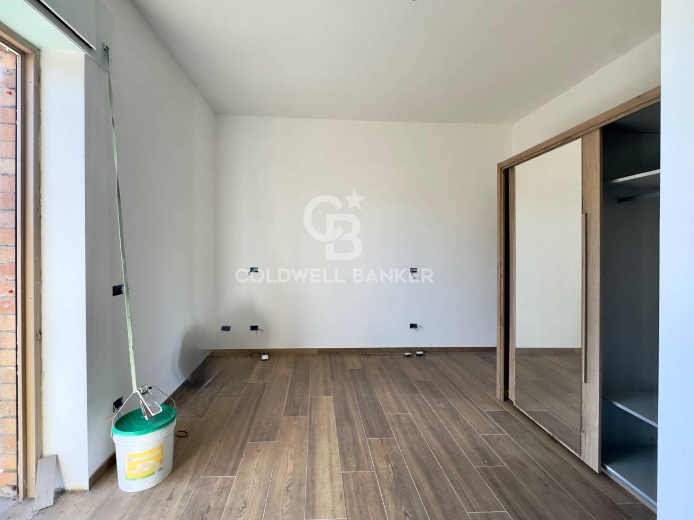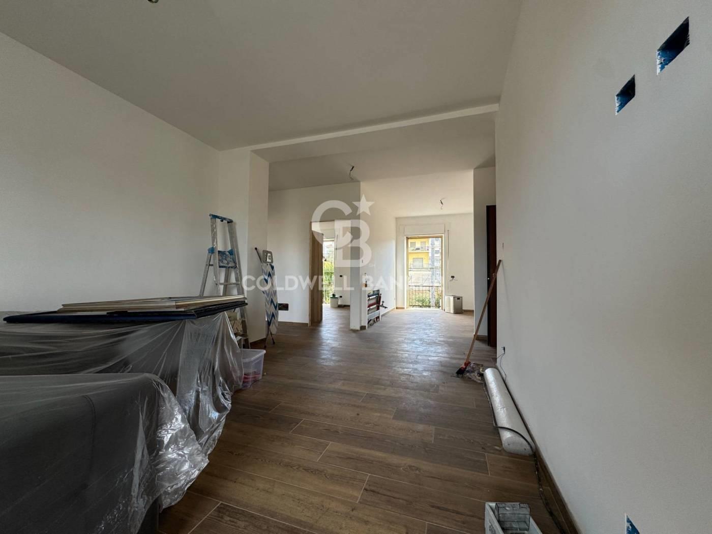 L'appartamento è composto da un ampio salone con cucina a vista, disimpegno, bagno con finestra e due camere matrimoniali, una delle quali dotata di servizio privato. Tutti gli ambienti, ad eccezione dei bagni, dispongono di accesso diretto ai balconi. La proprietà include inoltre un box auto doppio situato nella corte esterna comune, all'interno della quale è possibile parcheggiare un'ulteriore vettura.