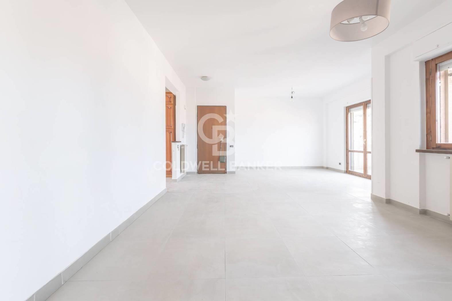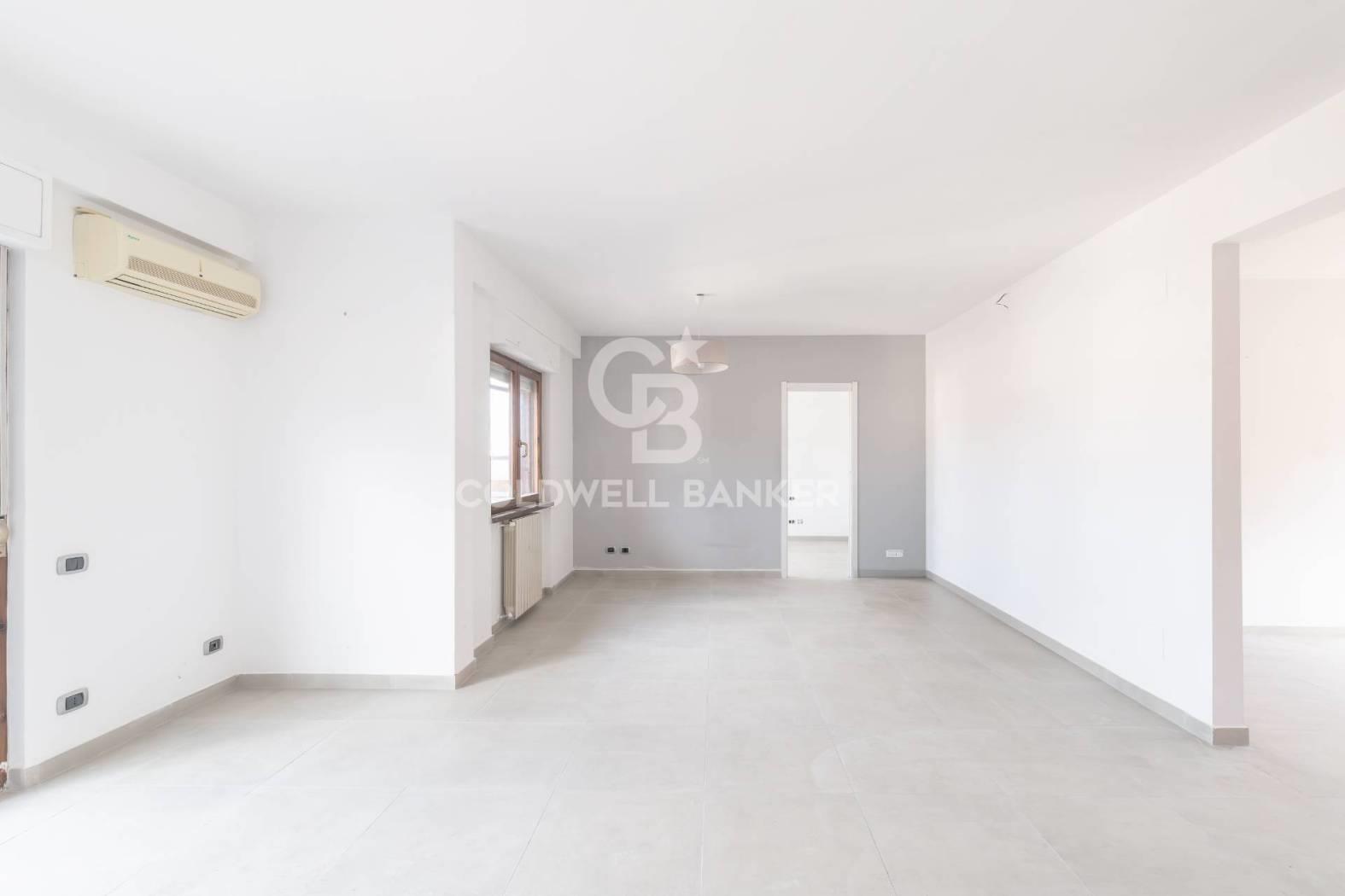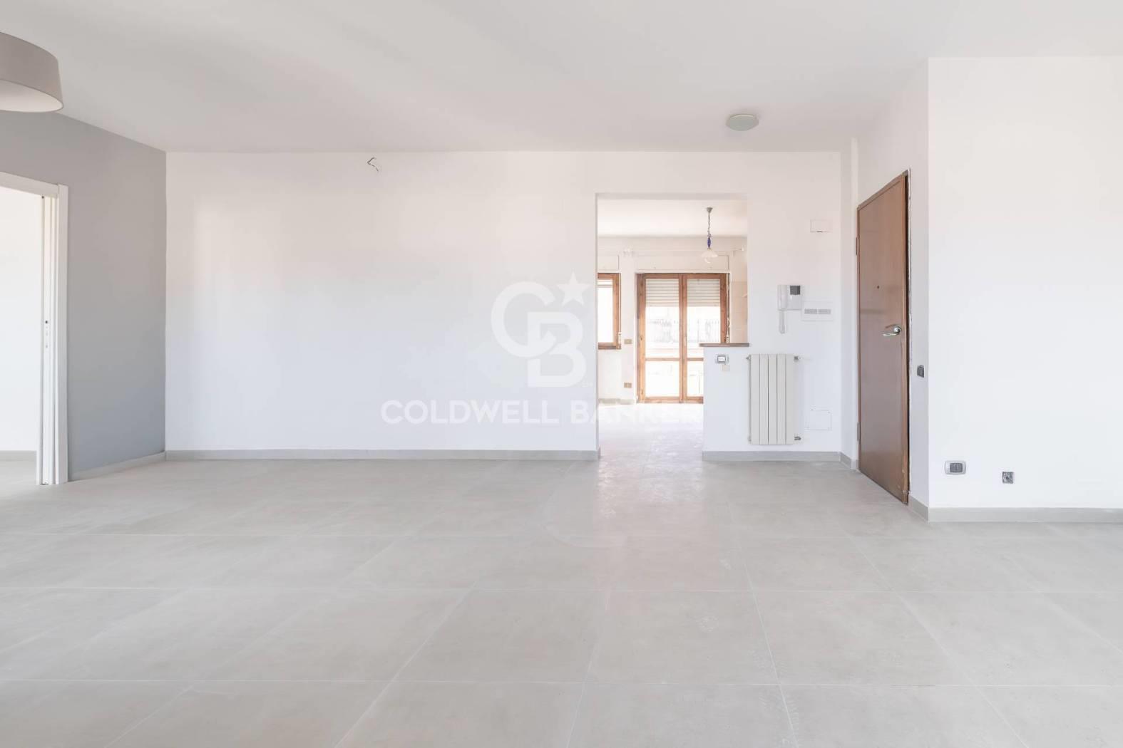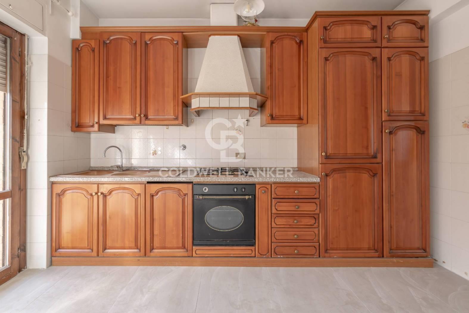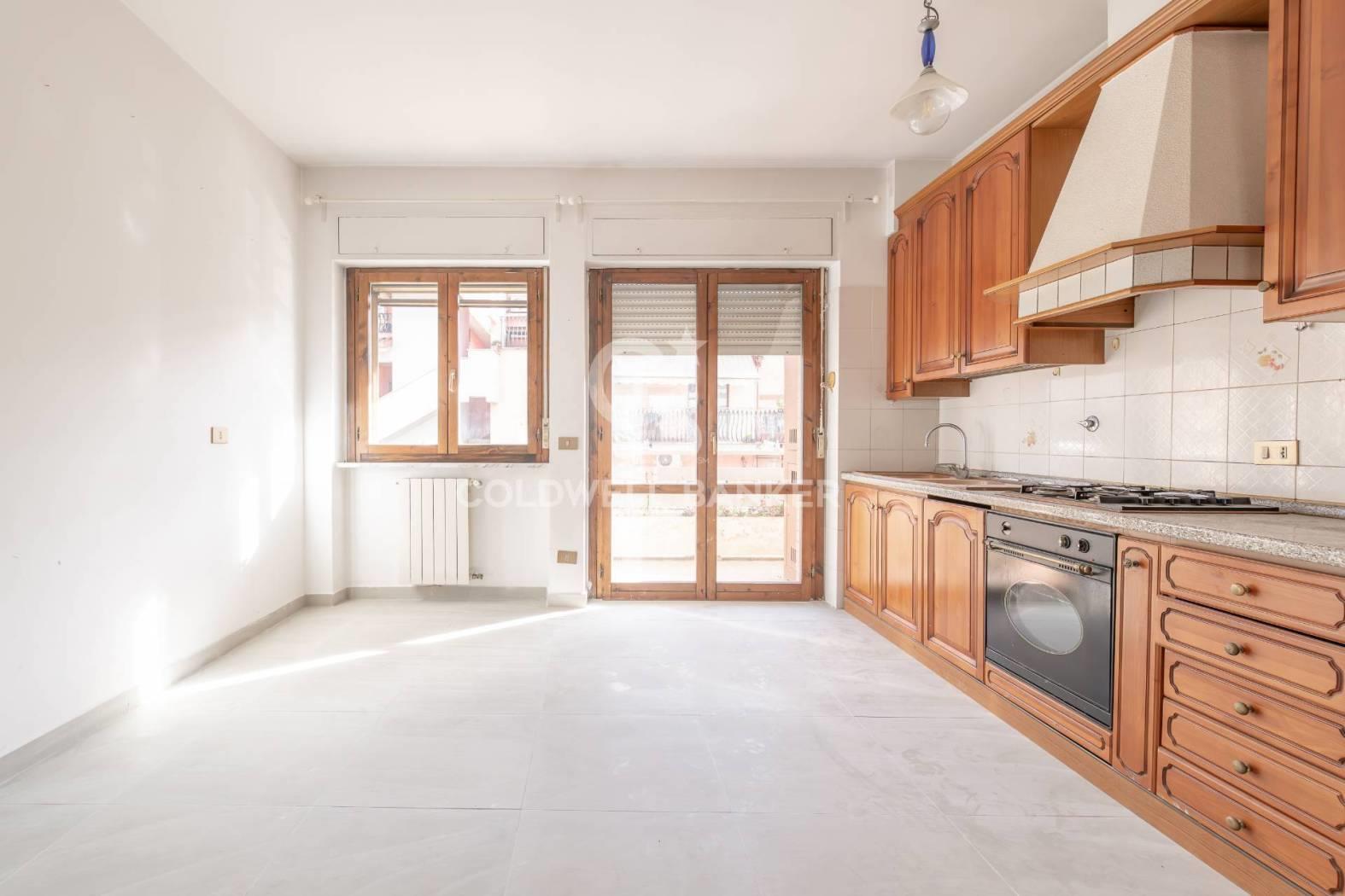 L'appartamento è composto da un ampio salone con accesso diretto al terrazzo, una cucina abitabile collegata a un balcone, due camere da letto e un bagno dotato di doccia e finestra. La generosa metratura consente di rimodulare gli ambienti e di realizzare, qualora lo si desideri, una terza camera da letto e un secondo bagno.