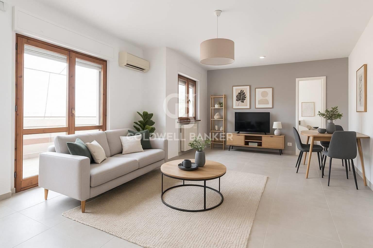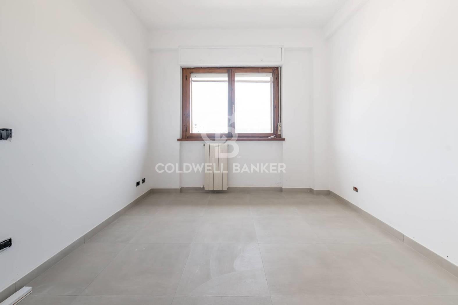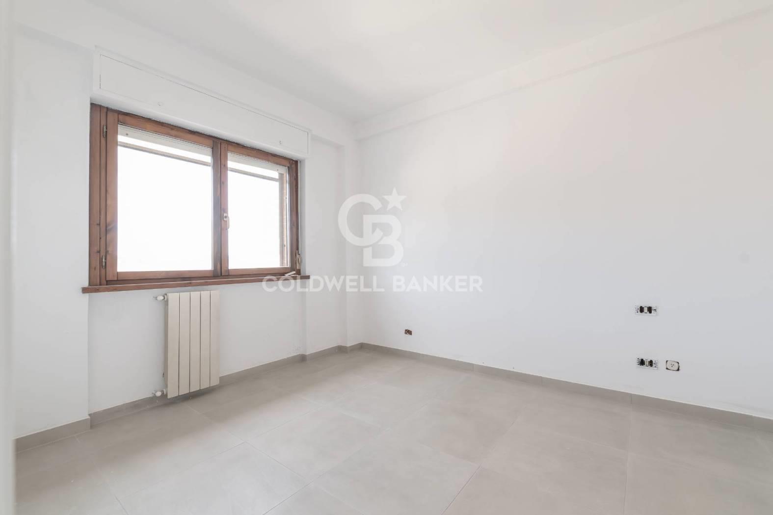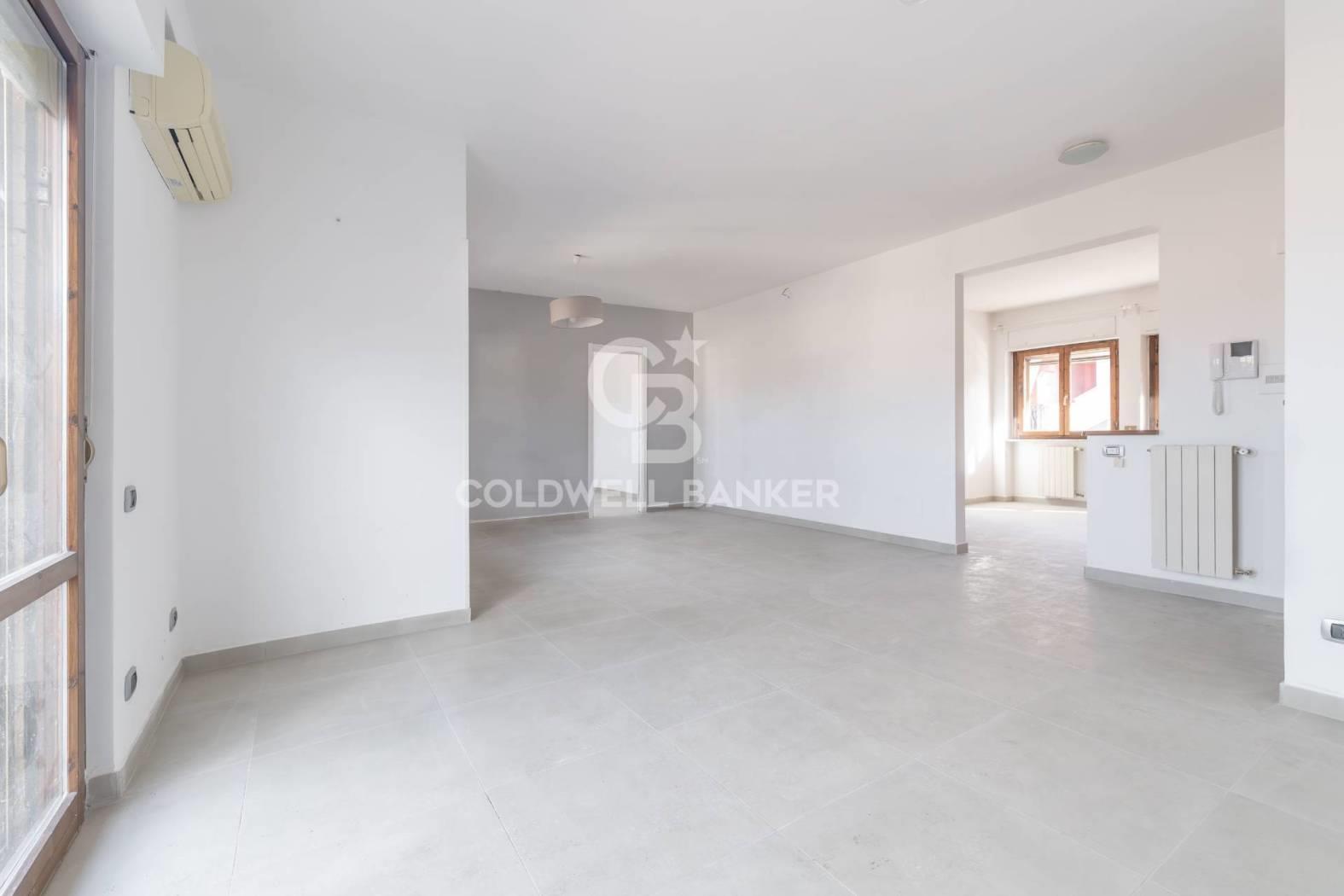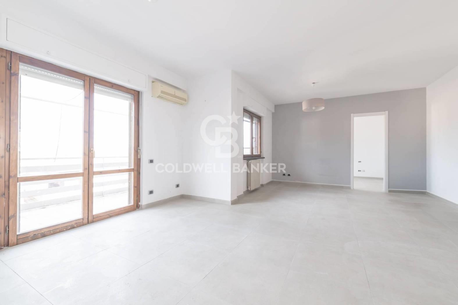 L'appartamento è composto da un ampio salone con accesso diretto al terrazzo, una cucina abitabile collegata a un balcone, due camere da letto e un bagno dotato di doccia e finestra. La generosa metratura consente di rimodulare gli ambienti e di realizzare, qualora lo si desideri, una terza camera da letto e un secondo bagno.