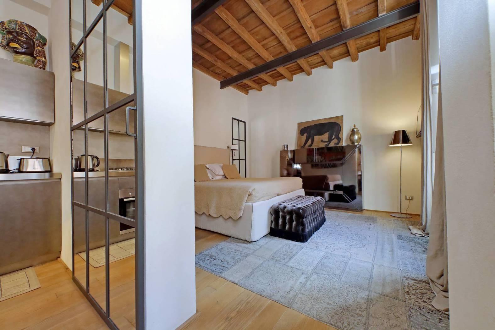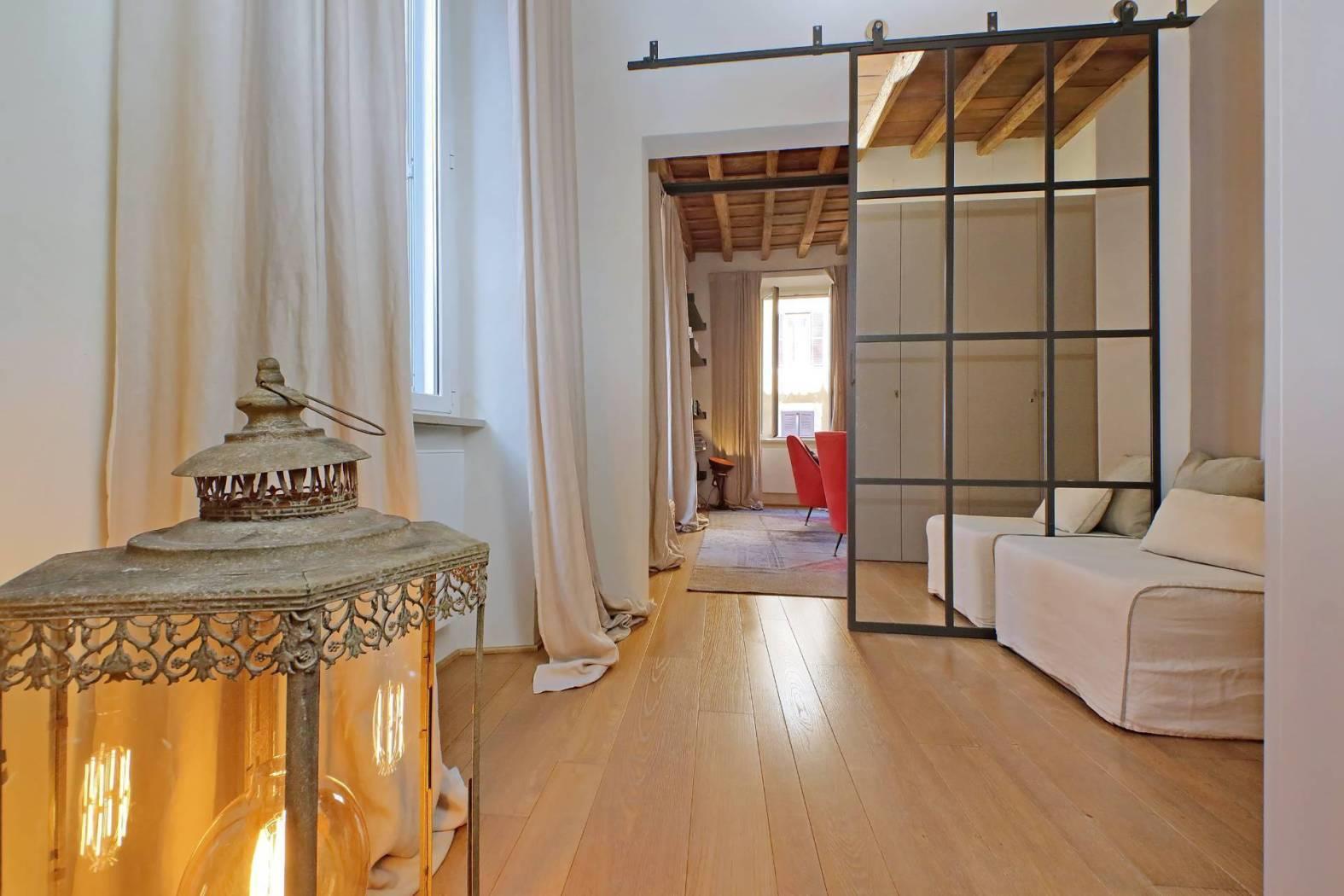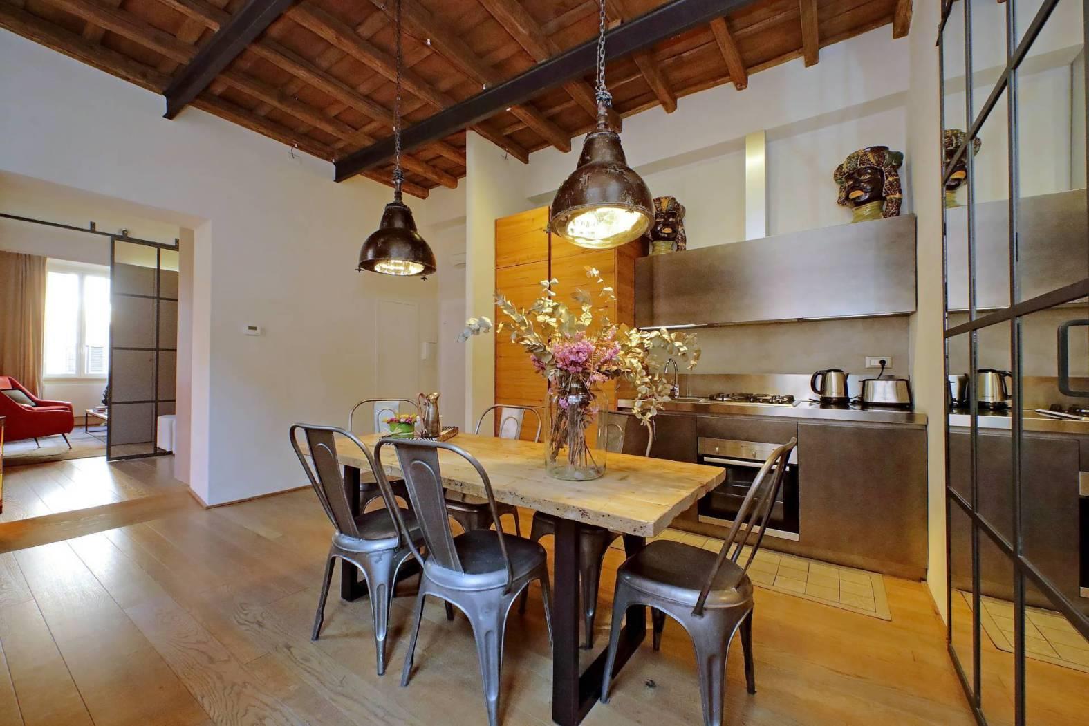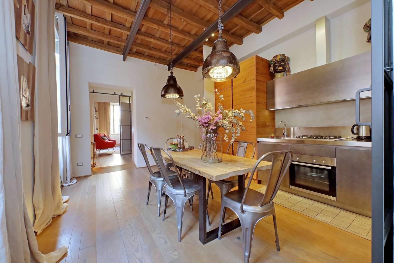 L'immobile, finemente ristrutturato e completamente arredato, vanta soffitti a cassettoni, pavimenti in parquet e un design elegante che unisce charme storico e comfort moderno.
