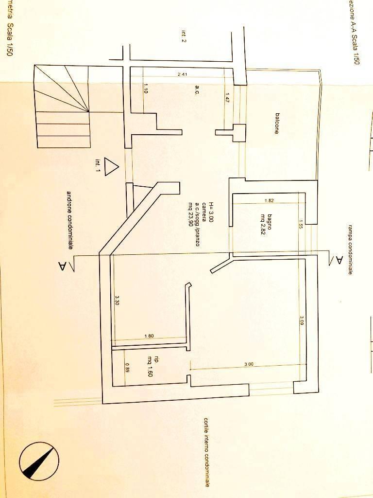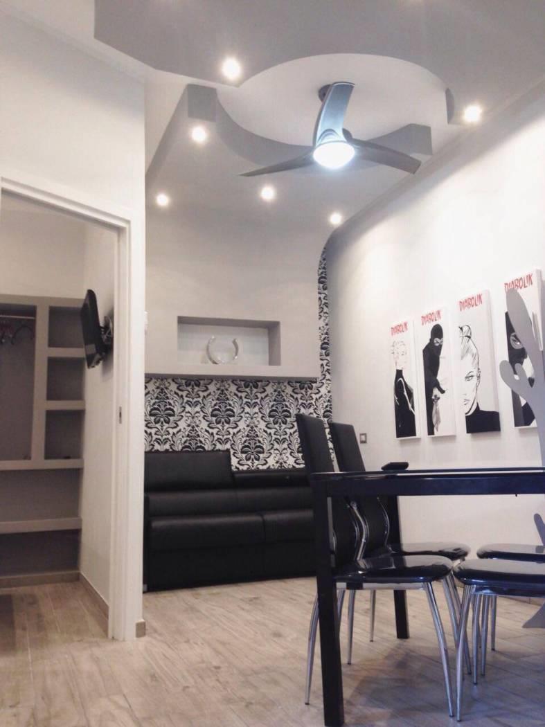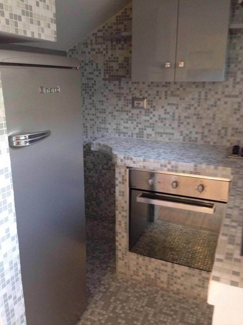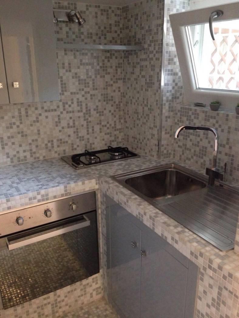 Dall'ingresso, a sinistra si accede all'angolo cottura integrato (piano cottura 4 fuochi), rivestito in mosaico e con finestra; l'area living ha un tavolo con 2 sedie, un divano letto ed un televisore. Da qui si accede al bagno con doccia e finestra e alla camera da letto, dotata di cabina armadio e anche essa finestrata.