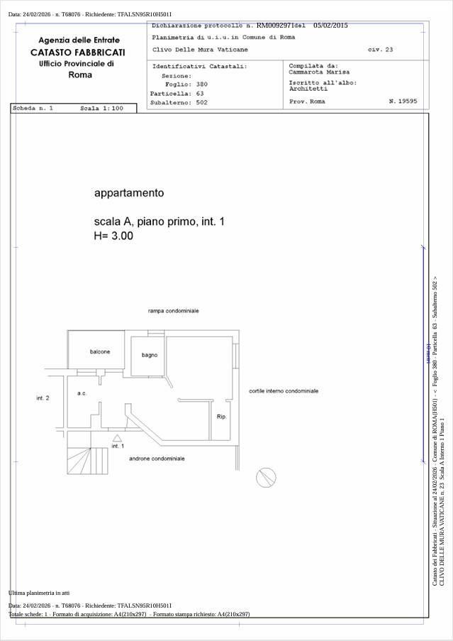 L'immobile si trova in una via silenziosa con accesso da Via Angelo Emo e che termina con una pittoresca gradinata, caratteristica per le vie di quest'area che portano ad affacciarsi sulle Mura Vaticane di Viale Vaticano. L'appartamento appartiene ad una palazzina di tre piani con una gradevolissima entrata, ed è situato al piano rialzato. Ha in dotazione un terrazzino con tavolino e sedie che dà sulla strada (che non avendo collegamento carrabile ma una scalinata all'altro capo, è tranquilla come una strada privata).