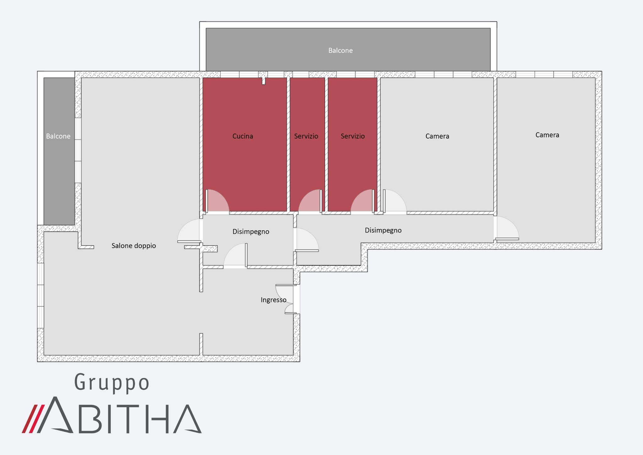 L'immobile è composto da un ampio ingresso, un salone doppio con uscita sul primo balcone, 2 camere da letto matrimoniali, cucina abitabile con uscita sul secondo balcone, doppi servizi, due armadi a muro nel disimpegno della zona notte.