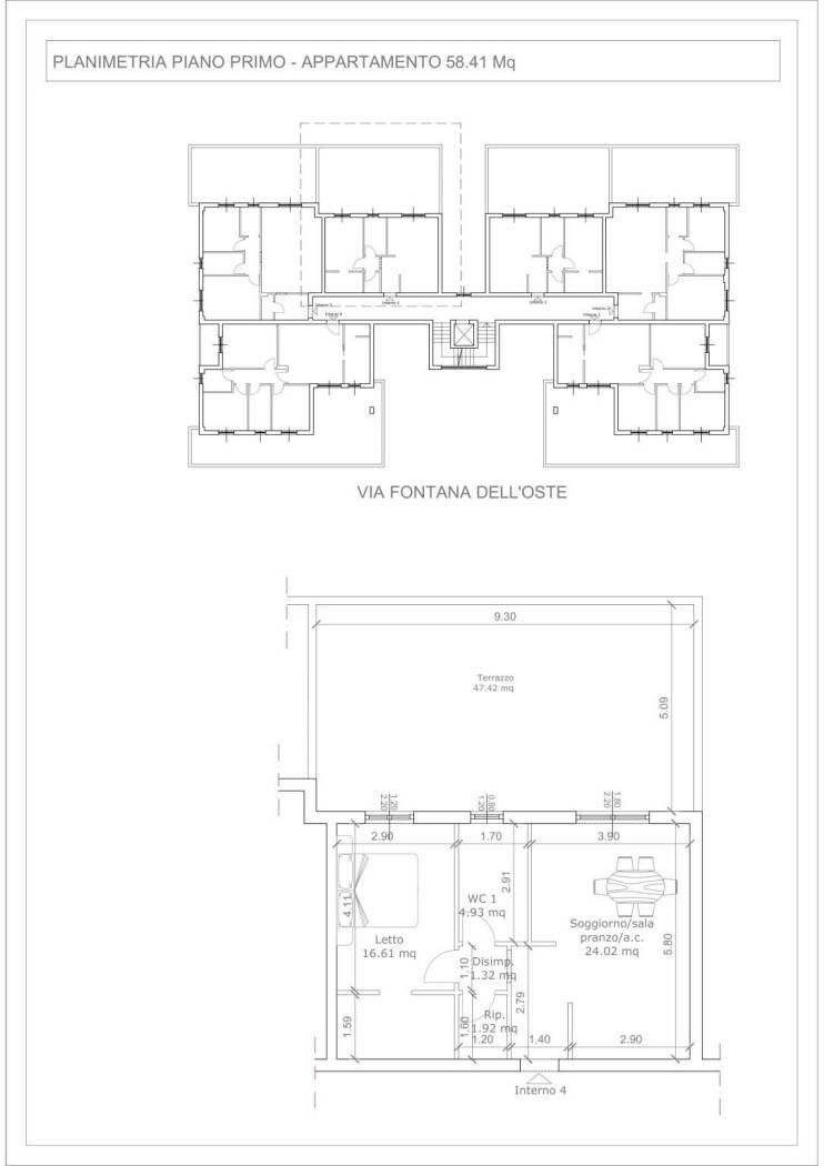 Appartamento al primo piano, 60 mq, una camera da letto, bagno e soggiorno con angolo cottura. Incluso il box auto ed un ampio terrazzo.