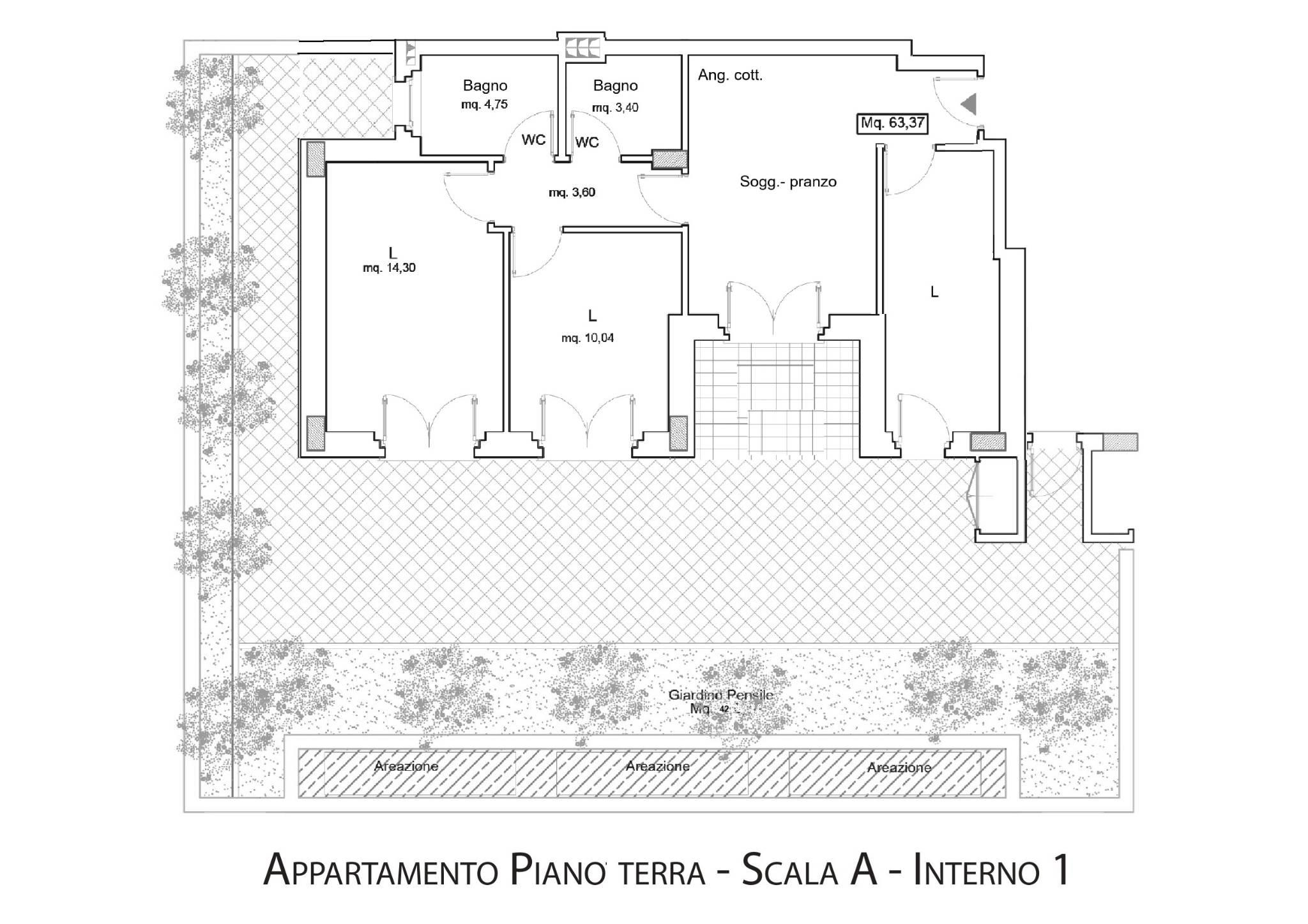 Splendido appartamento angolare di circa 80 mq interni, al piano terra, personalizzabile internamente, composto da soggiorno con angolo cottura, 3 camere da letto, due bagni, portico e terrazza di circa 63 mq, giardino privato di circa 42 mq, cantina e posto auto in garage compresi.