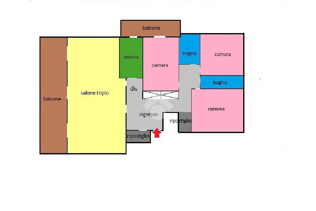Si trova al primo piano di un palazzo in cortina di 5 ed è così composto: Ingresso, cucina abitabile, triplo salone, tre ampie camere da letto, due bagni, due comodi ripostigli e per finire due balconi di cui uno abitabile.